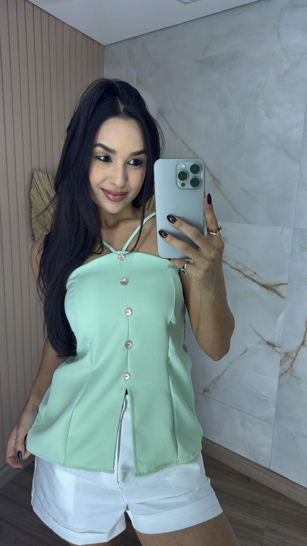 Descrição: Elegante, moderna e cheia de charme, essa blusa é aquele tipo de peça que transforma qualquer look com praticidade e sofisticação. Confeccionada em tecido alfaiataria de alta qualidade, ela entrega um caimento impecável que valoriza a silhueta. Possui bojo interno, garantindo mais segurança, além de alças finas com regulagem, que permitem ajuste perfeita ao corpo. O detalhe frontal aberto na barra traz um toque moderno e fashionista, enquanto os botões decorativos dão um ar sofisticado e delicado a peça, sem abrir mão do conforto.