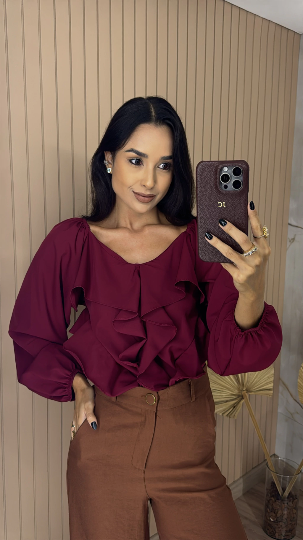 Descrição: A blusa no tecido crepinho possui mangas longas e elástico nos punhos, recorte em V no busto e detalhe em babados na parte da frente.