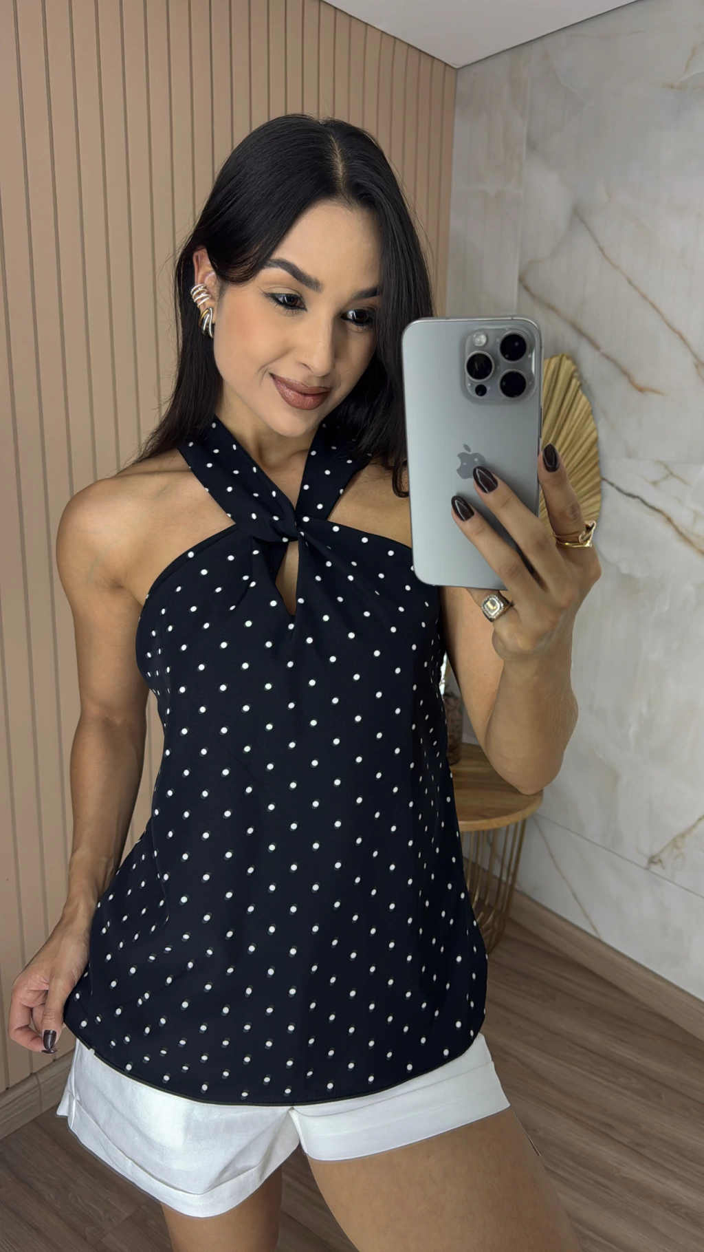 Descrição: Essa blusa é a definição perfeita de um look leve, feminino e elegante. Confeccionada em tecido crepinho, ela oferece toque suave, caimento fluido e muita respirabilidade. Ideal para os dias mais quentes ou para quem ama estar bem vestida, sem abrir mão do conforto. A estampa de poá nunca sai de moda e traz aquele toque retrô romântico que toda mulher ama. Já o grande diferencial da peça é a gola entrelaçada com detalhe de torção, que valoriza os ombros e o colo de forma super charmosa e moderna, perfeita para quem gosta das peças com praticidade.