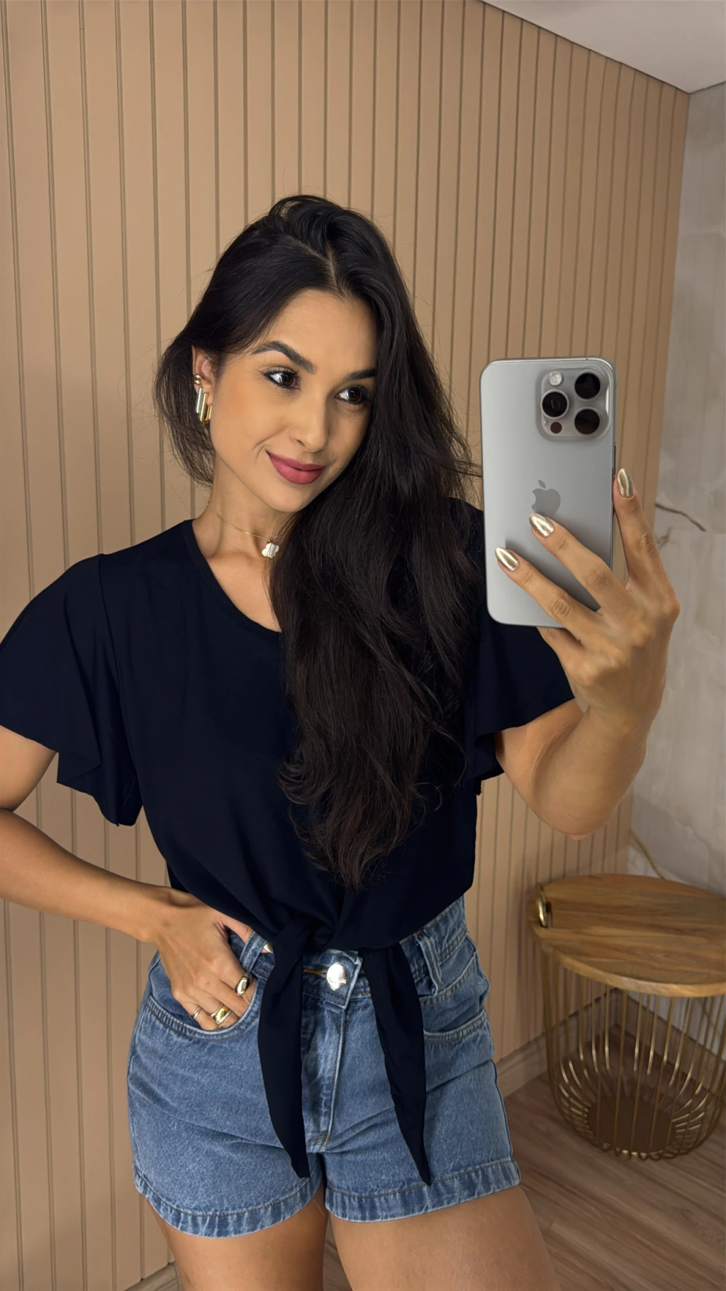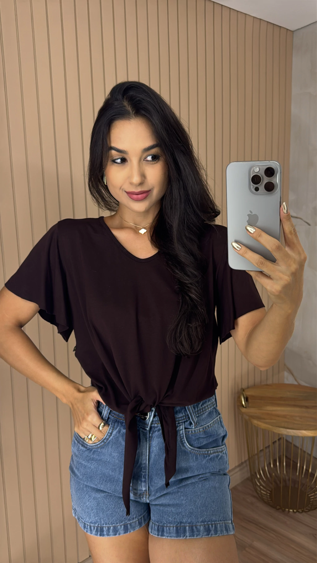 Descrição: A blusa no tecido malha possui mangas e amarração frontal.