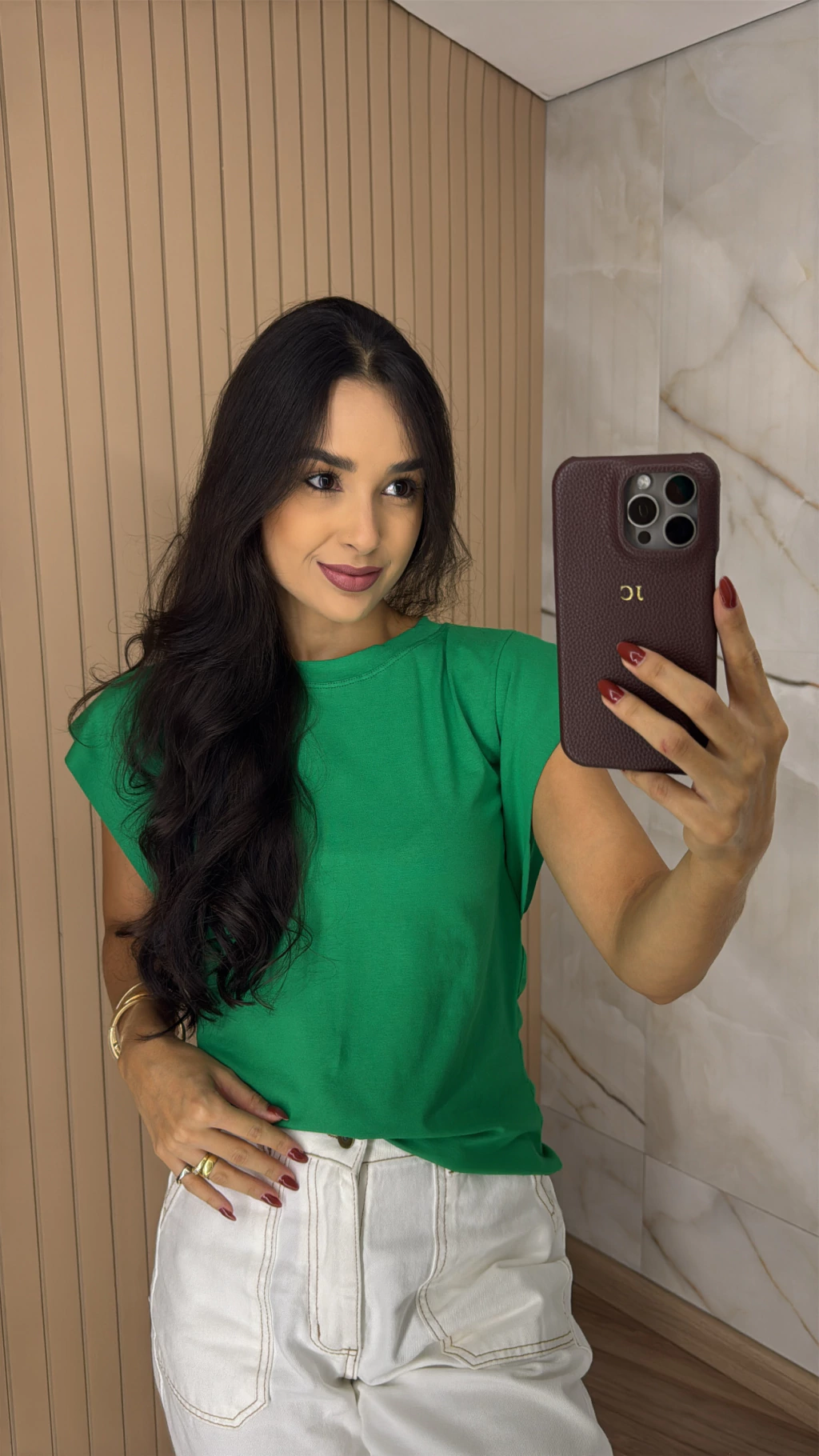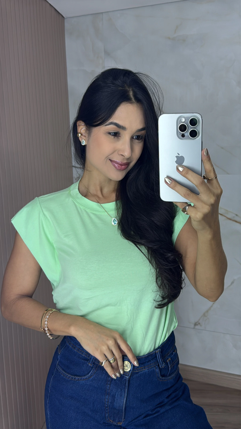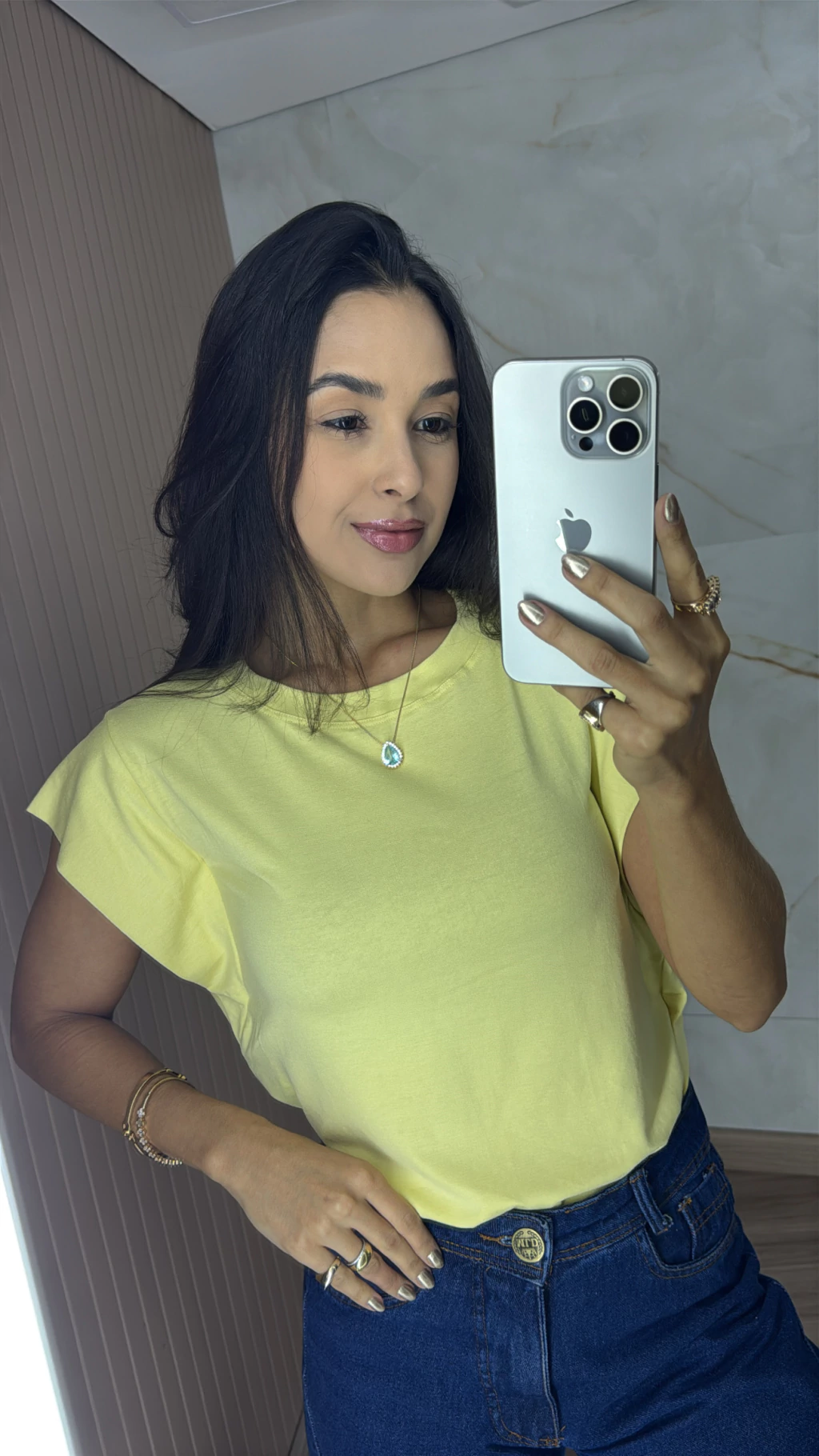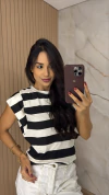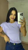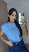 Modelo de blusa em malha, decote arredondado e detalhe manga japonesa.
