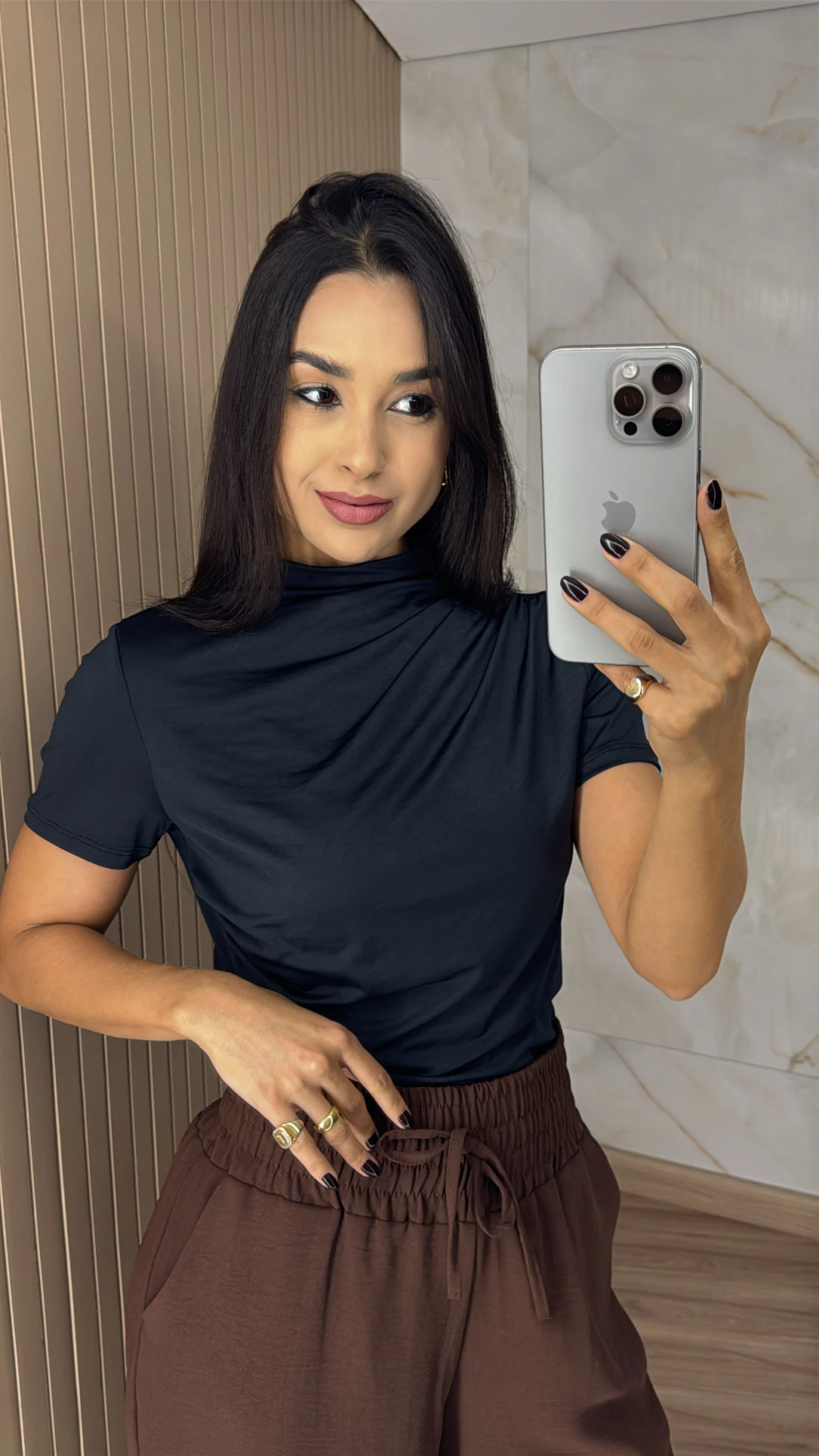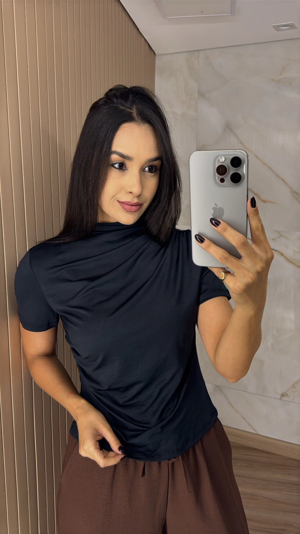Descrição: Feita em tecido poliamida de alta qualidade, essa blusa é perfeita para quem busca praticidade com estilo. O tecido possui toque fresco, é respirável e não amassa. A gola alta traz um ar sofisticado, enquanto as mangas curtas deixam a peça leve e ideal para todas as estações.