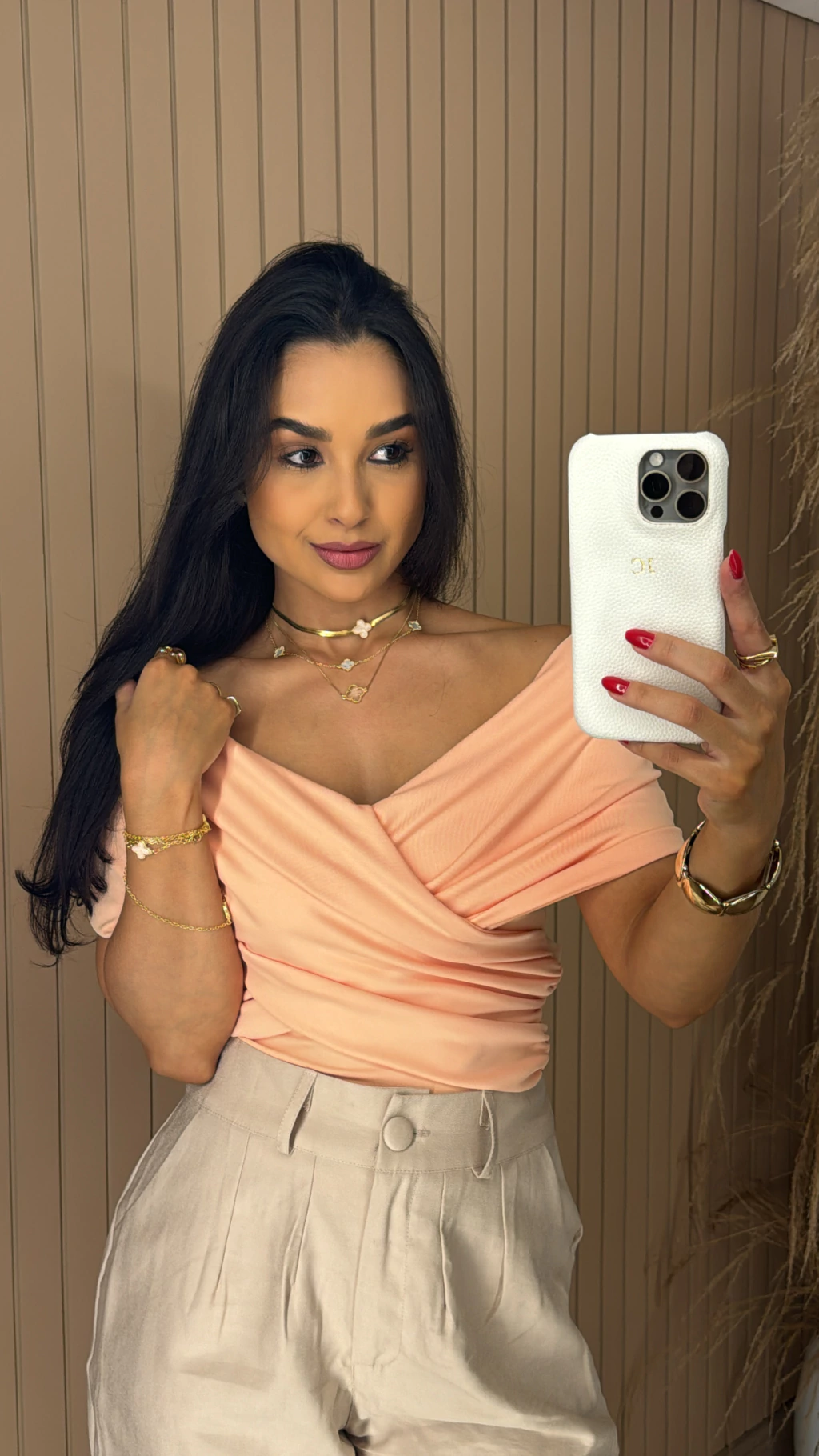 Descrição: a blusa em tecido poliamida é no modelo transpassado, podendo ser usada ombro a ombro.