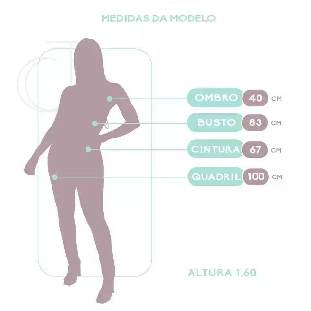 Altura: 1,60m | Peso: 55kg | Ombro: 40cm | Busto: 83cm | Cintura: 67cm | Quadril: 100cm
