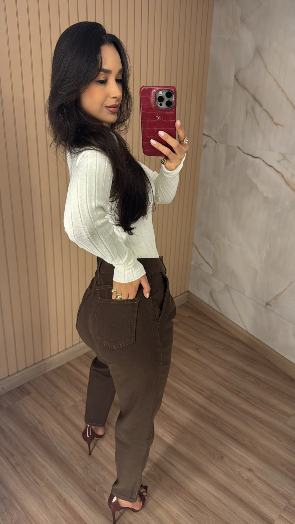 Descrição: A Calça Jeans Mom Marrom é perfeita para quem busca um visual descomplicado, estiloso e cheio de personalidade. Com cintura alta, caimento reto e cor tendência, ela combina o charme vintage, com o conforto que você precisa no dia a dia.
