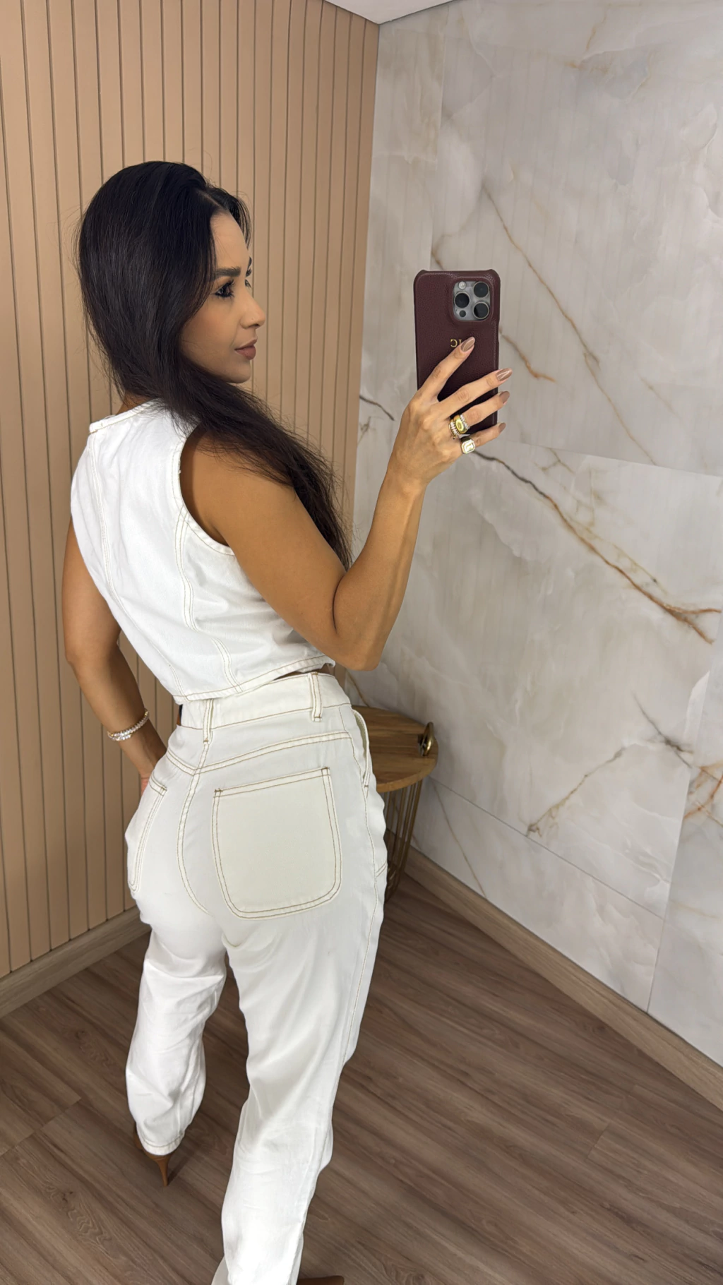 Descrição: A calça no tecido jeans possui o modelo skinny, cós alto, bolsos laterais e fechamento com um botão e zíper.