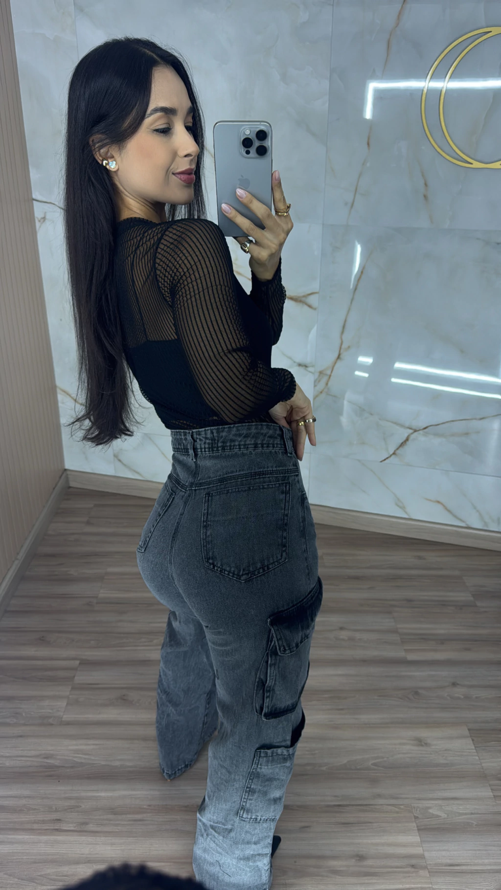 Descrição: A calça jeans wide leg cargo é a escolha perfeita para quem busca um visual moderno, despojado e cheio de personalidade. Com modelagem ampla nas pernas (wide leg) e bolsos utilitários no estilo cargo, ela entrega conforto e versatilidade. A calça possui fechamento com um botão e zíper, bolsos frontais e traseiro e espaço para colocar cinto.