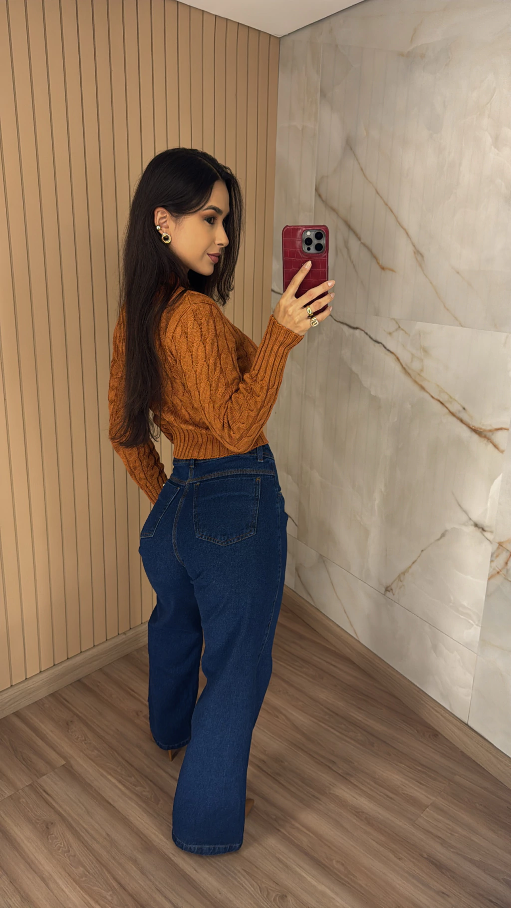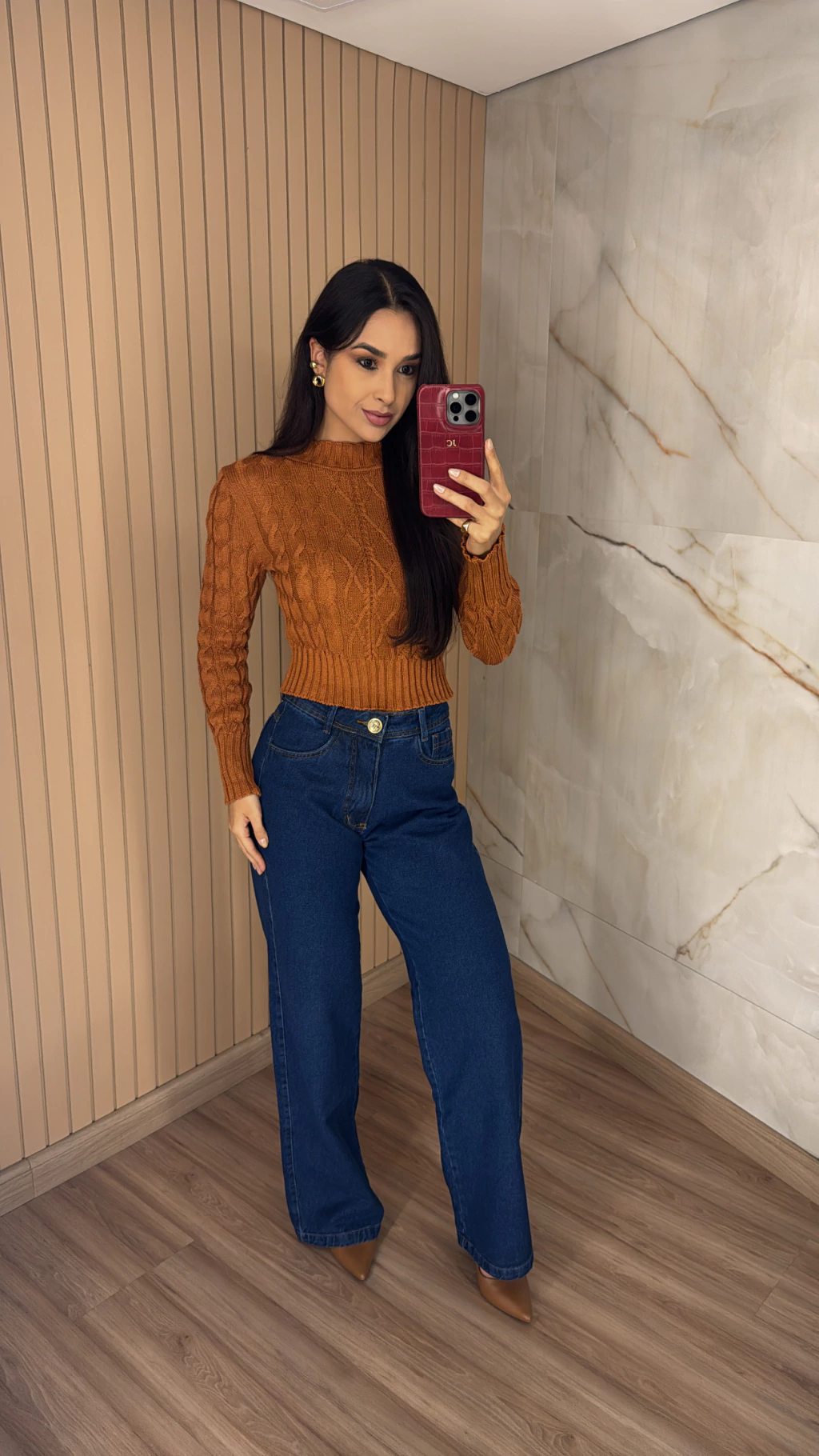 Tecido jeans encorpado com toque confortável: Garante firmeza no corpo sem comprometer a mobilidade.