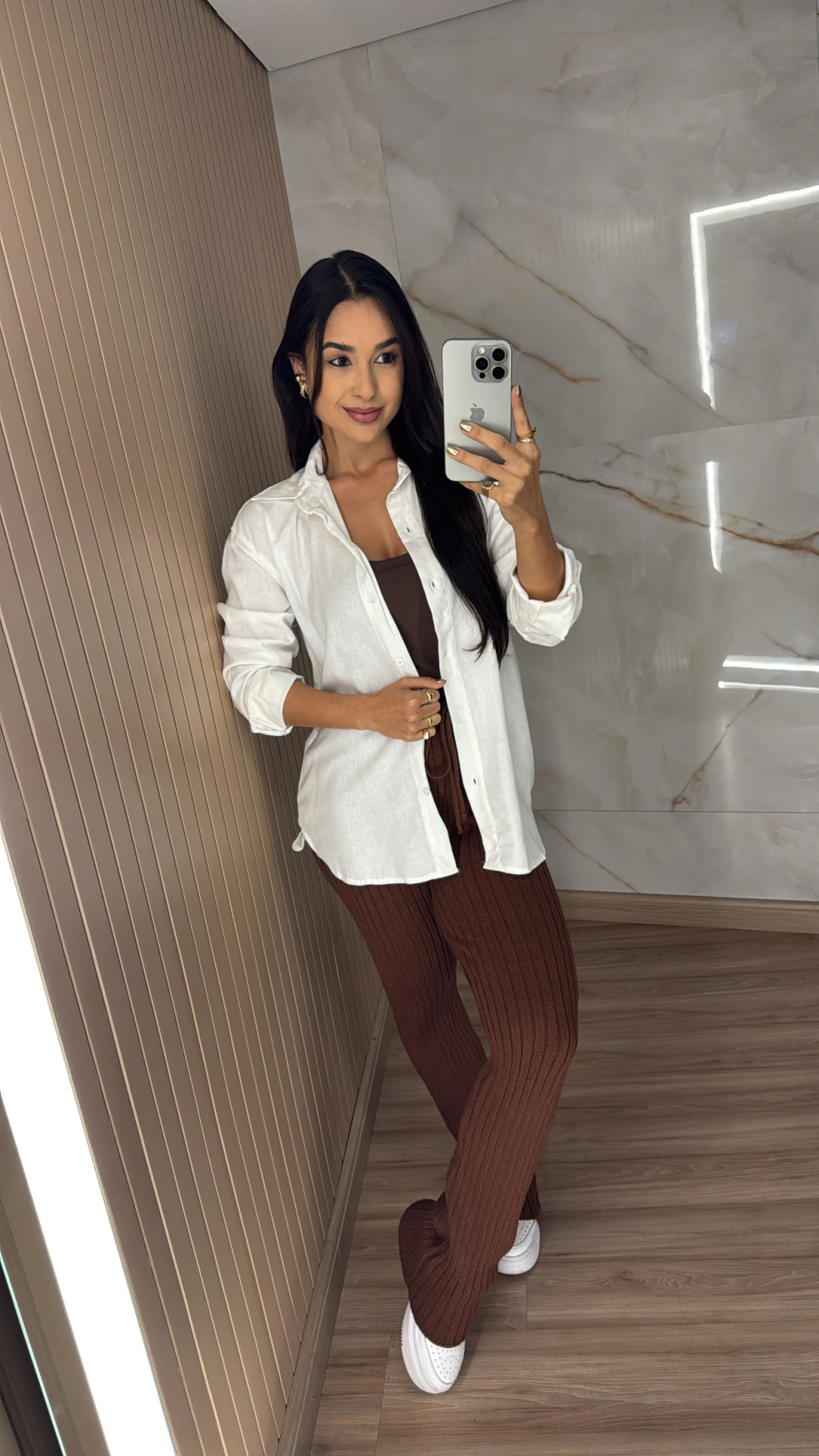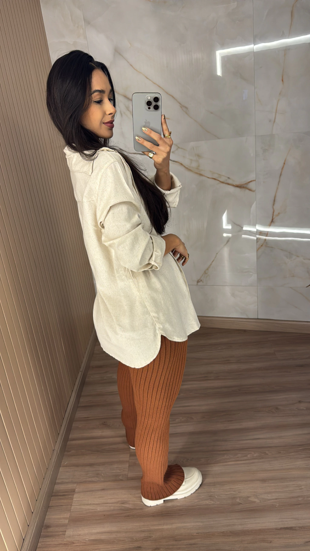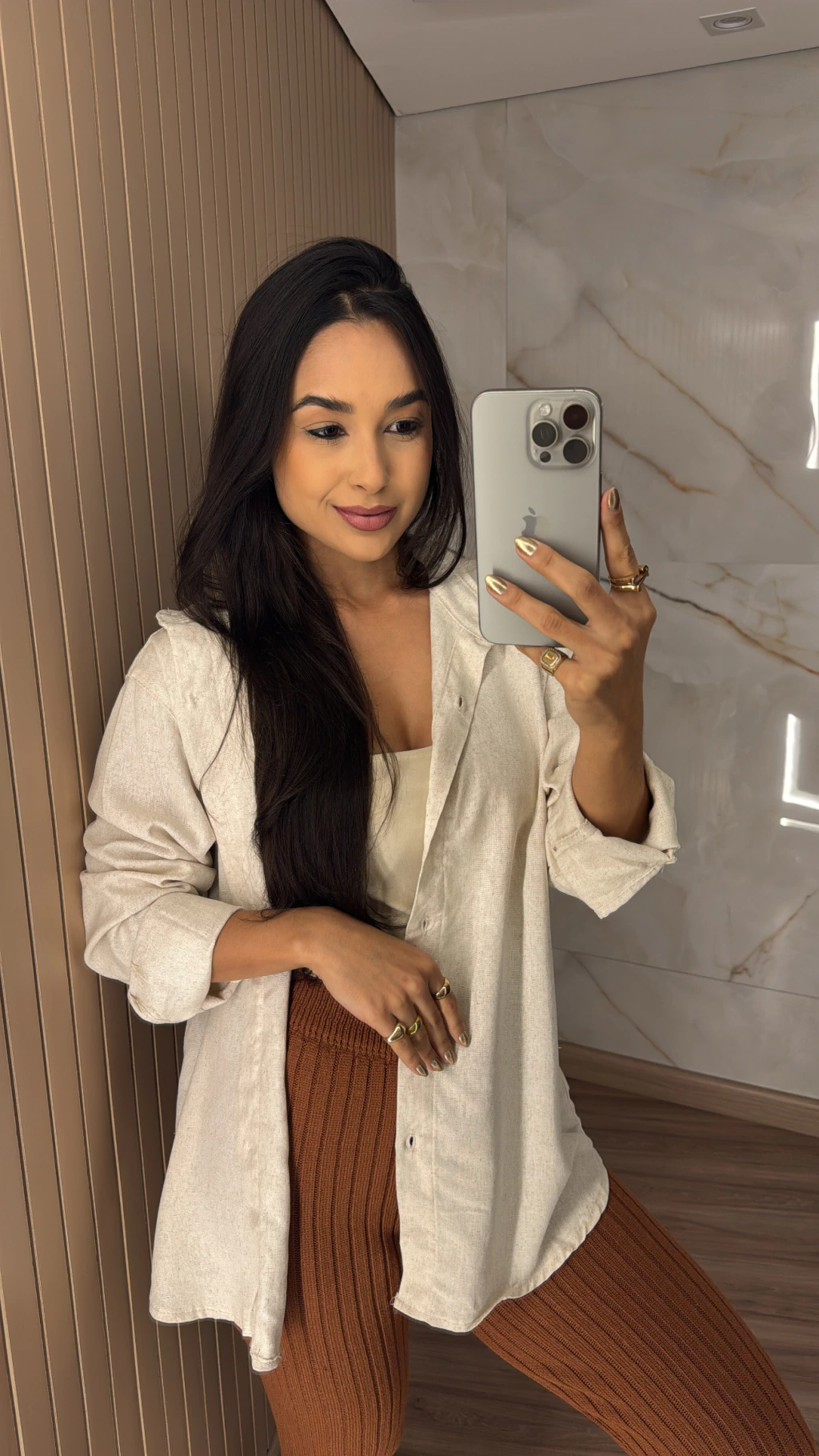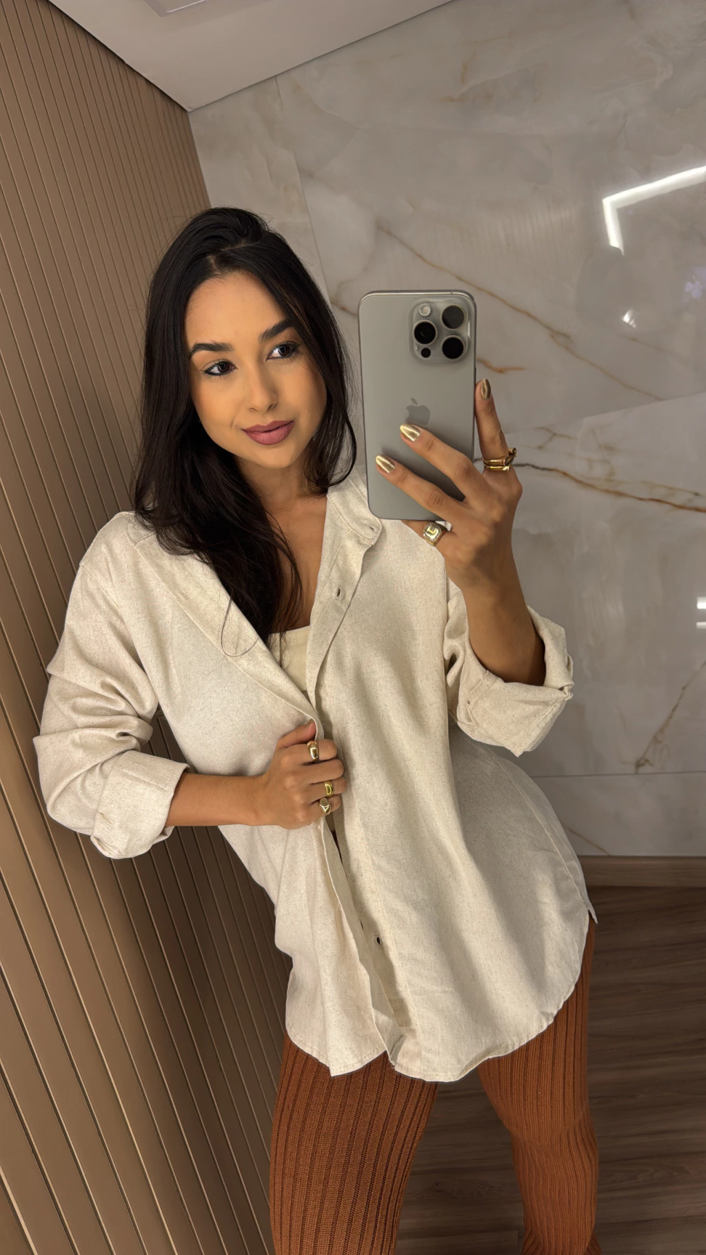Camisa em tecido linho, contém manga longa, fechamento com botões, no comprimento e no punho.