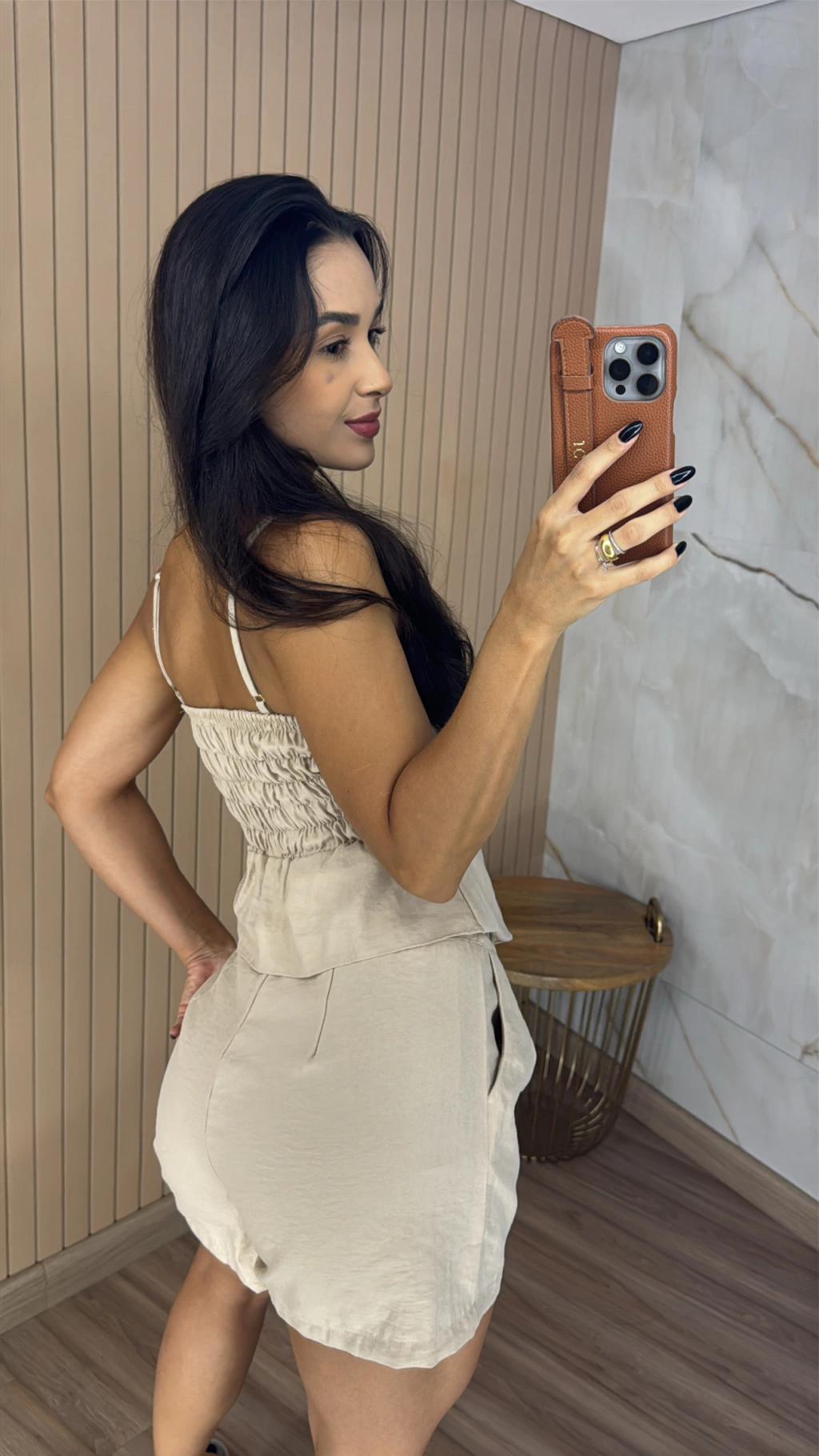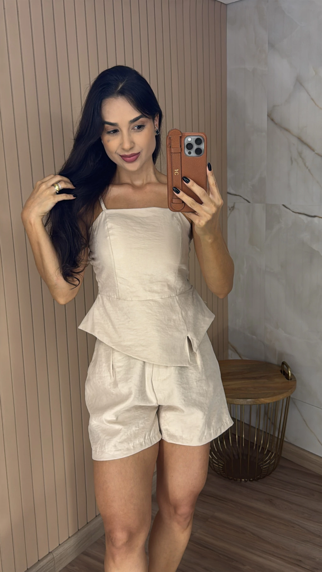 Descrição: O conjunto no tecido alfaiataria é composto por uma blusa com alças finas e reguláveis, bojo lastex nas costas e detalhe em pequena assimetria. O short possui bolsos facas laterais, espaço para cinto, fechamento com um botão na cor da peça e zíper.