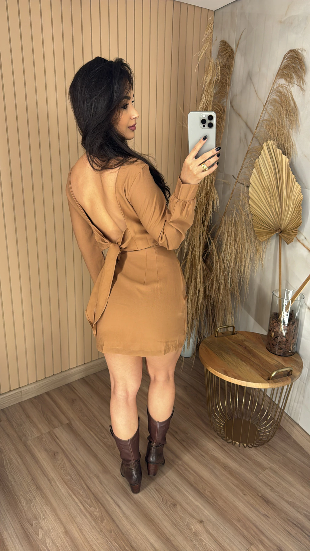 Descrição: o conjunto de alfaiataria é composto por um cropped e um short saia. O cropped possui mangas longas e amarração nas costas. O short saia contém fechamento lateral com zíper.