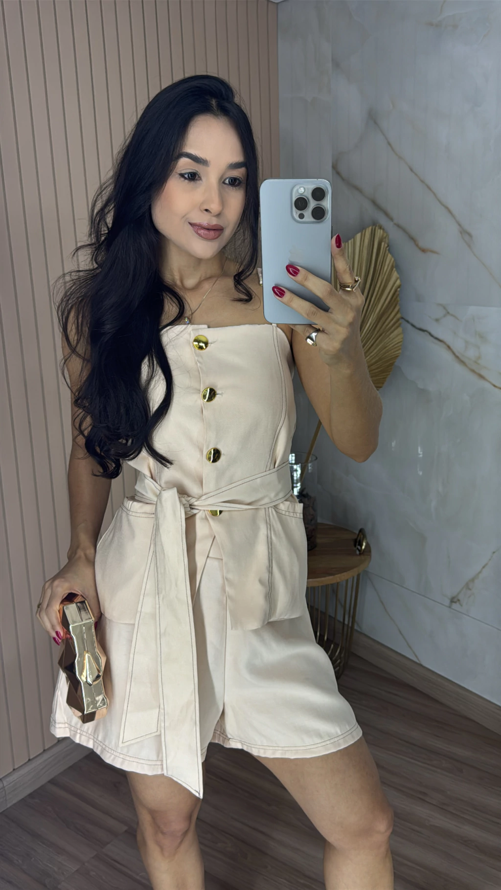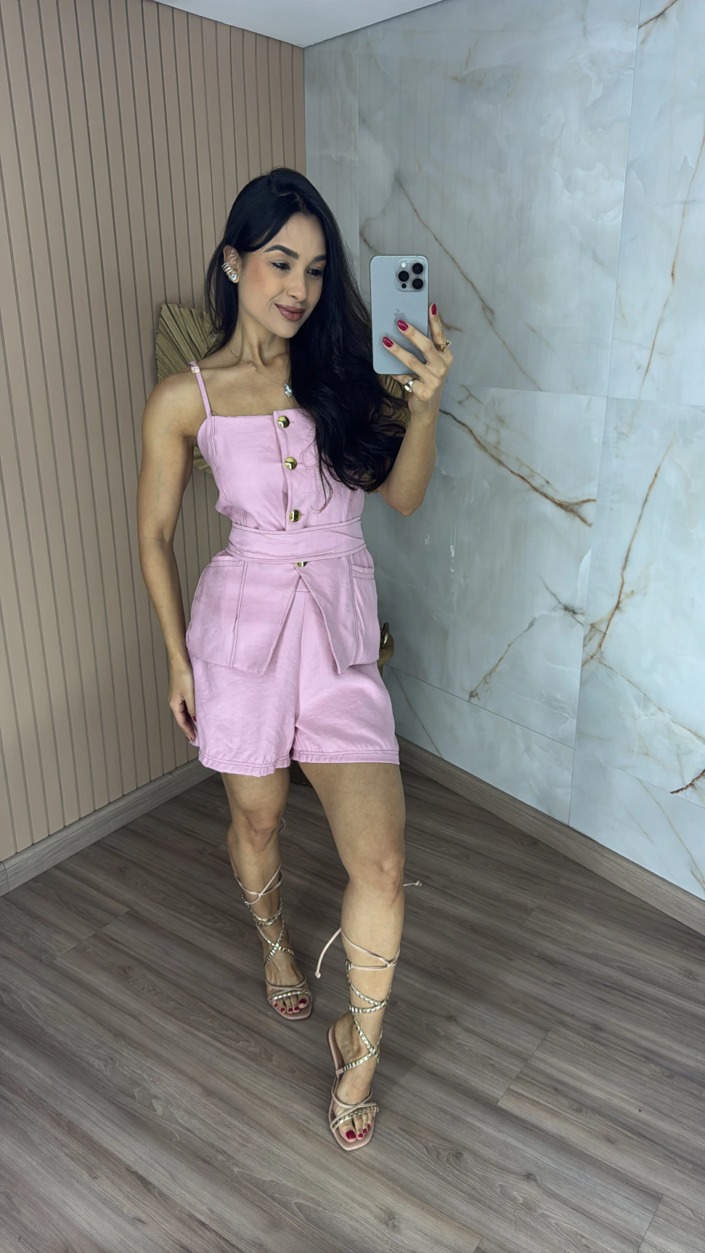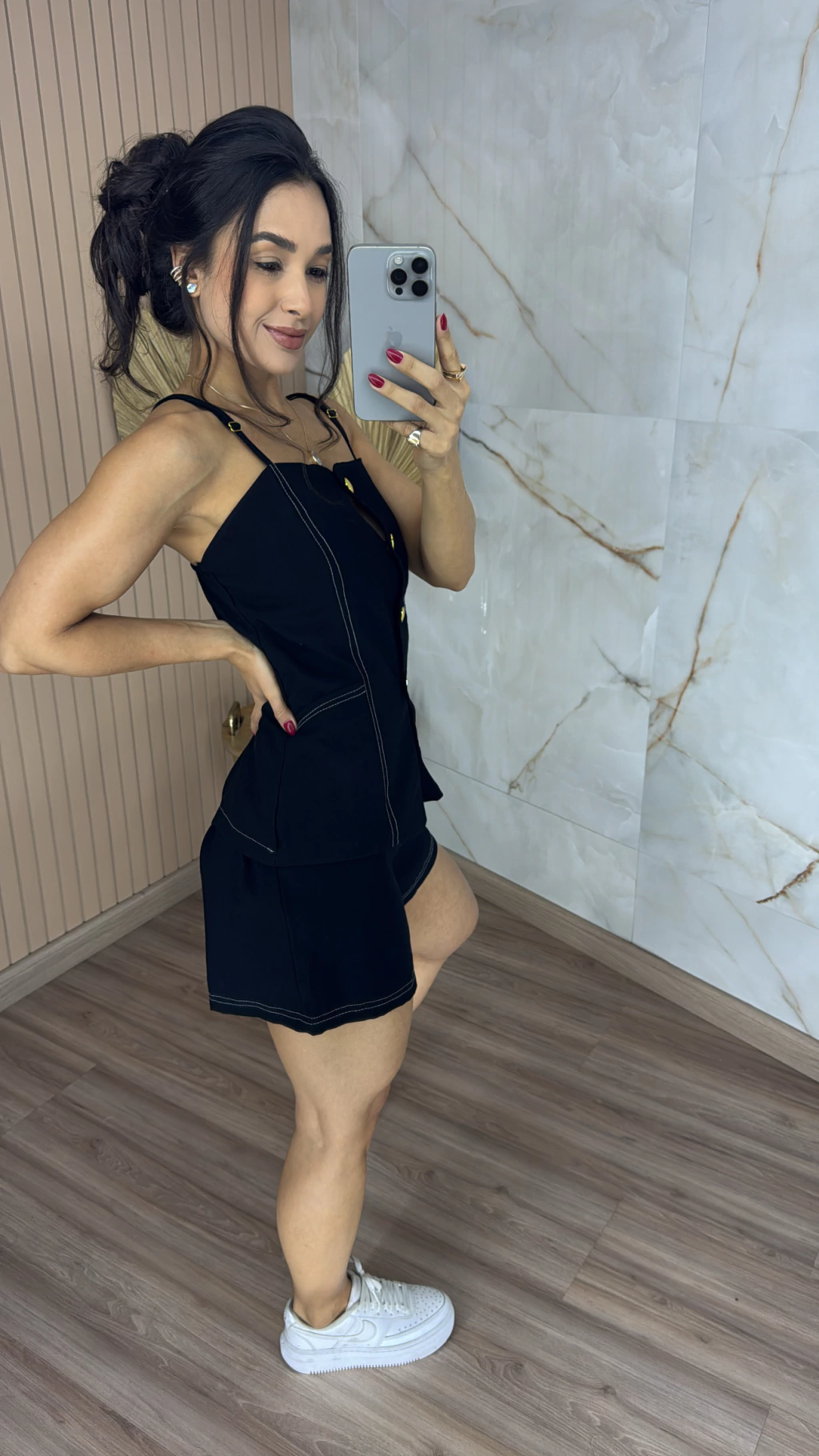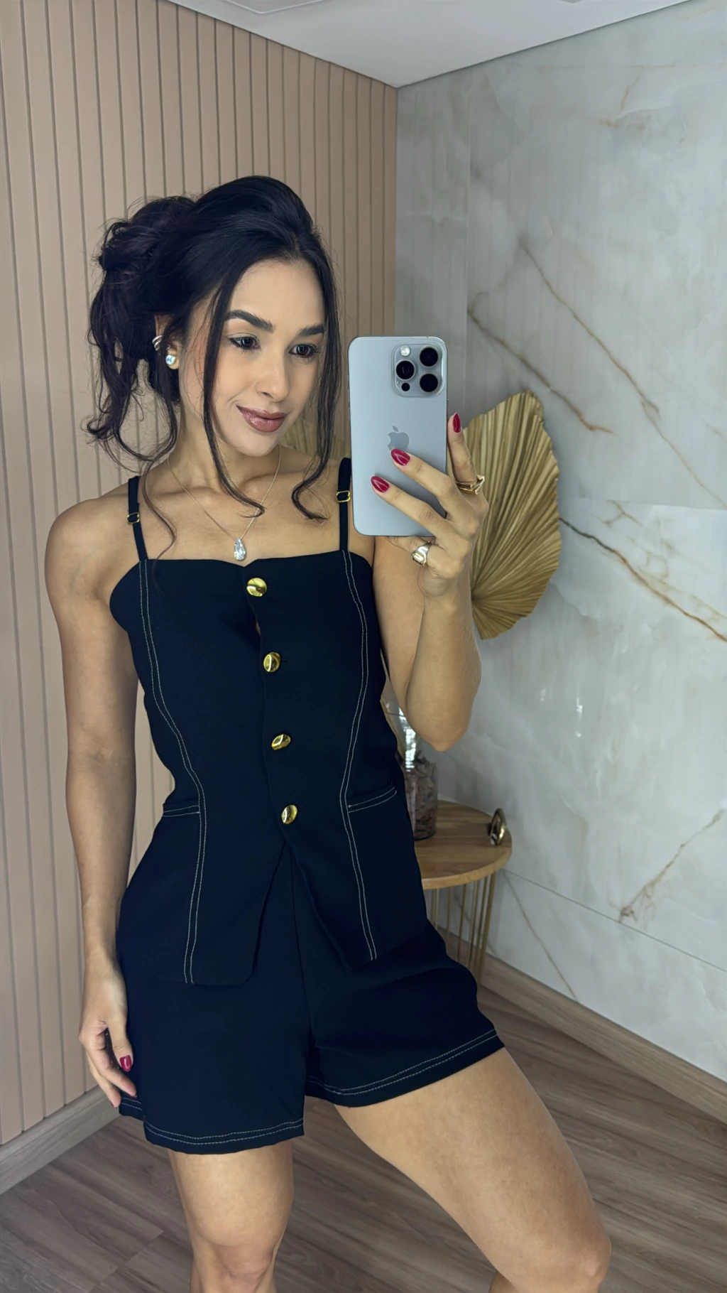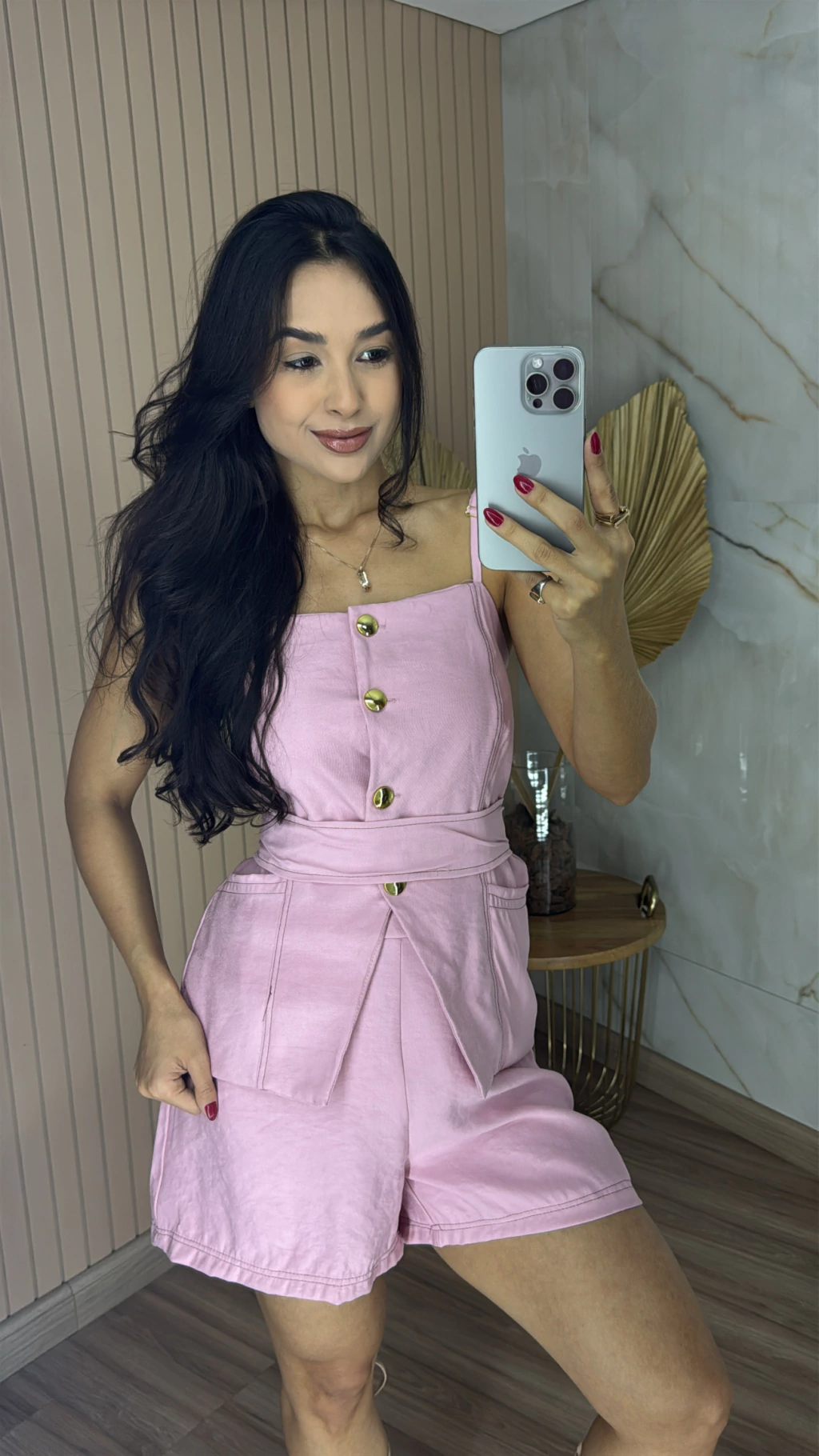 Descrição: descubra o poder da alfaiataria sensorial com este conjunto exclusivo que une sofisticação, praticidade e um toque moderno. Com design minimalista e elegante, a blusa possui alças finas que valorizam os ombros e conferem leveza a peça. O fechamento frontal com botões dourados adicionam um toque de sofisticação e charme atemporal. Acompanha uma faixa do mesmo tecido, ideal para acinturar e destacar a silhueta com delicadeza e estilo. O short é um verdadeiro coringa, confortável, versátil e super estiloso, ele oferece praticidade no dia a dia, sem perder a elegância. Seu corte moderno valoriza o corpo e proporciona liberdade de movimentos.
