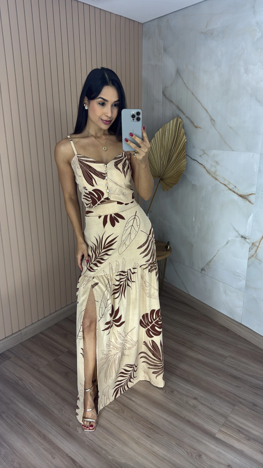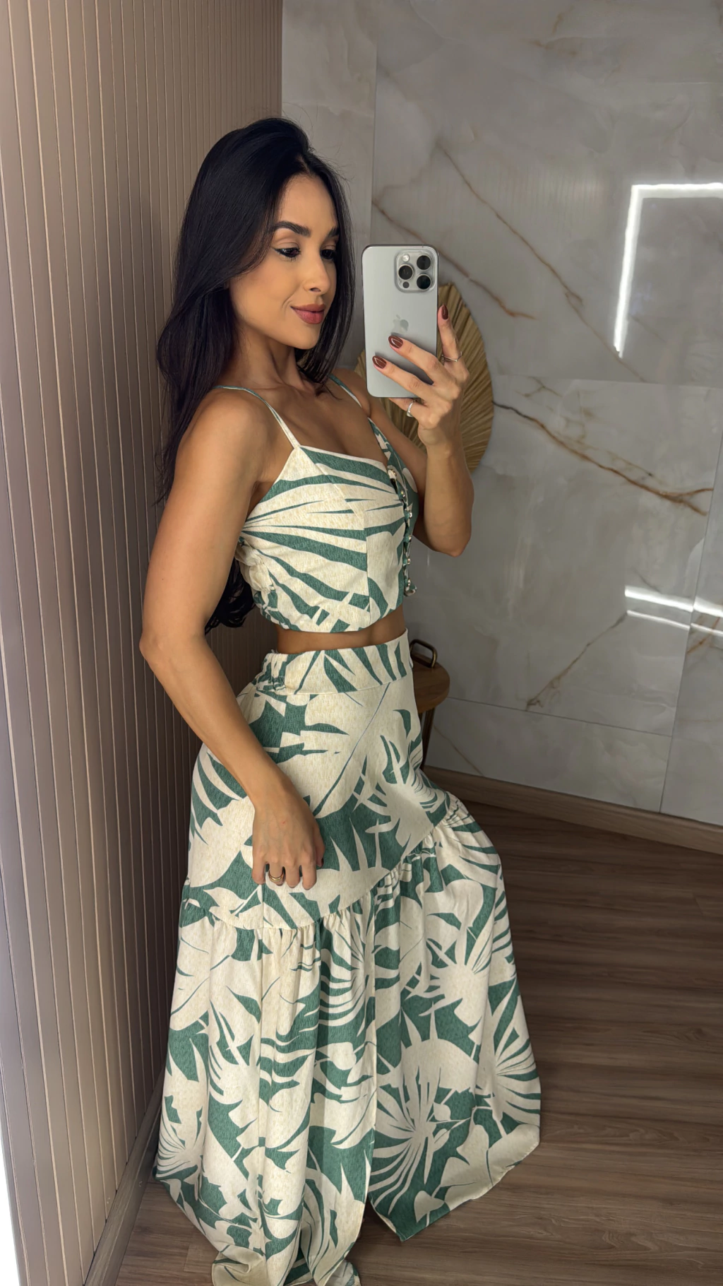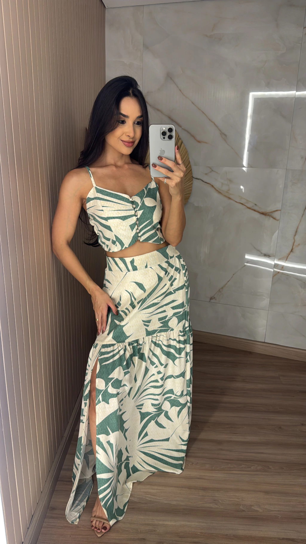 Descrição: Se você procura um look leve, moderno e ao mesmo tempo cheio de charme, esse conjunto é a escolha ideal. Feito em crepinho, conhecido por seu caimento fluido e toque suave, ele é perfeito para os dias de sol e momentos especiais. O cropped possui alças finas reguláveis e bojo. A saia possui o comprimento longo e fenda frontal.