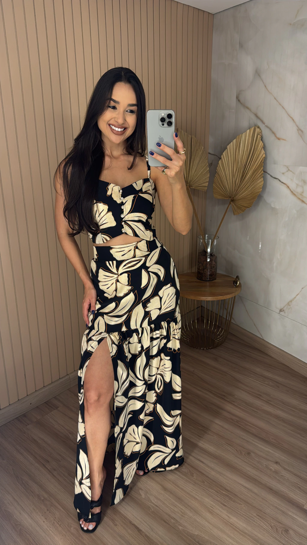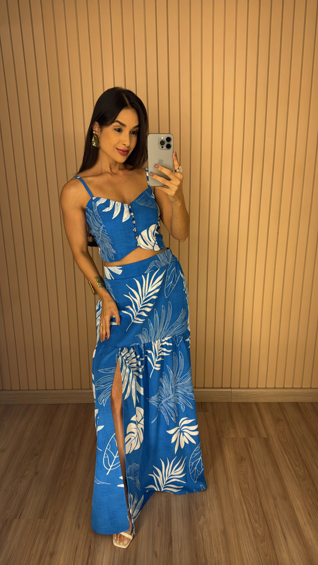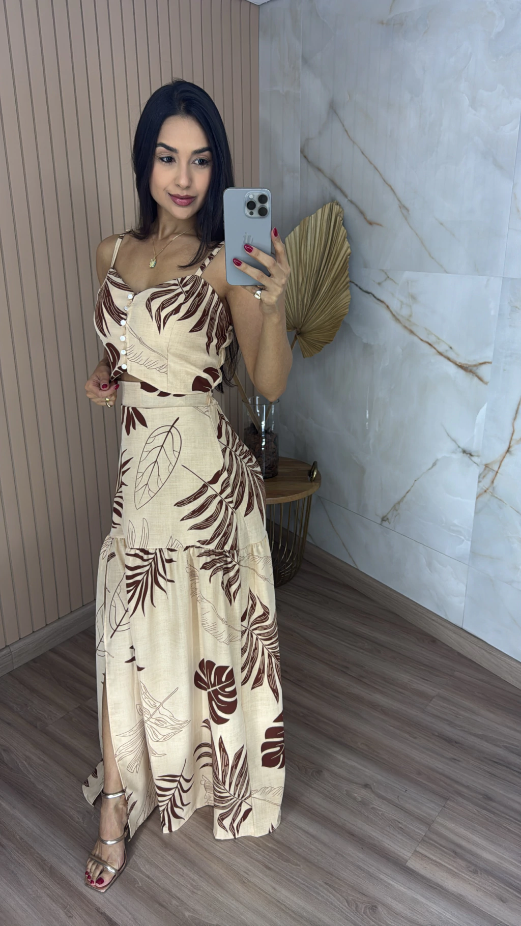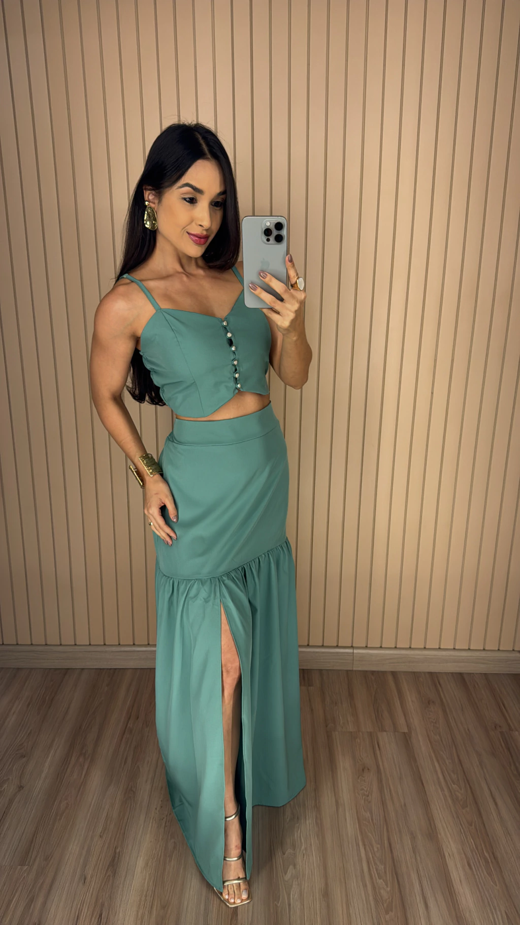 Descrição: Se você procura um look leve, moderno e ao mesmo tempo cheio de charme, esse conjunto é a escolha ideal. Feito em crepinho, conhecido por seu caimento fluido e toque suave, ele é perfeito para os dias de sol e momentos especiais. O cropped possui alças finas reguláveis e bojo. A saia possui o comprimento longo e fenda frontal.