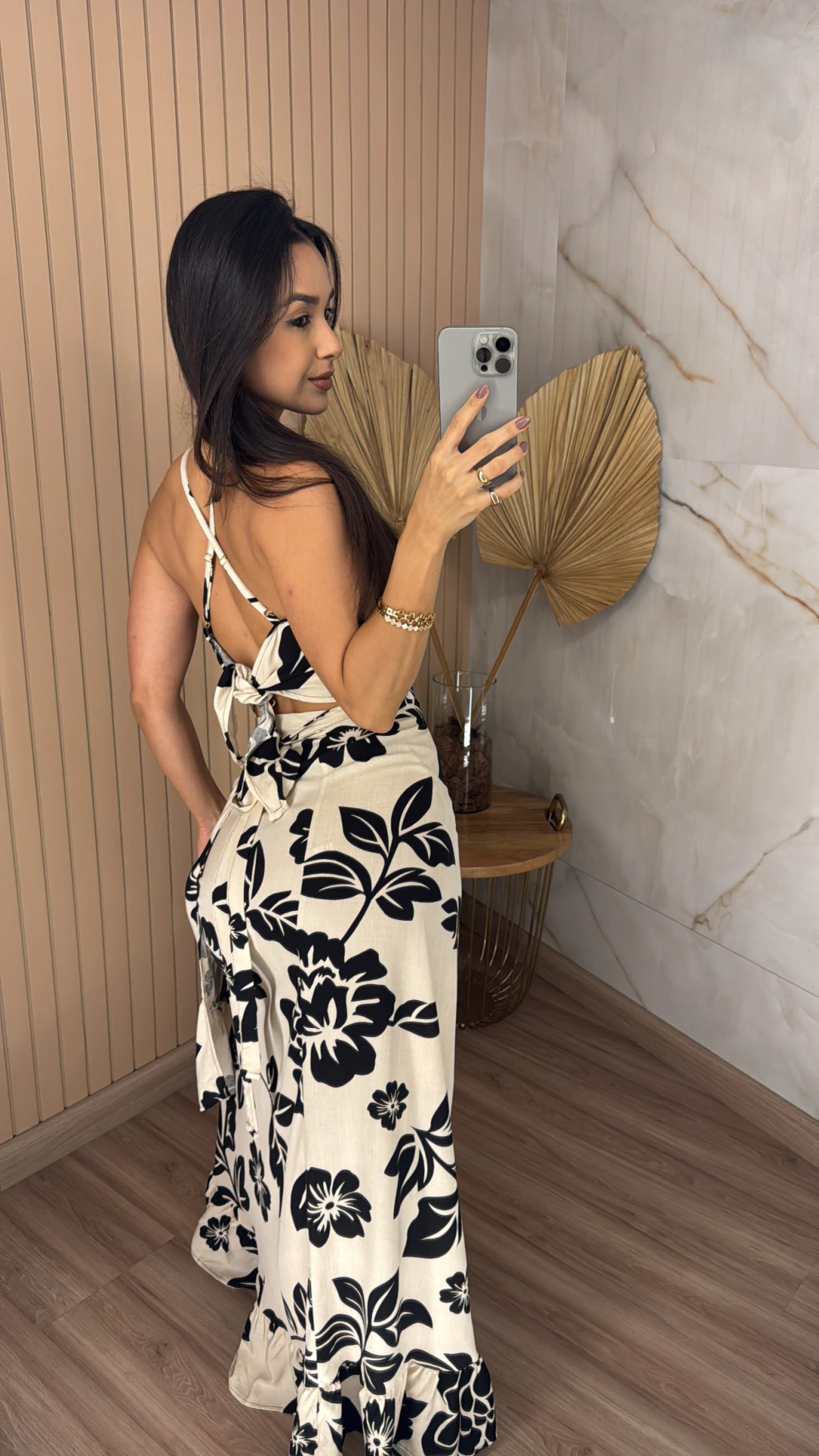 Busto: 31 cm (mínimo, podendo variar de acordo com a amarração) | Comprimento do cropped: 33 cm | Cintura: modelo envelope, então, é bem variável | Comprimento da saia: 40cm