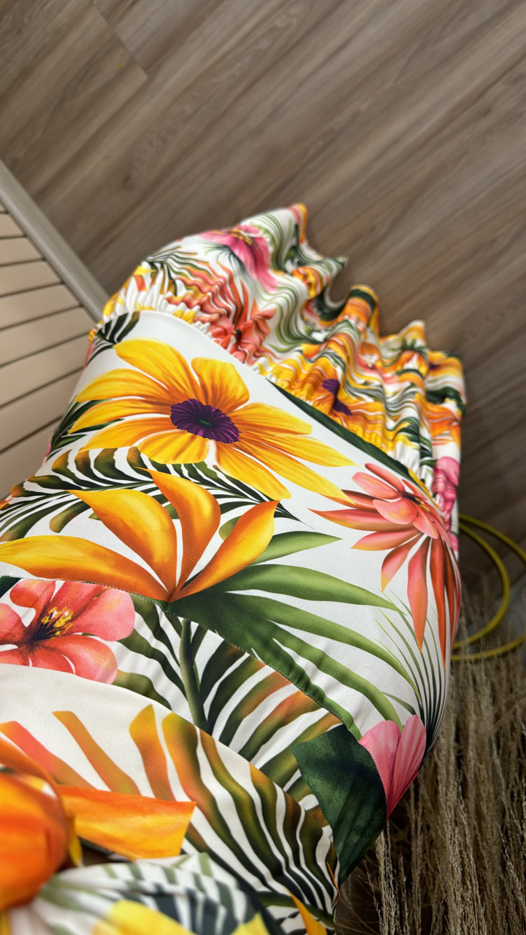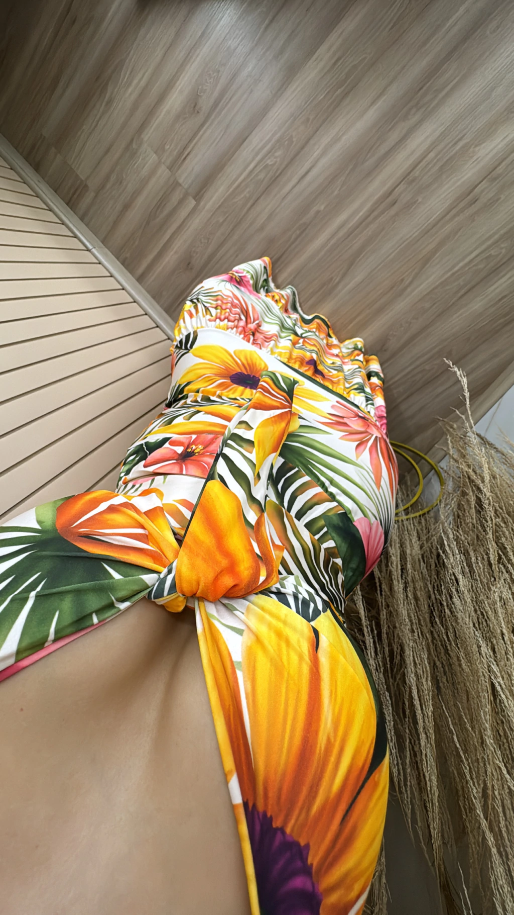 O conjunto no tecido viscose, é uma peça leve, confortável alegre. Por ser uma peça versátil é ideal para eventos durante o dia. Pode ser usada com calçados como rasteiras, sandálias.