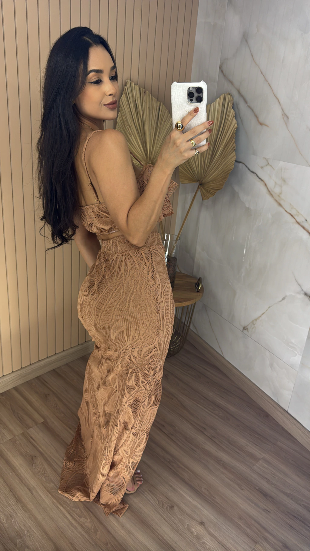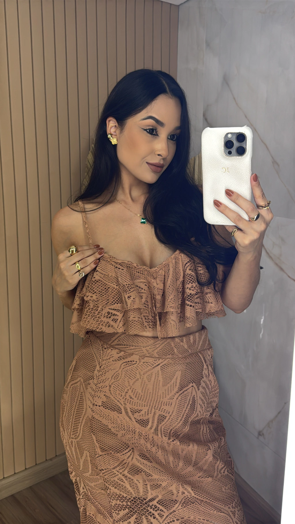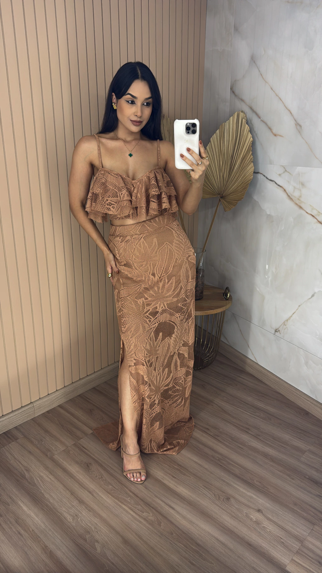 Descrição: Conjunto de renda, composto por um cropped com babados, bojo e alças reguláveis. Uma saia com o comprimento longo, contém elástico na cintura e fenda lateral.