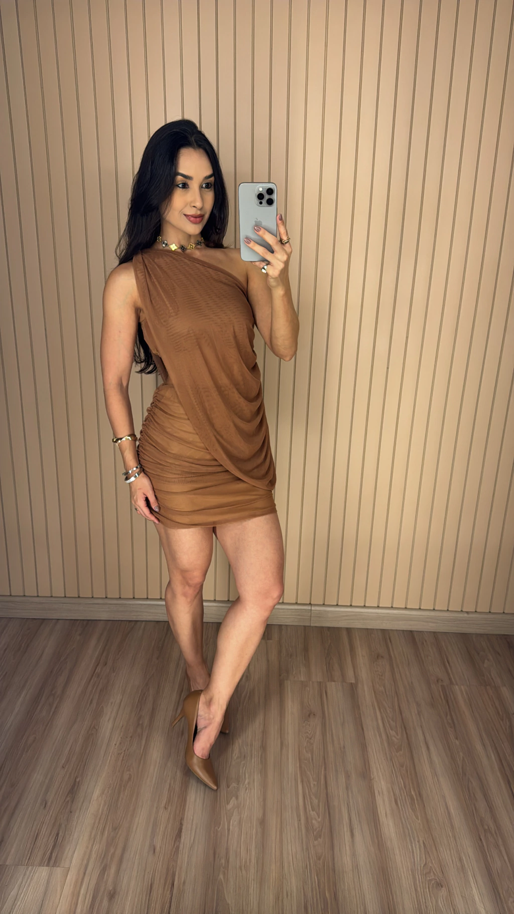 • Possui detalhes drapeados em todo o conjunto;