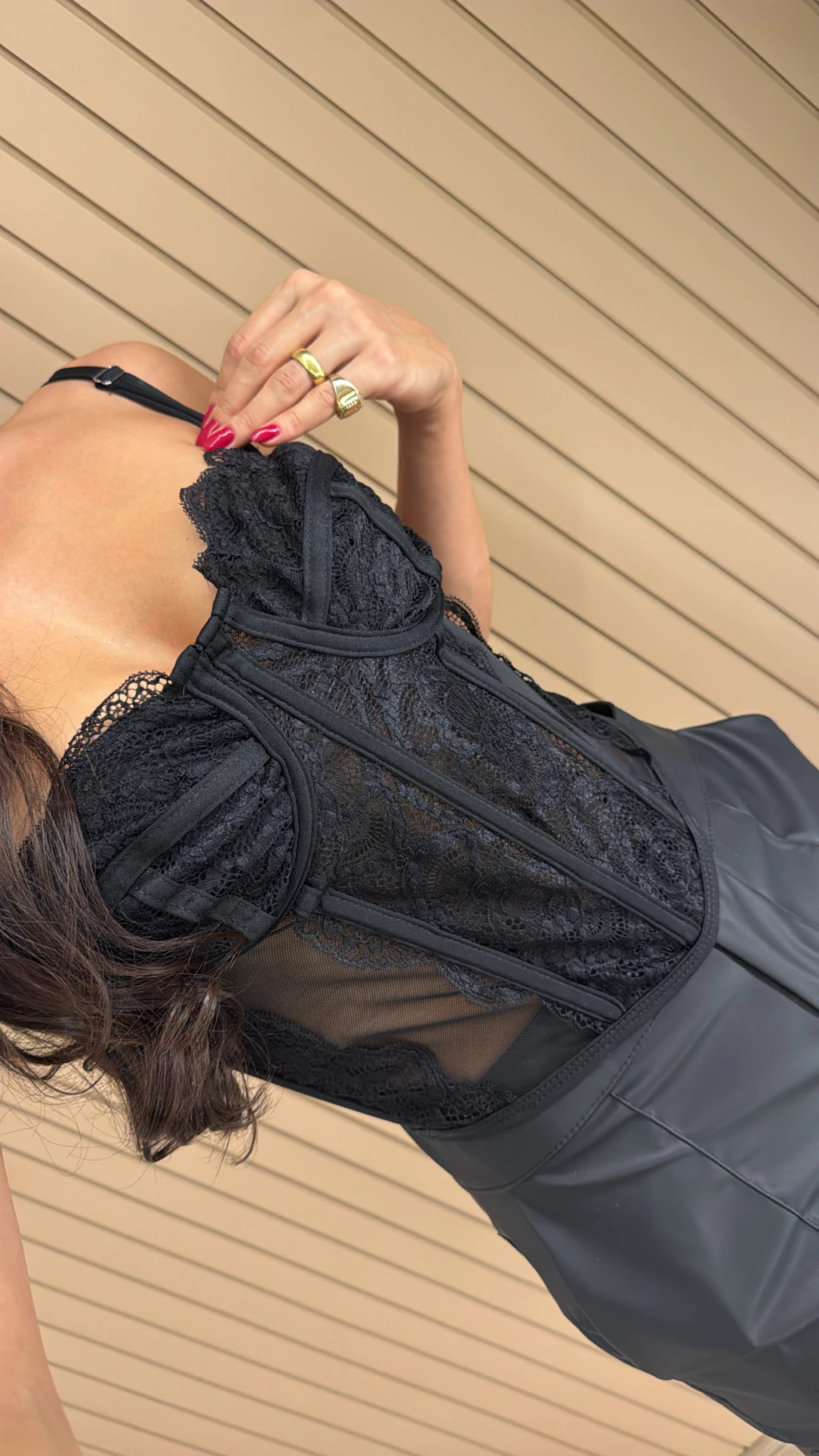 Uma peça atemporal que une romantismo e sensualidade em cada detalhe. Com o design refinado, ele é confeccionado em renda delicada com sobreposição de tule leve e transparente, criando um visual elegante. Ideal para quem ama peças versáteis, podendo ser usado com blazer, saias, jeans ou para um look ousado e cheio de personalidade.