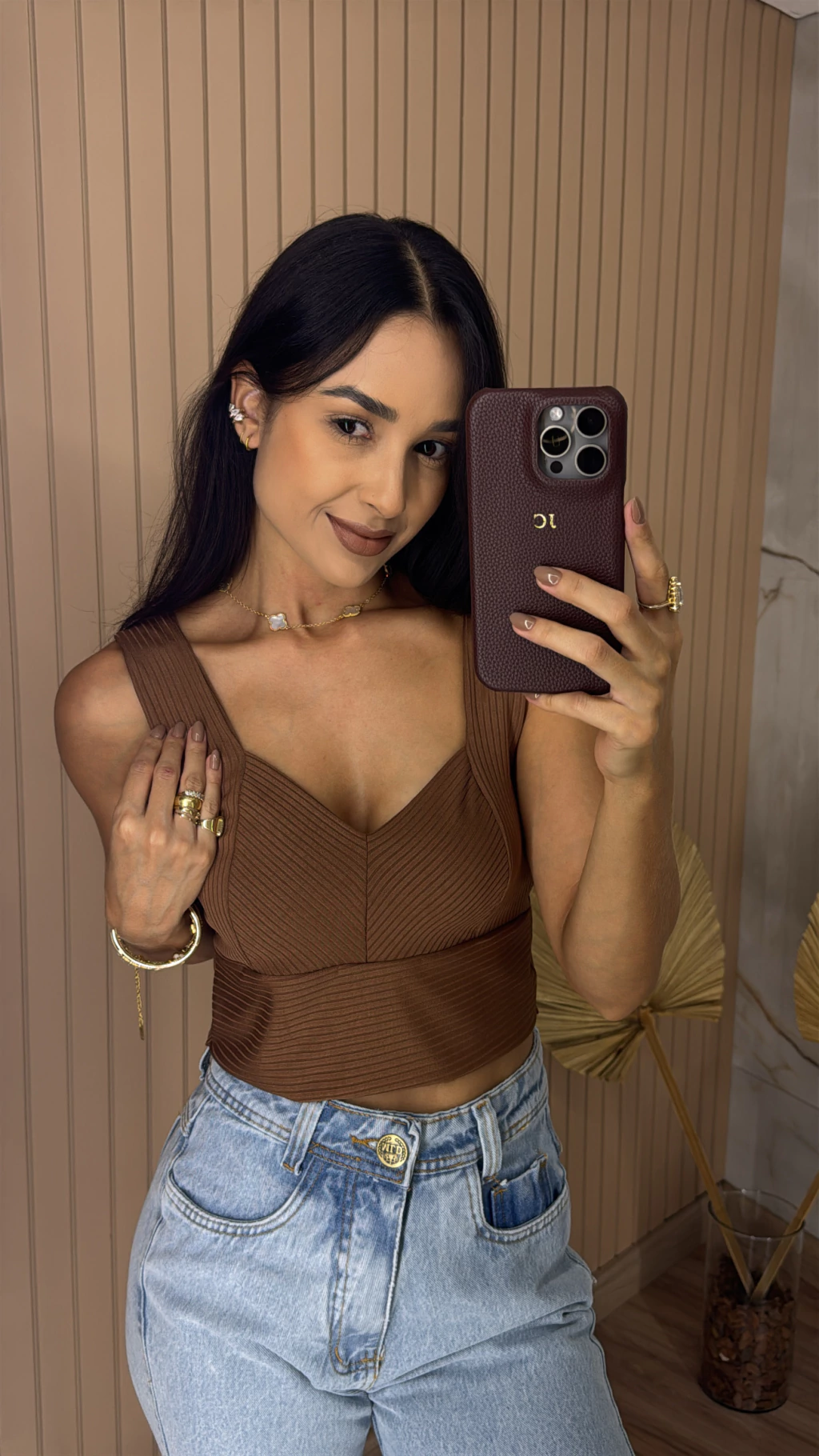 O cropped em tecido canelado possui alças grossas e decote em (V).