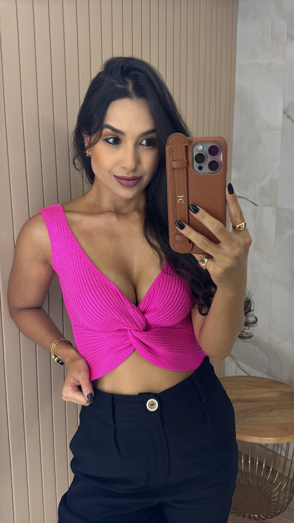 Descrição: O cropped no tecido modal possui alças grossas e recorte em V e detalhe em nó no busto.
