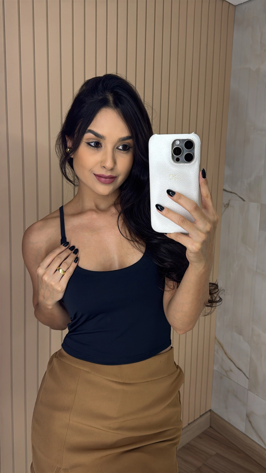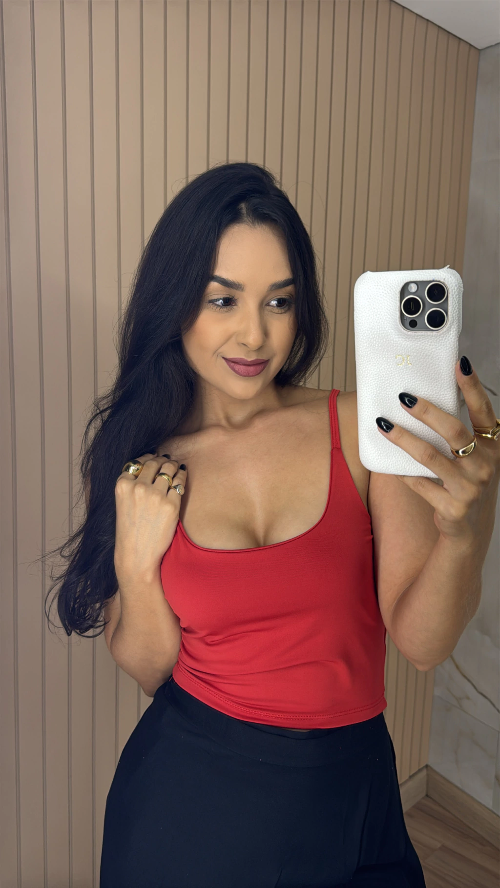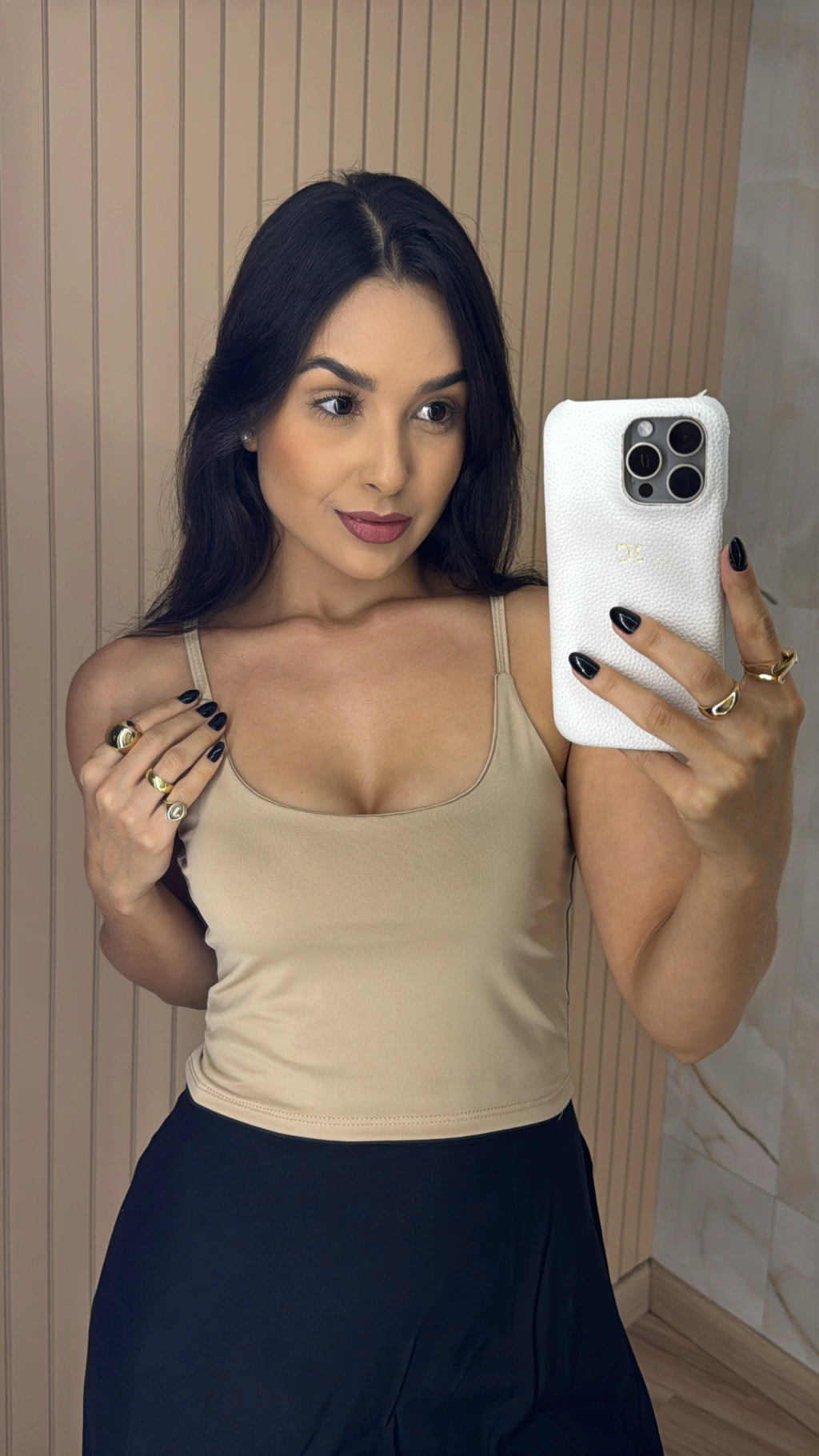 Descrição: o cropped em tecido poliamida, contém decote reto e forro.