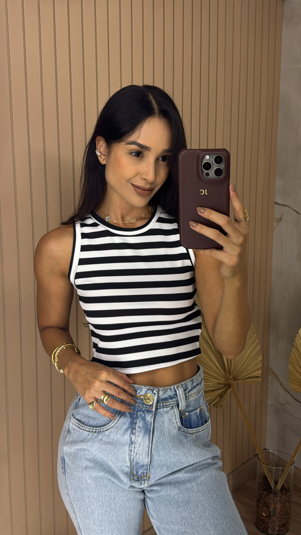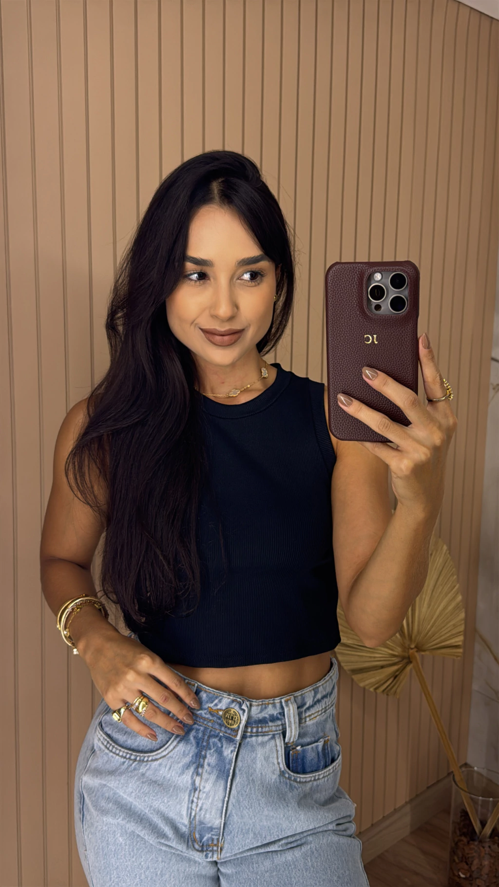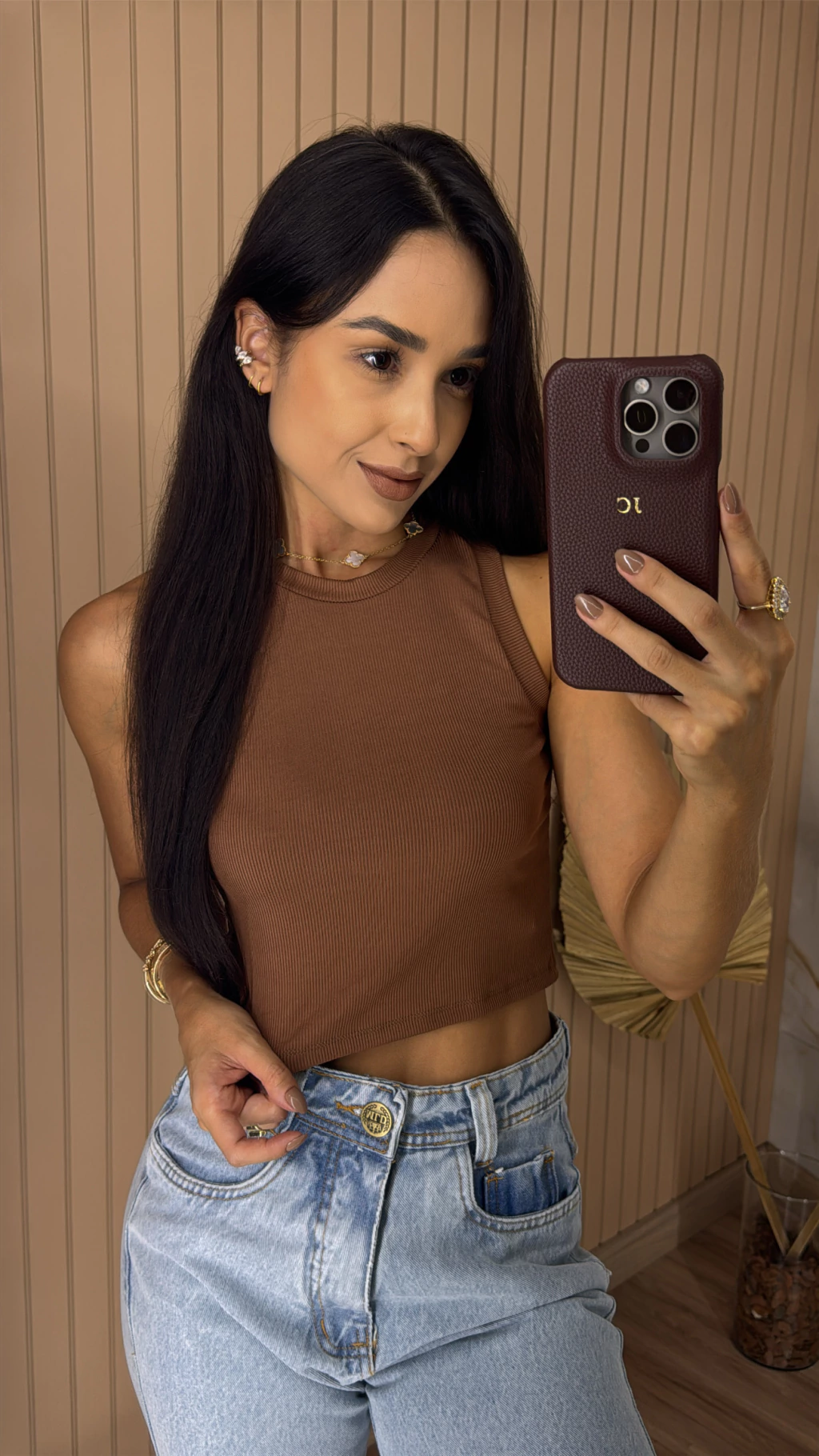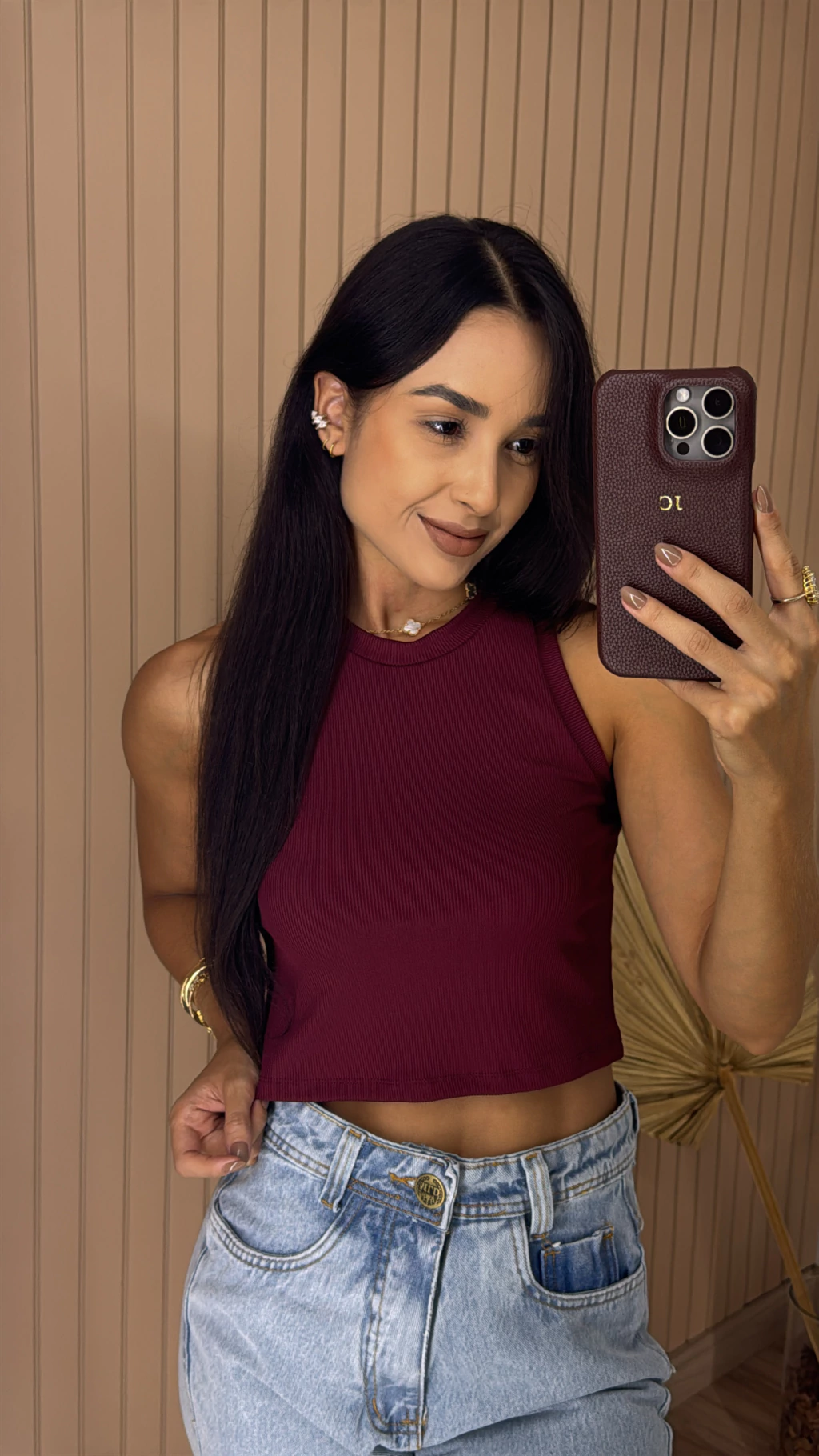 Descrição: O cropped é em tecido canelado ribana, modelo regata com gola arredondada.
