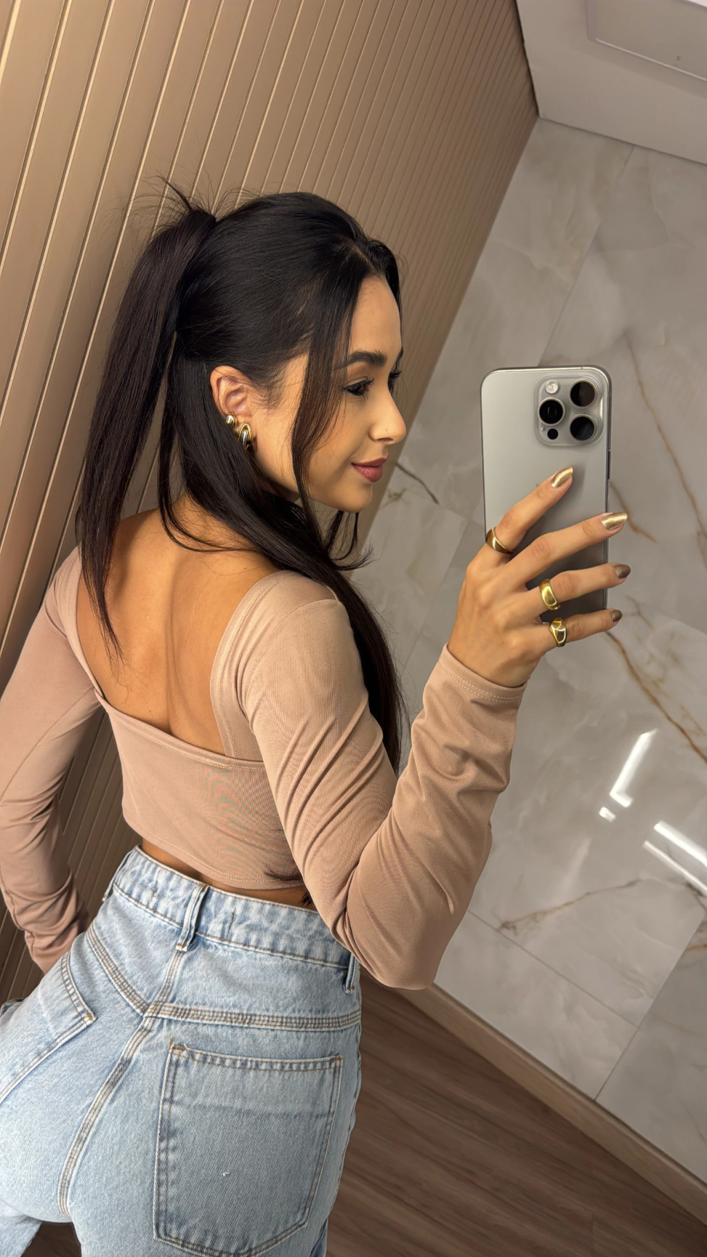 Descrição: Se tem uma peça que não pode faltar no seu guarda-roupas, é o Cropped suplex com mangas longas, bojo e decote nas costas, ele une sensualidade na medida certa, conforto extremo e um toque de elegância que transforma qualquer look.
