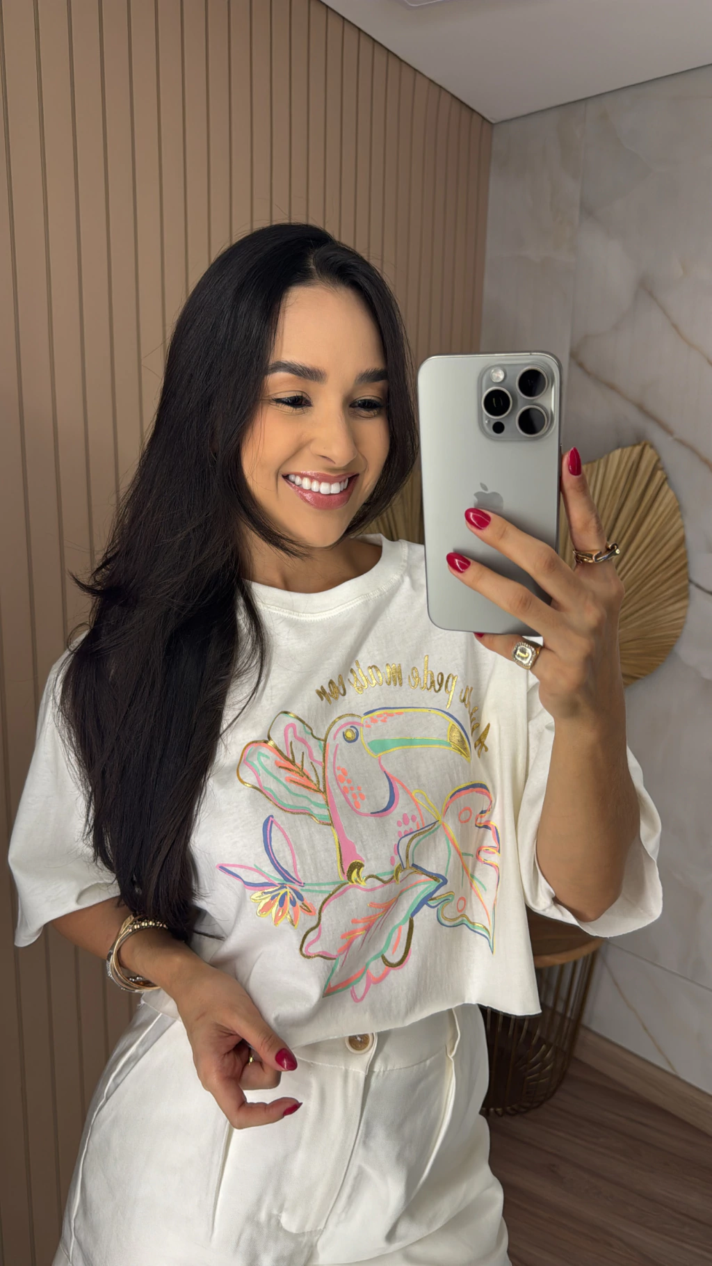 Descrição: A t-shirt ideal para quem ama conforto e atitude. A cropped t-shirt em tecido algodão chegou para dar aquele toque urbano e fashionista no seu visual. Com uma modelagem moderna e despojada, essa t-shirt traz mangas 3/4, perfeitas para composições versáteis, além de gola redonda clássica e o detalhe da barra sem bainha, que cria um acabamento desfiado super estiloso e atual. A estampa em destaque, com toque metalizado e aplicação central, traz um mood fashion que combina com jeans, alfaiataria ou até uma saia midi.