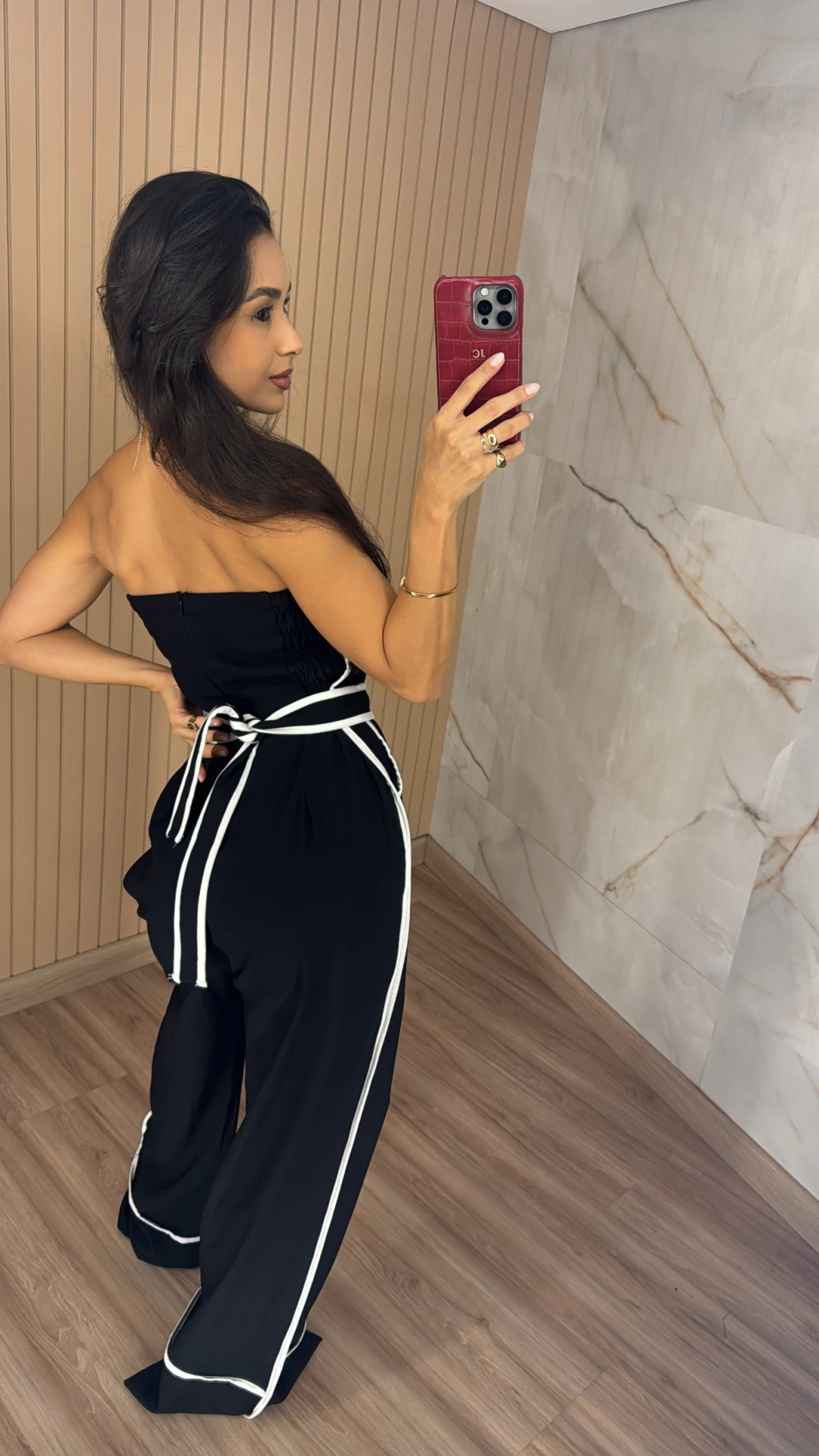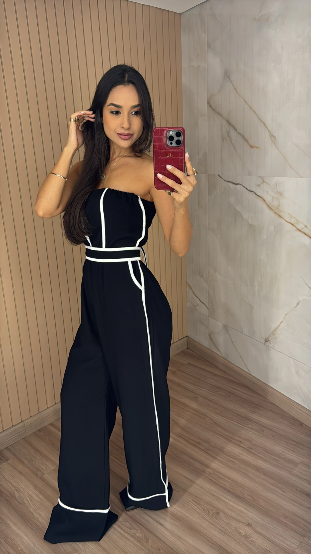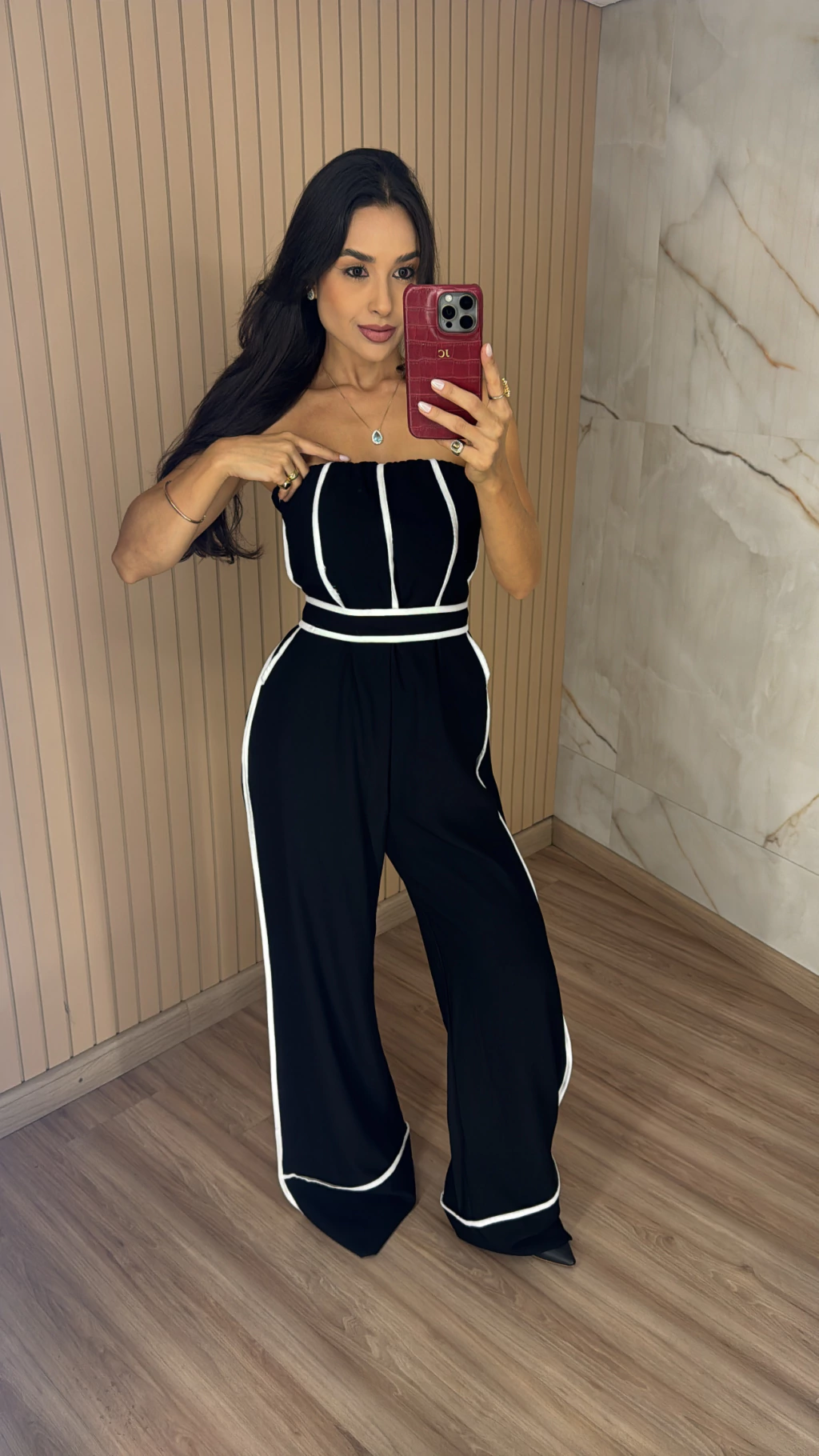 Descrição: Se você quer um look marcante, sofisticado e pronto em um único movimento, o macacão alfaiataria pantalona é a peça chave que seu guarda-roupas estava esperando. Com modelagem ampla, sem alças, possui bojo e lastex nas costas, e acabamento refinado, ele traduz a elegância moderna em cada detalhe.