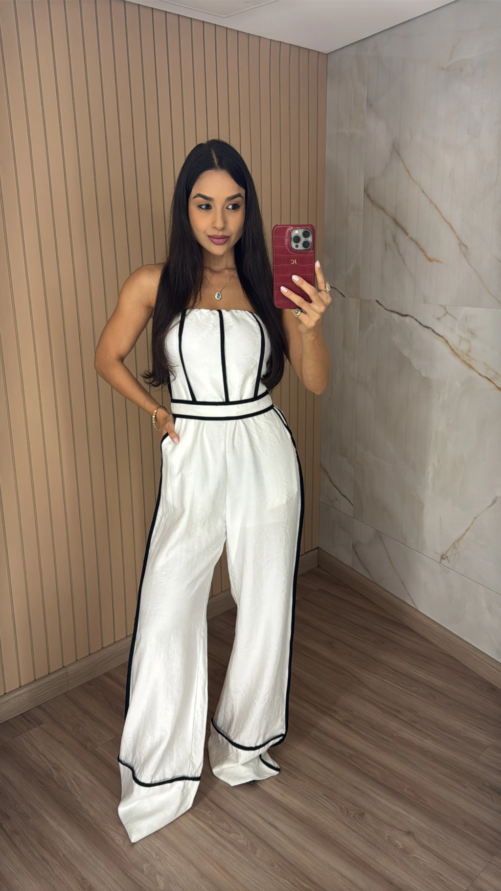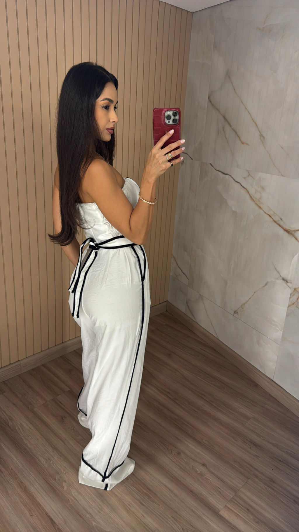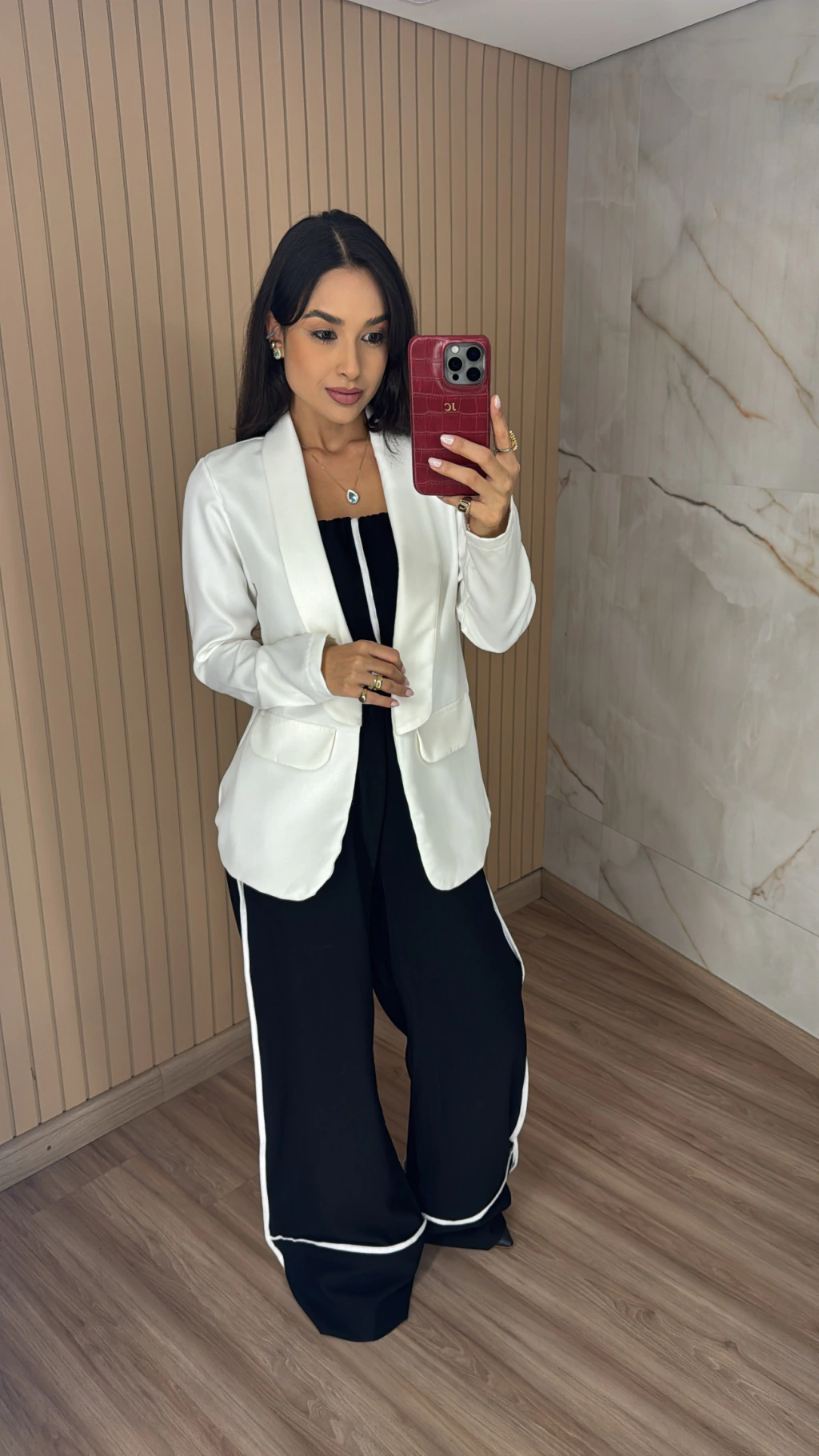 Descrição: Se você quer um look marcante, sofisticado e pronto em um único movimento, o macacão alfaiataria pantalona é a peça chave que seu guarda-roupas estava esperando. Com modelagem ampla, sem alças, possui bojo e lastex nas costas, e acabamento refinado, ele traduz a elegância moderna em cada detalhe.