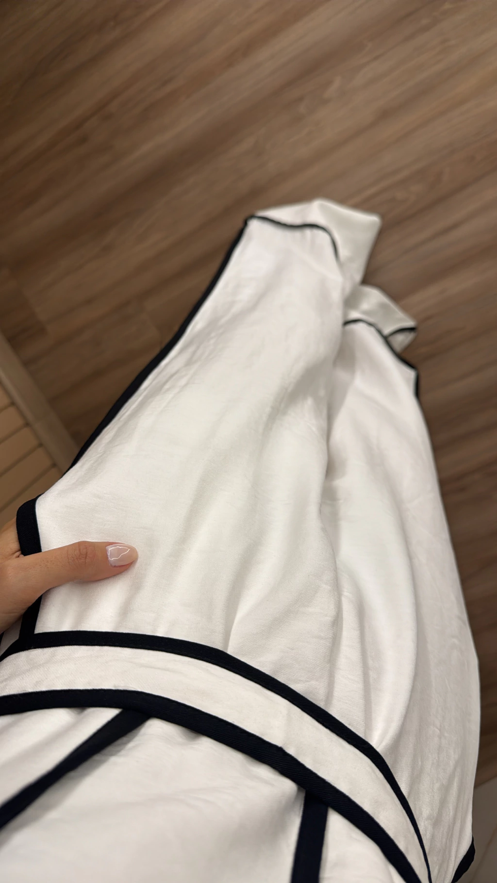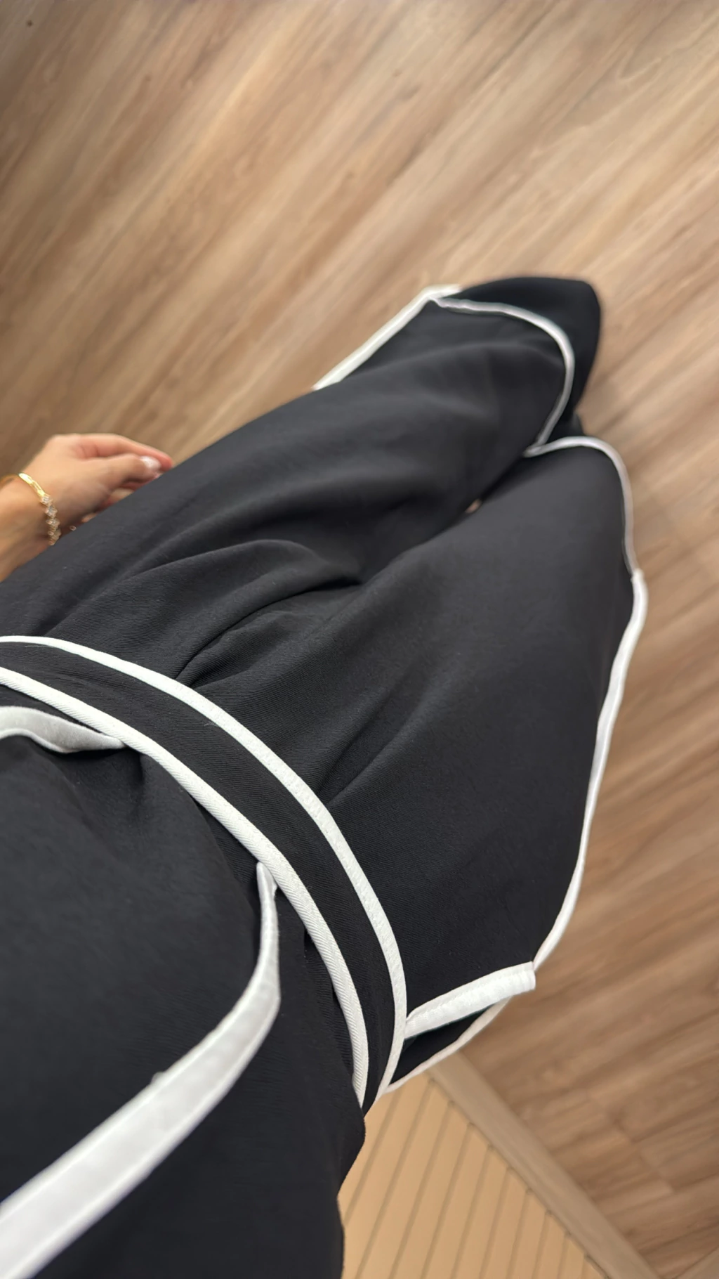 Modelagem pantalona: Pernas amplas que alongam a silhueta e conferem sofisticação instantânea.