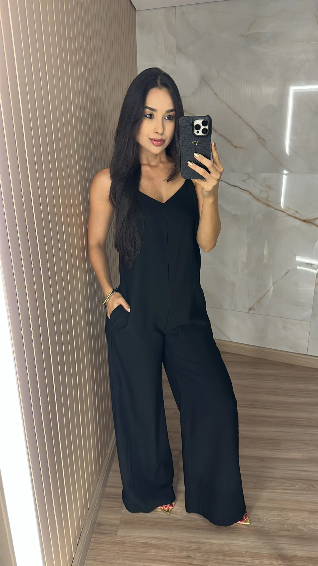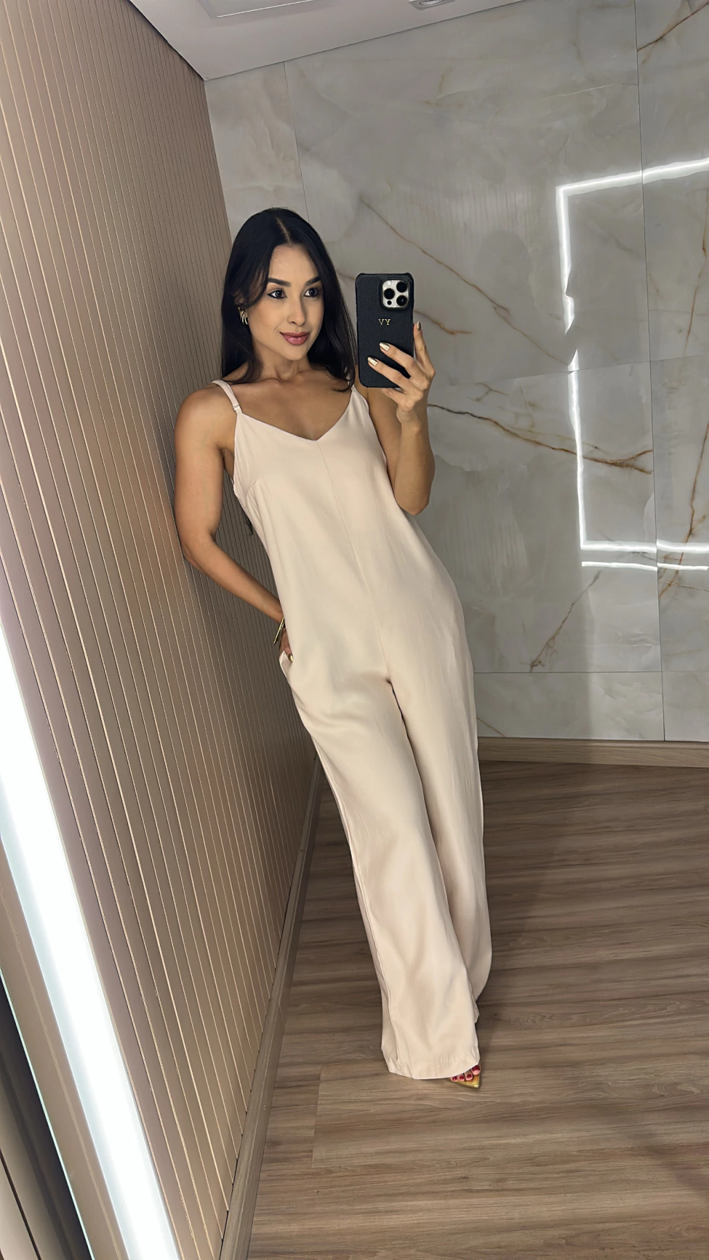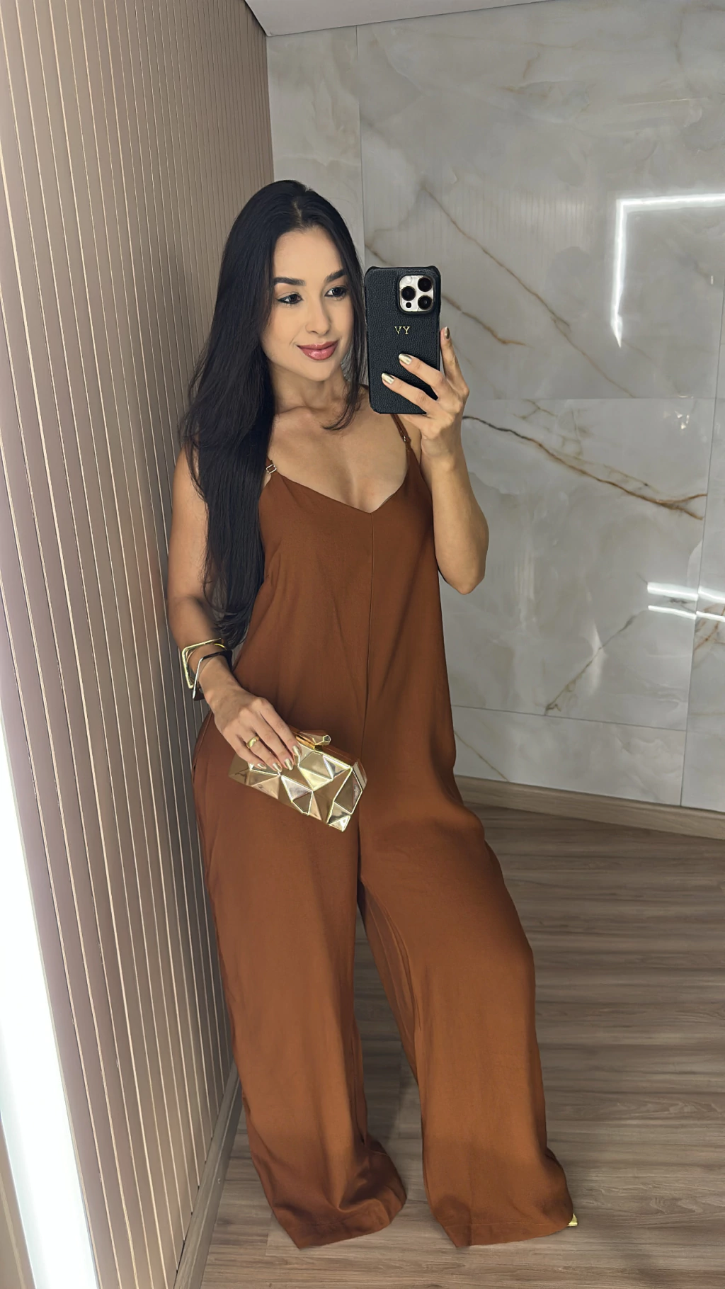 Modelagem que valoriza: o macacão pantalona traz leveza e movimento, enquanto o recorte no busto realça o colo sem exageros.