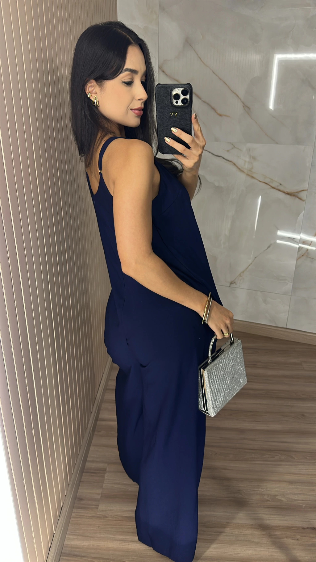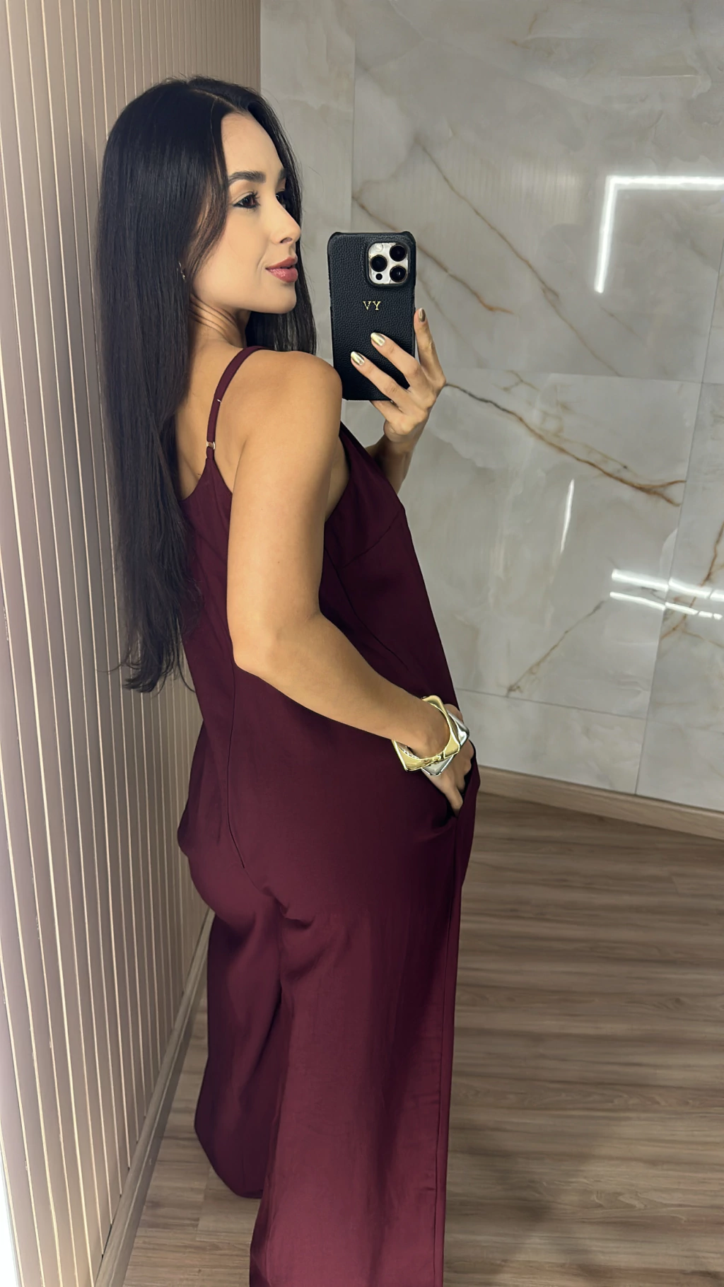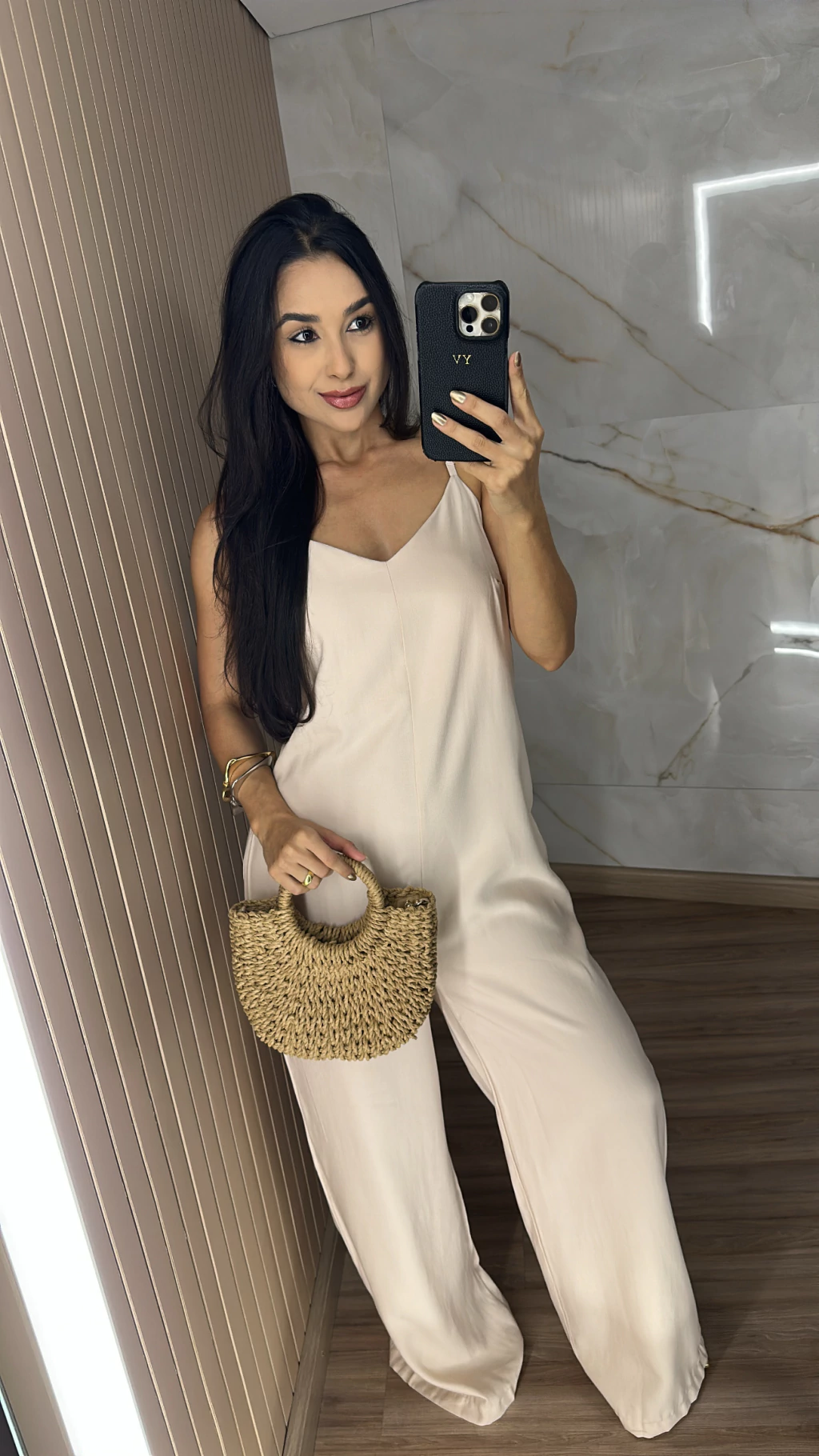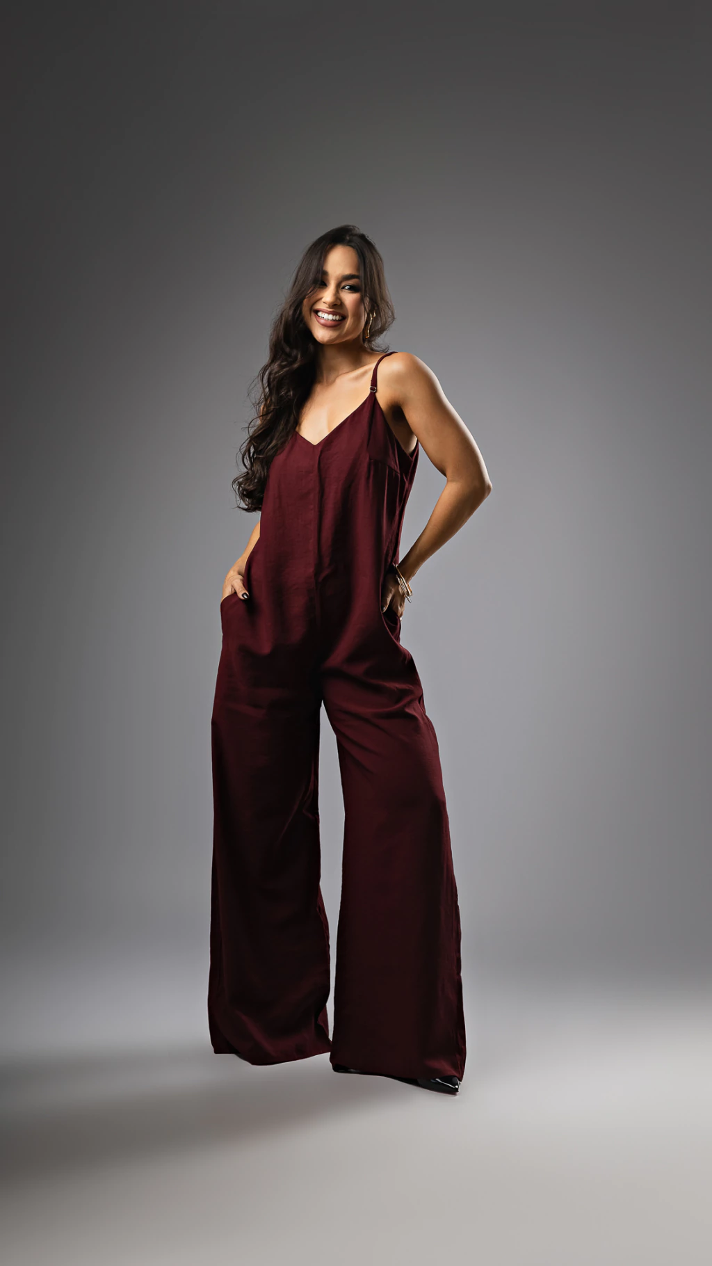 Modelagem que valoriza: o macacão pantalona traz leveza e movimento, enquanto o recorte no busto realça o colo sem exageros.
