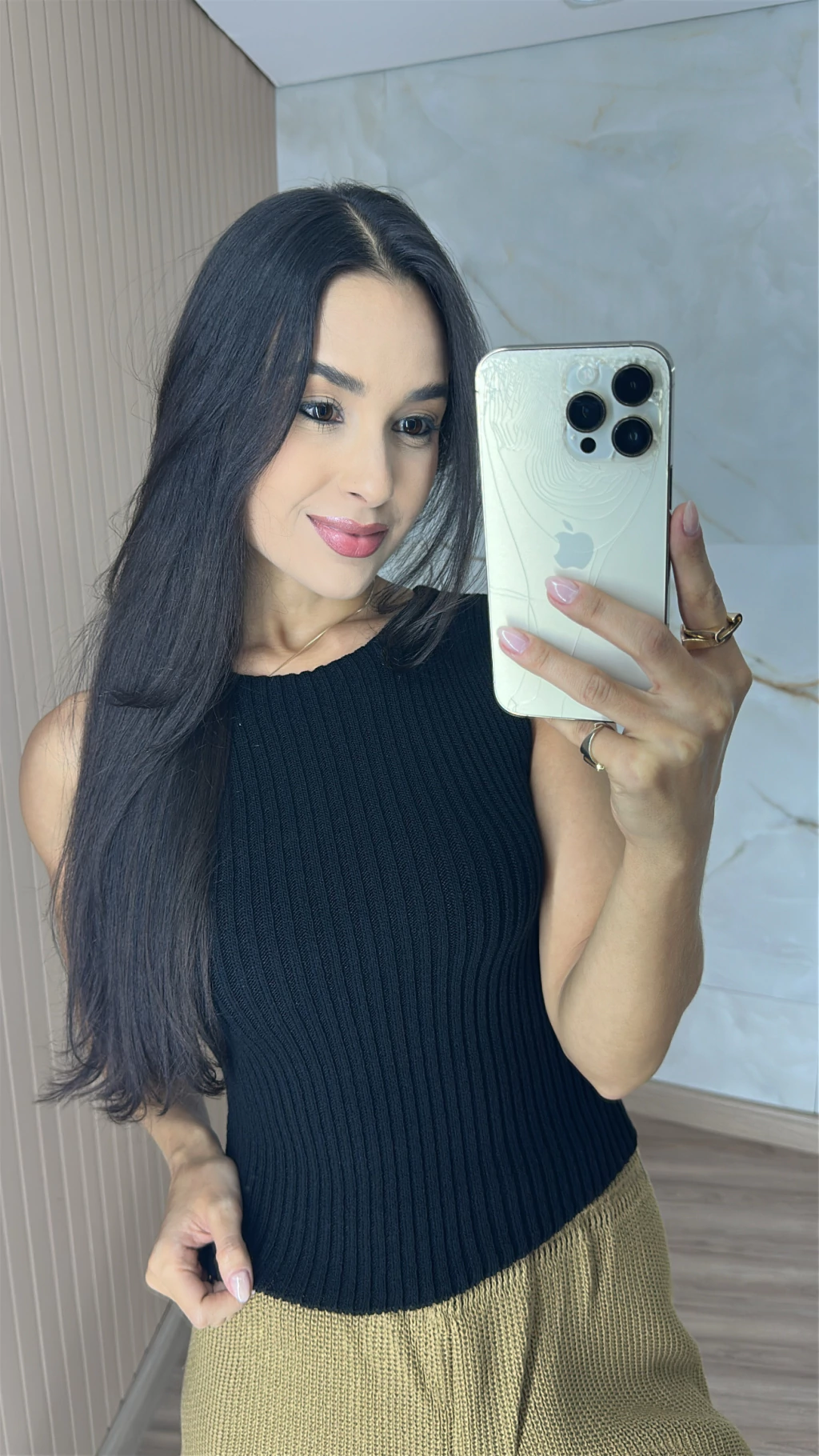 Descrição: Se você busca por uma peça que uma elegância e versatilidade, acaba de encontrar a regata tricot, o item ideal para o seu guarda-roupas. Com toque macio e caimento impecável, essa peça é perfeita para compor desde produções casuais até looks mais elaborados.