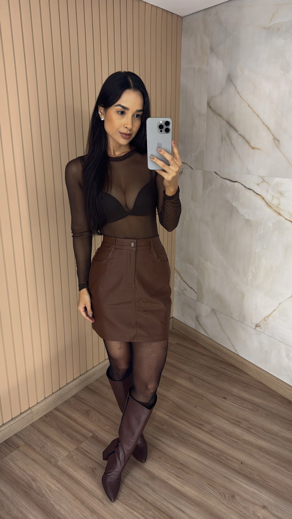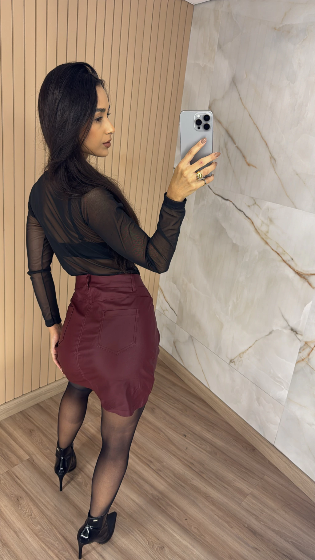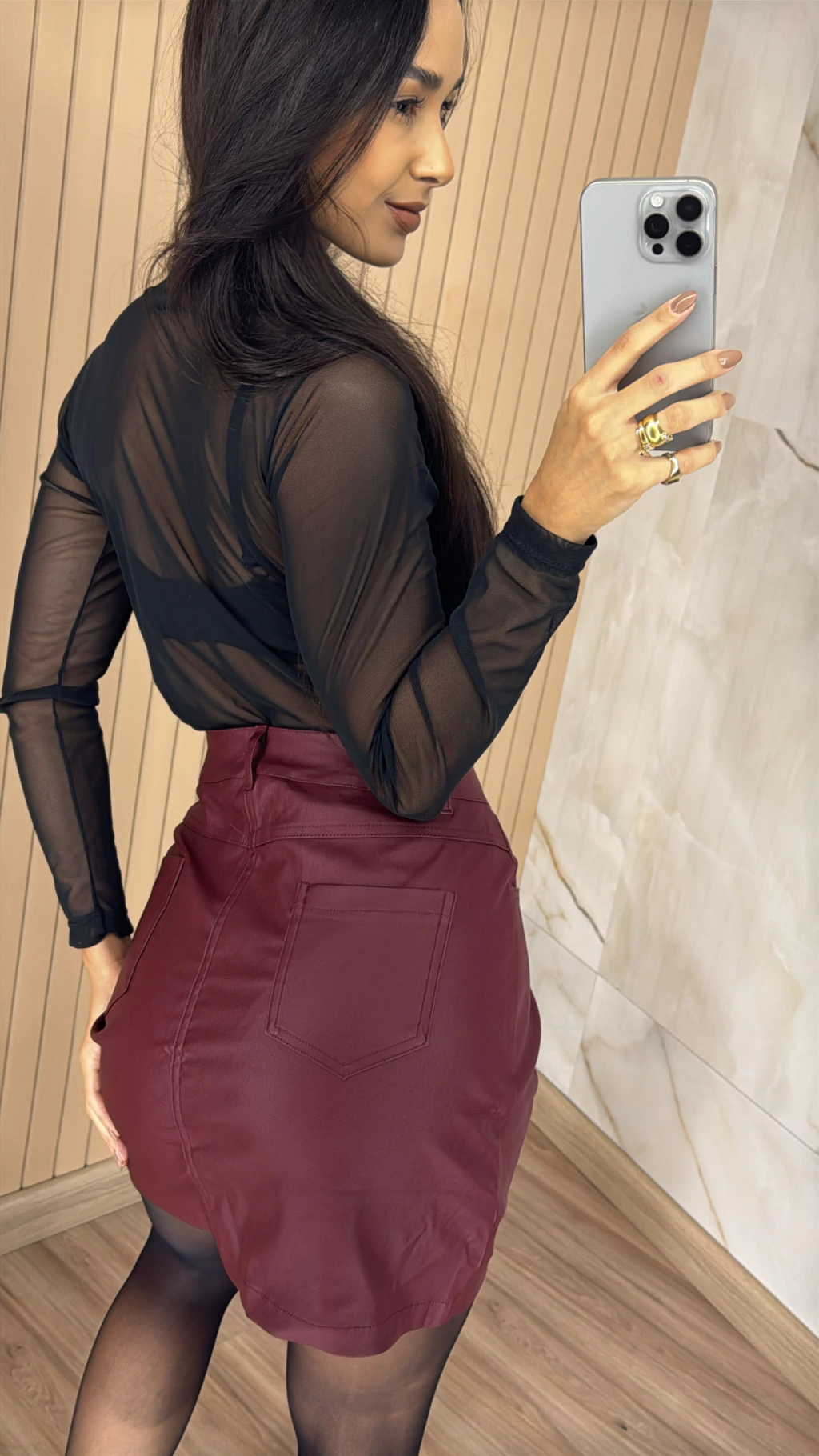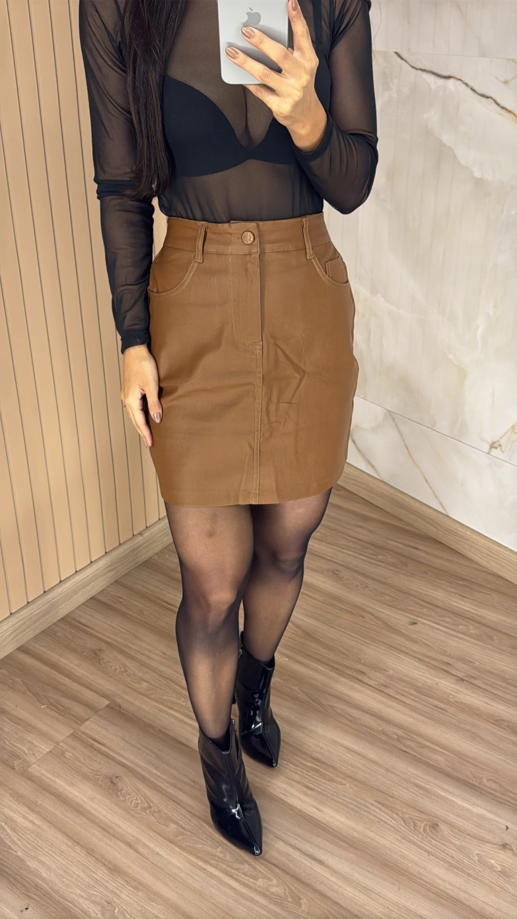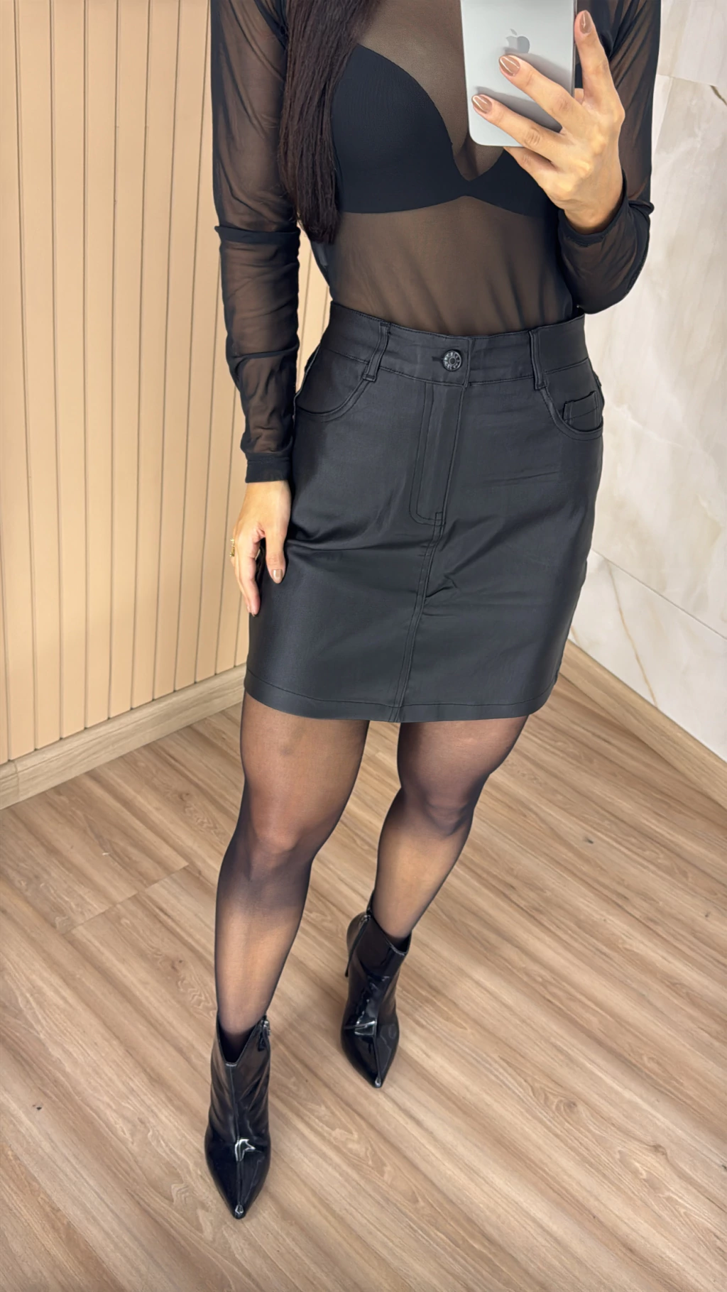 Descrição: A saia resinada contém zíper, bolsos laterais e traseiros.