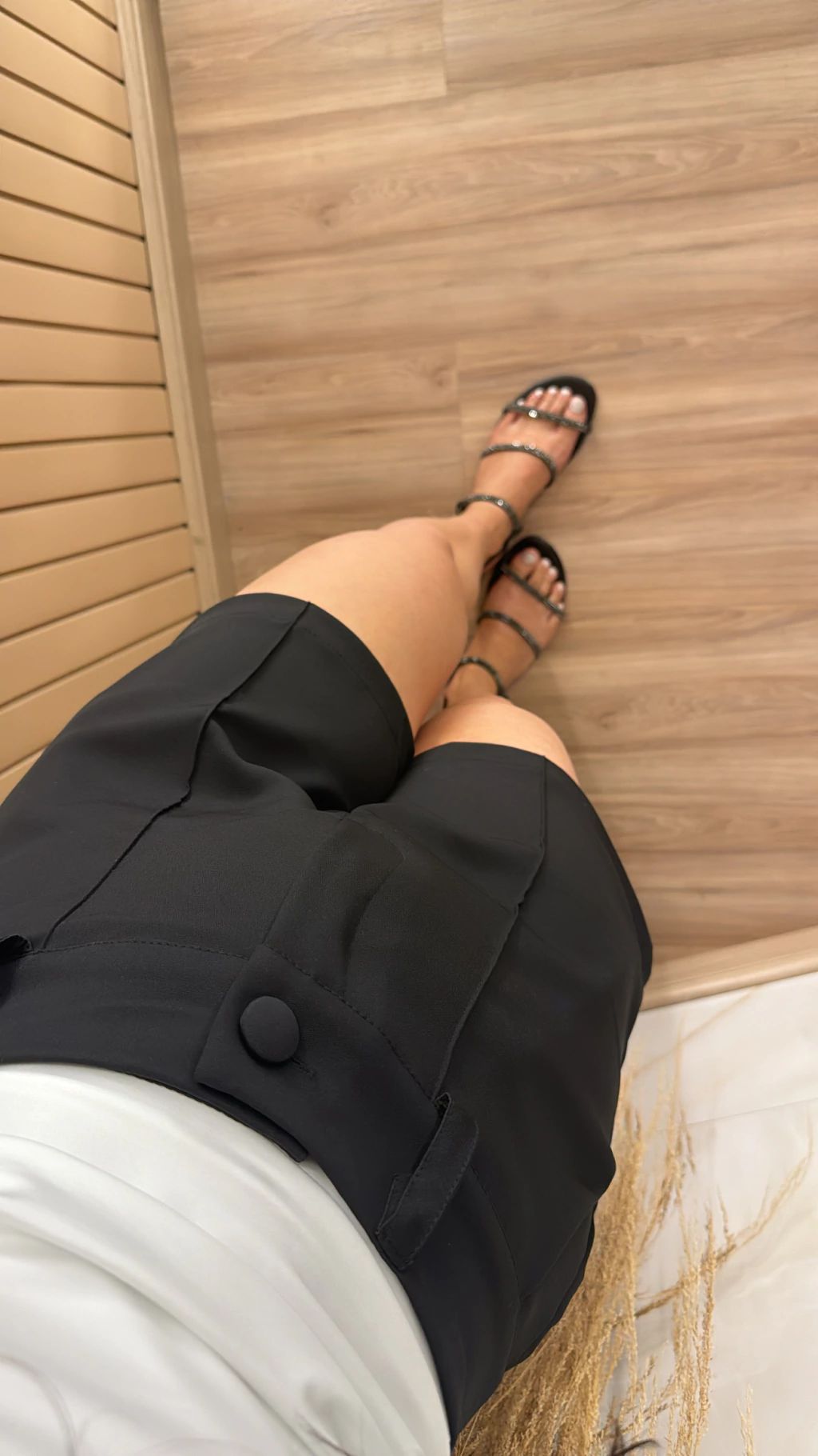 Descrição: o short é em tecido alfaiataria sensorial com botão encapado, fechamento em zíper e bolsos laterais.
