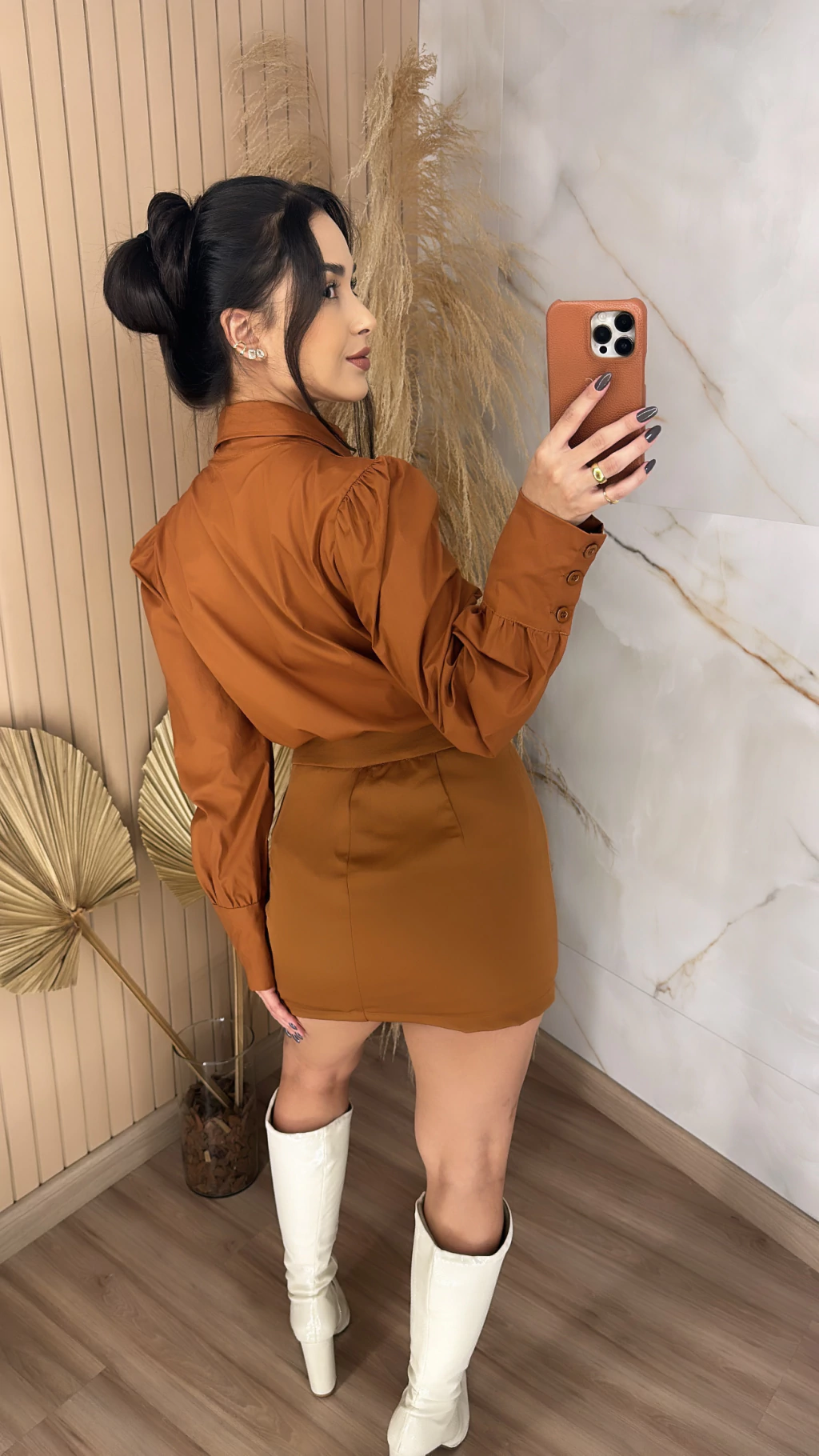 Short saia em estilo alfaiataria, modelo curto, fechamento em zíper e botão encapado.