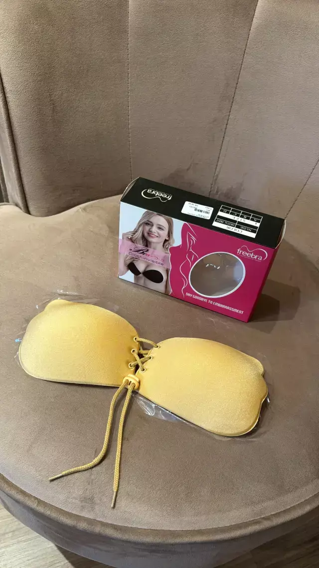 Sutiã de silicone autocolante, com fechamento central em corda regulável.