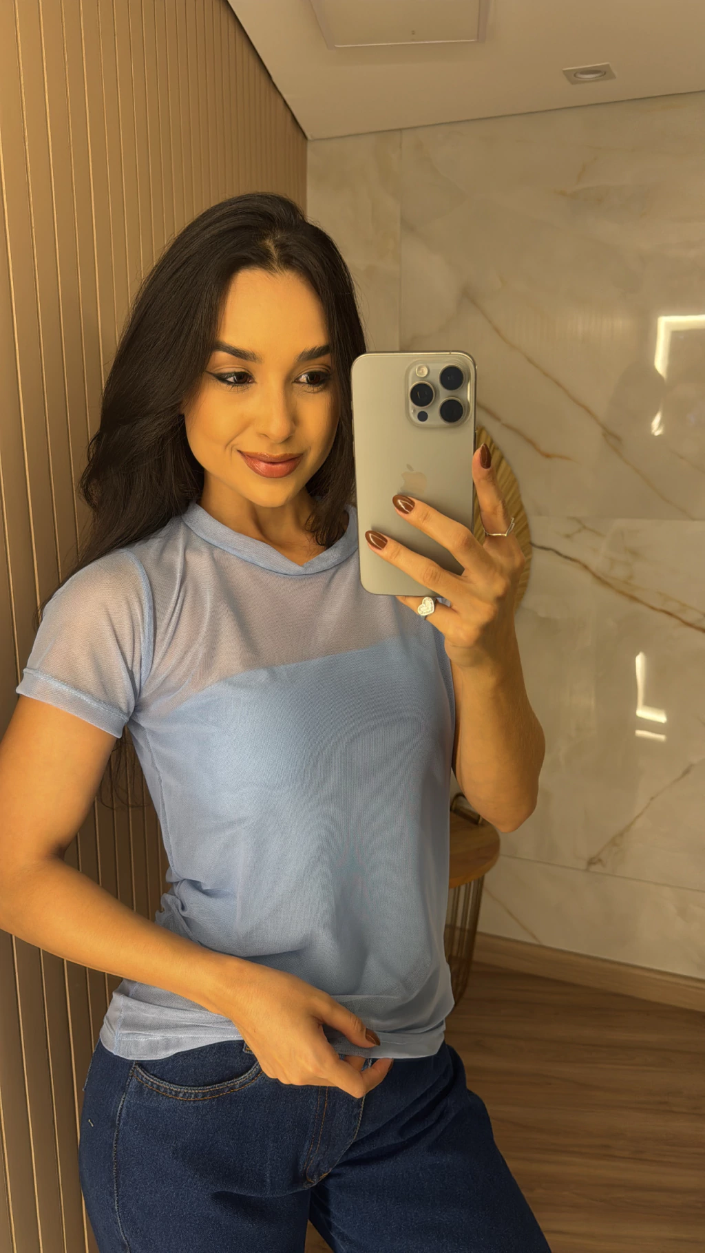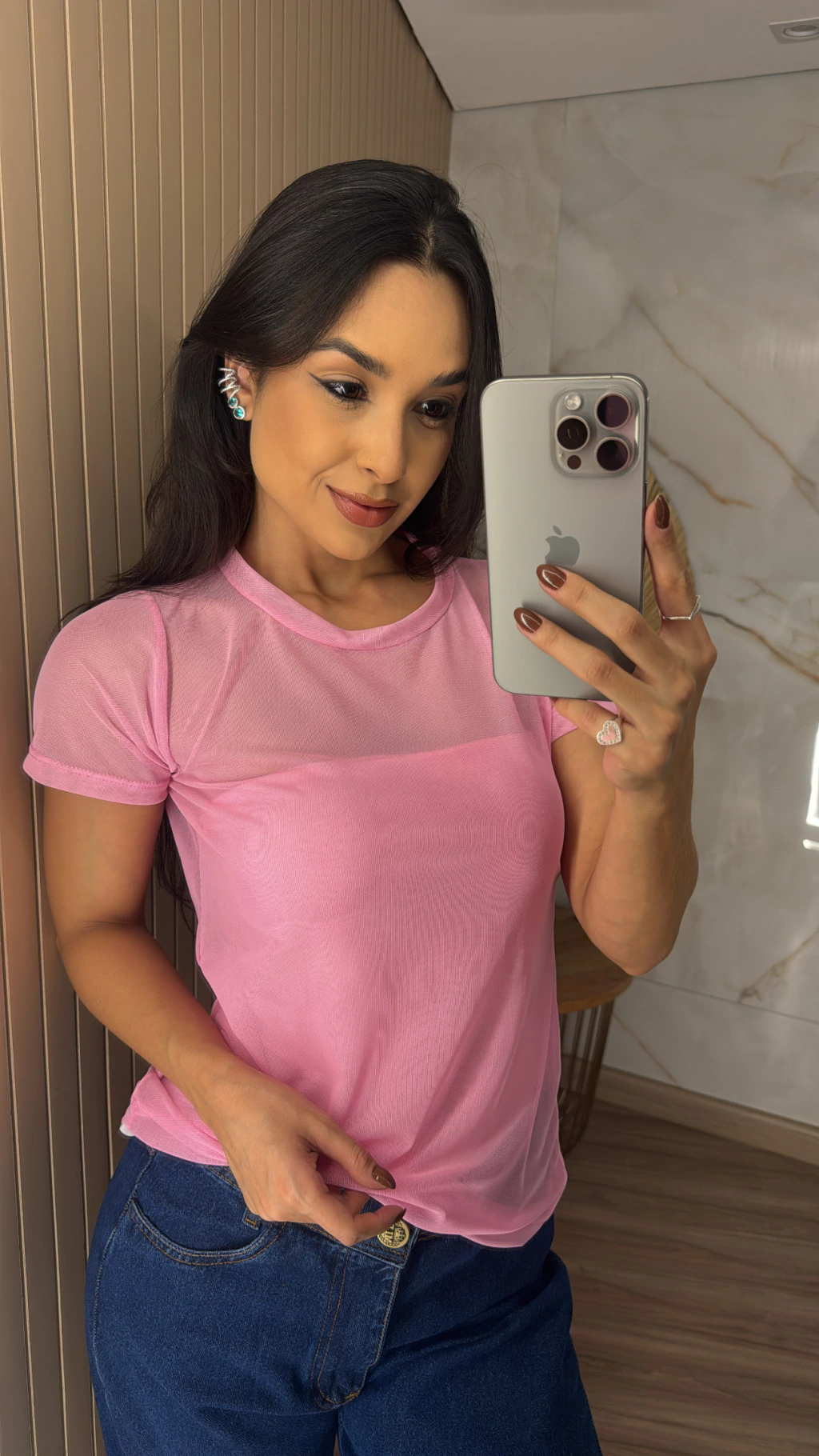 Descrição: A blusa no tecido tule possui mangas e transparência em seu comprimento.