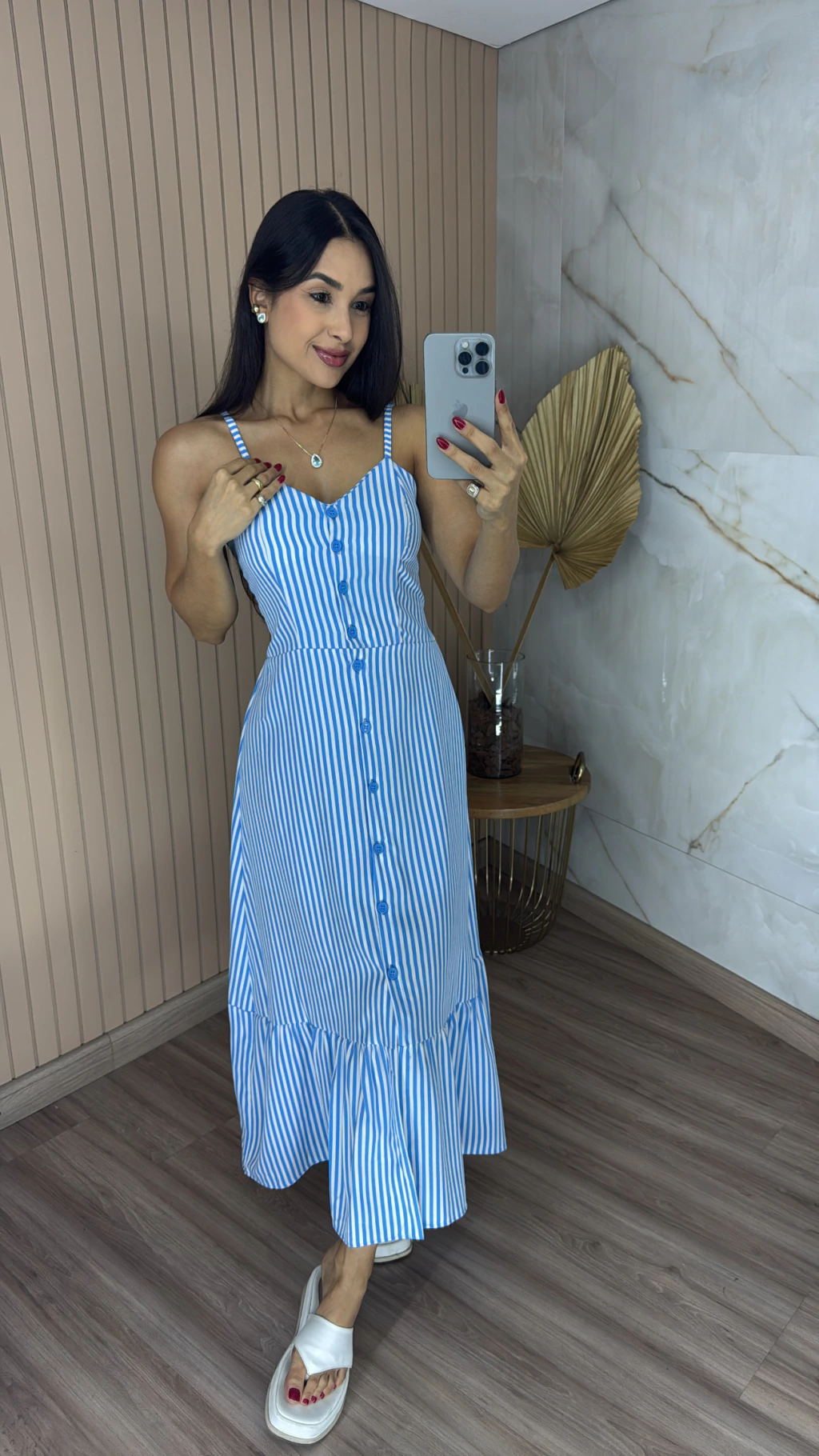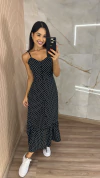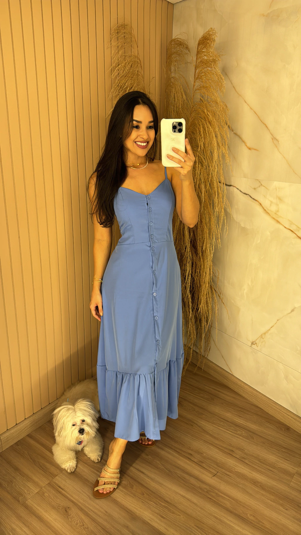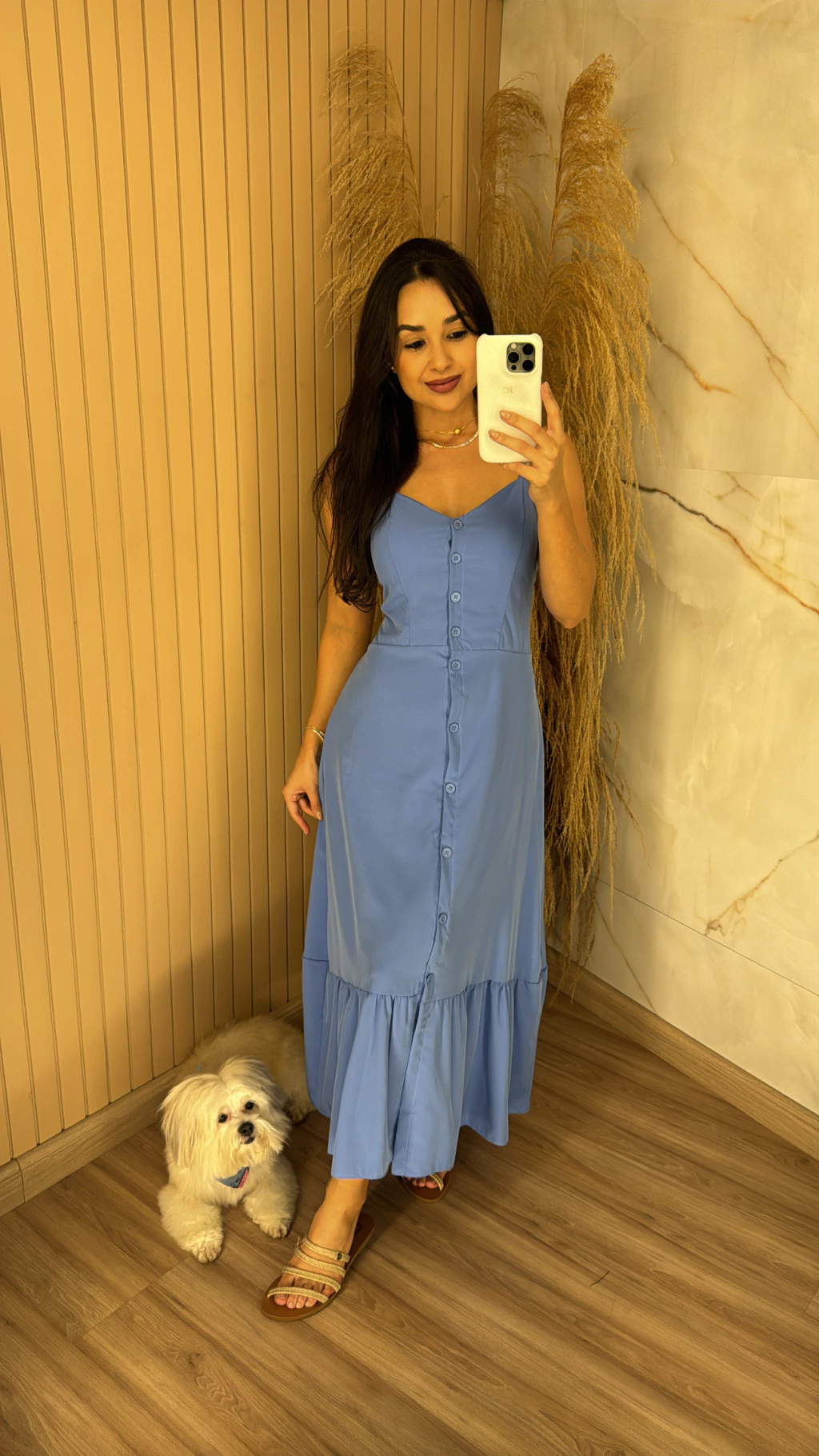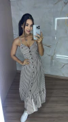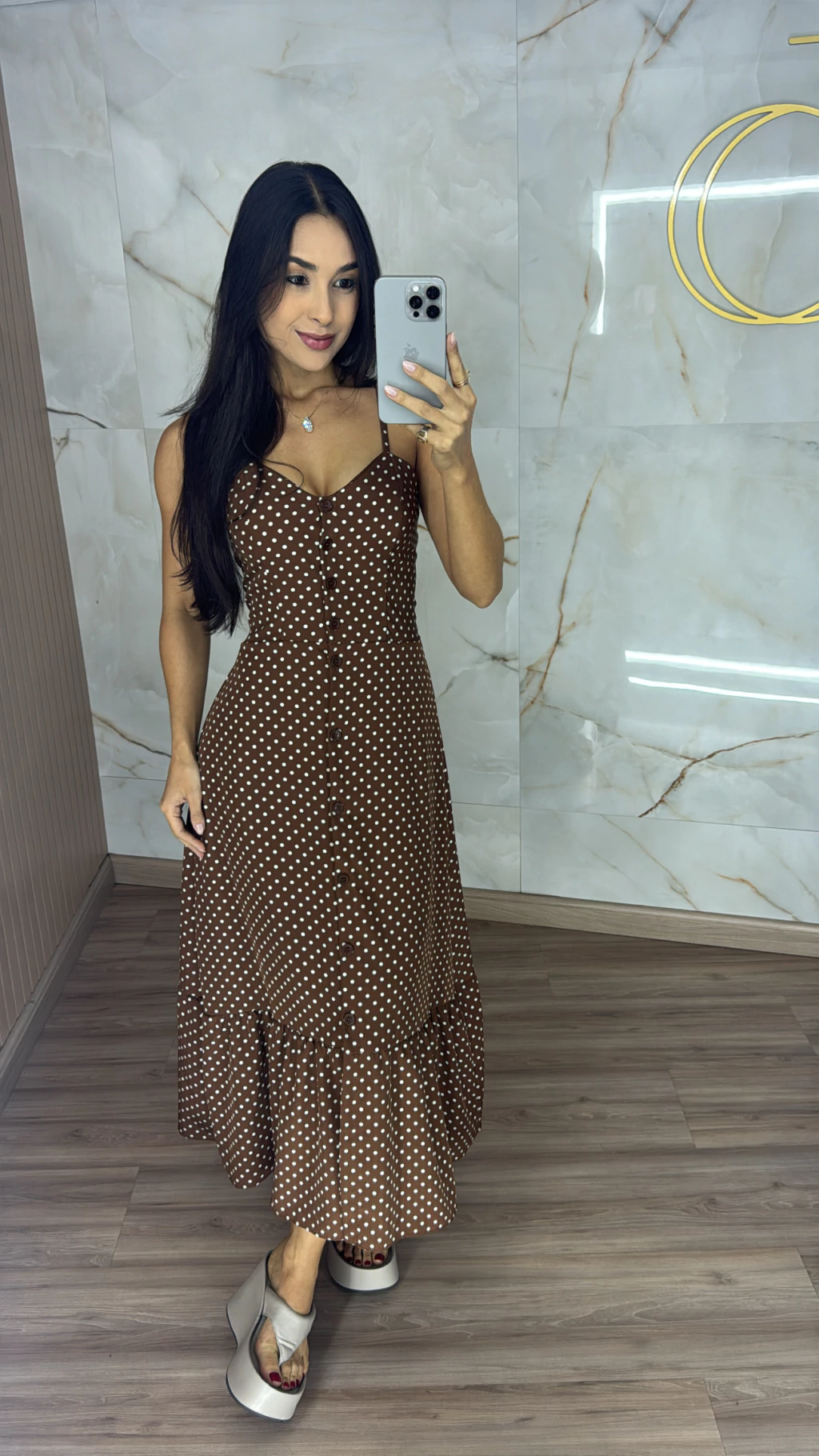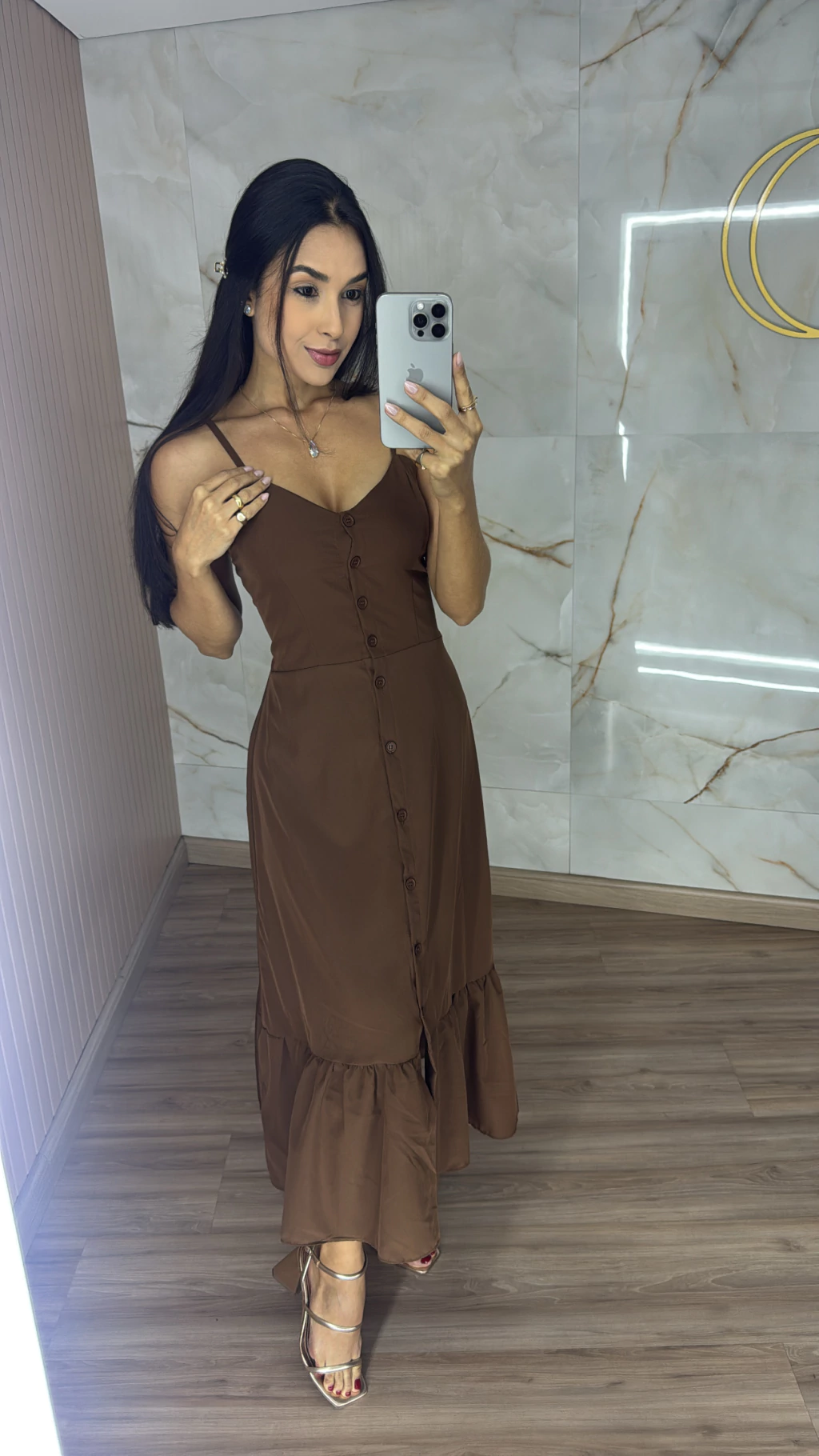 Descrição: o vestido é no tecido crepinho, modelo midi, com fechamento em botões, e alças reguláveis, contém bojo.