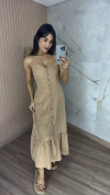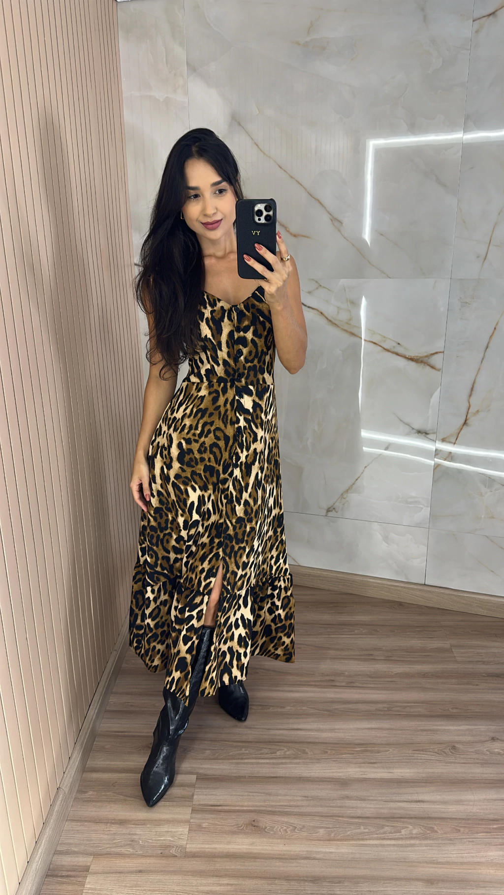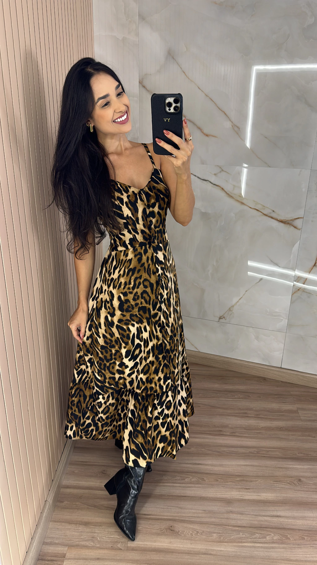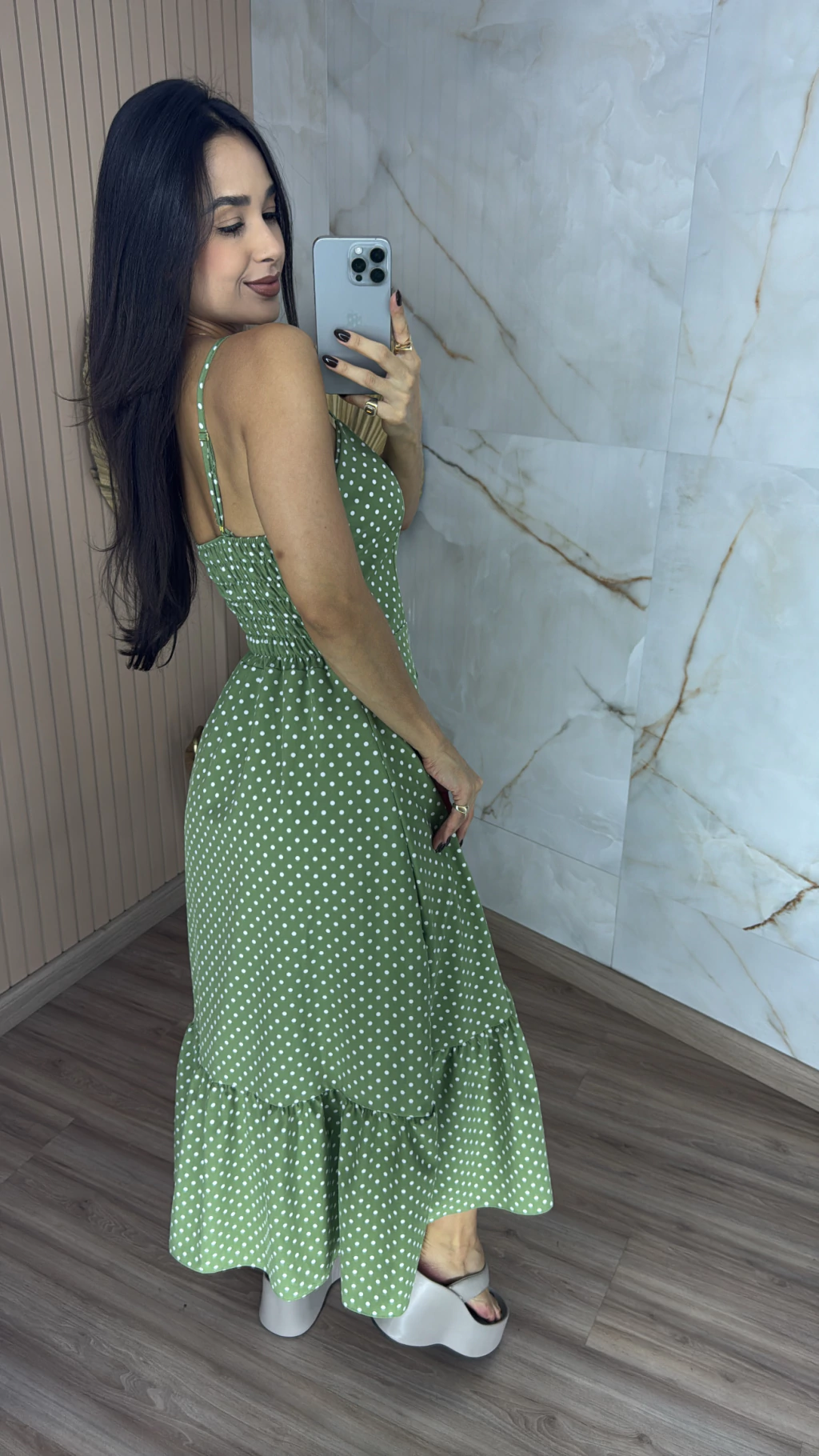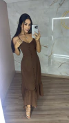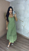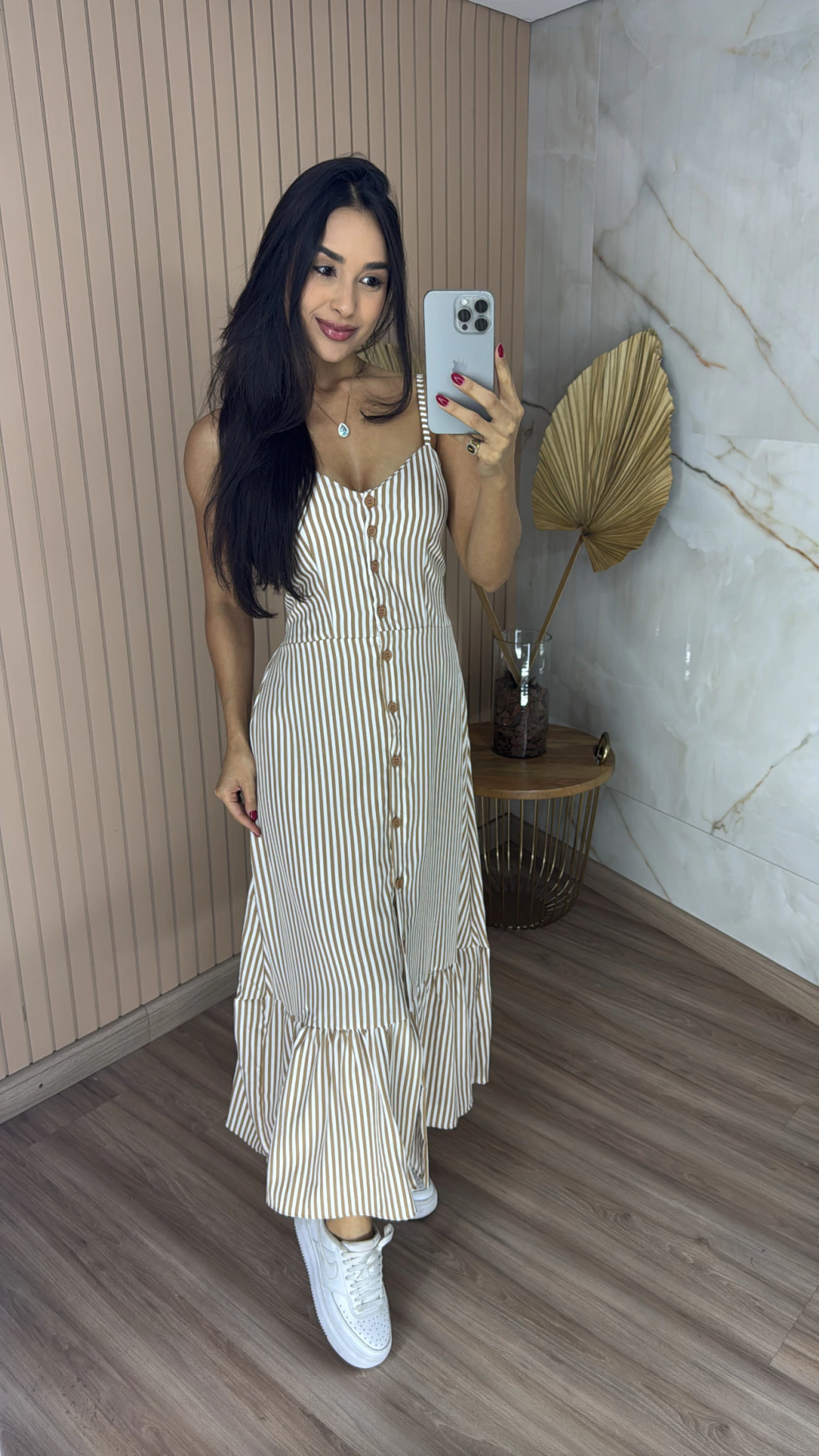 Descrição: o vestido é no tecido crepinho, modelo midi, com fechamento em botões, e alças reguláveis, contém bojo.