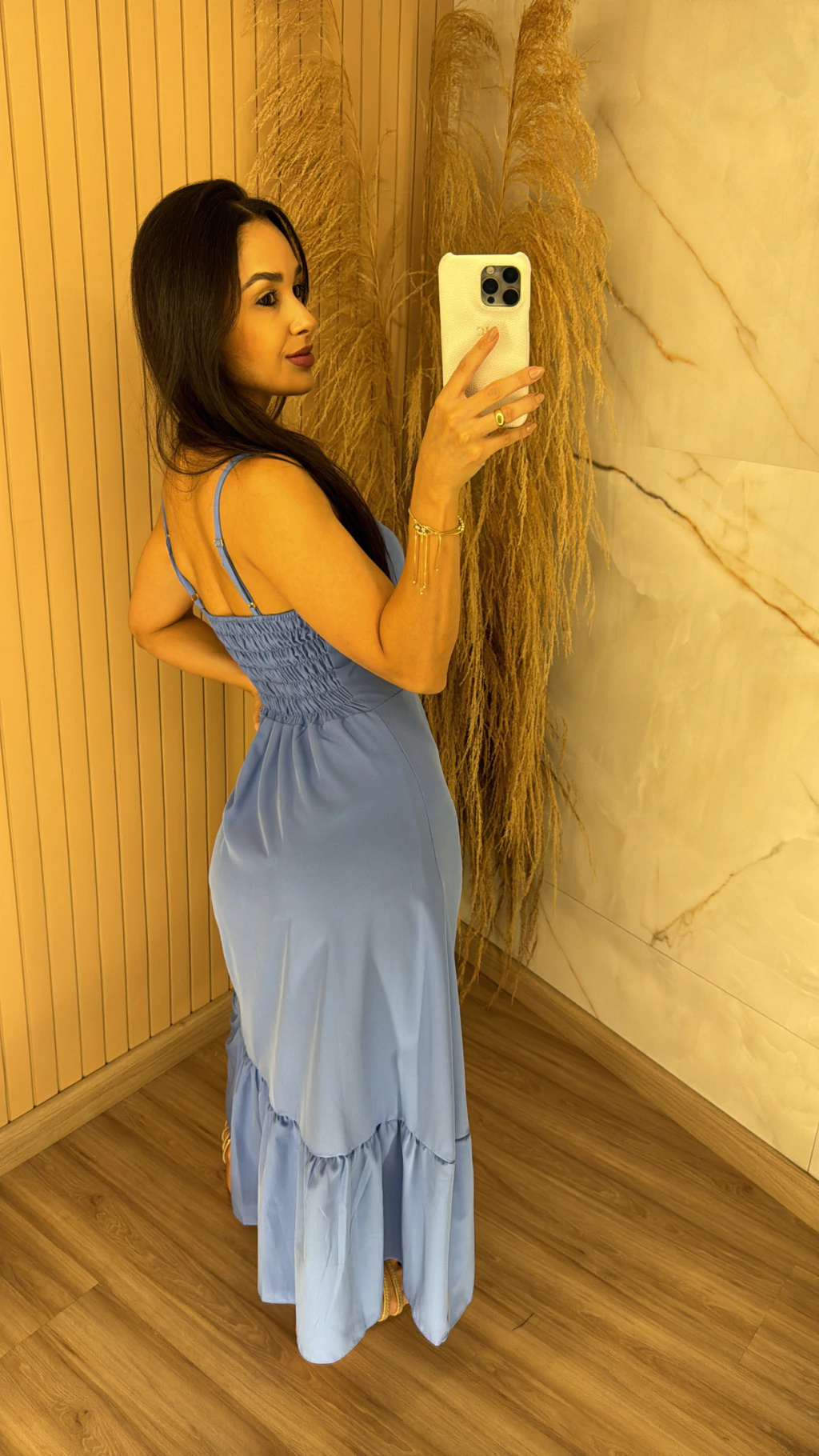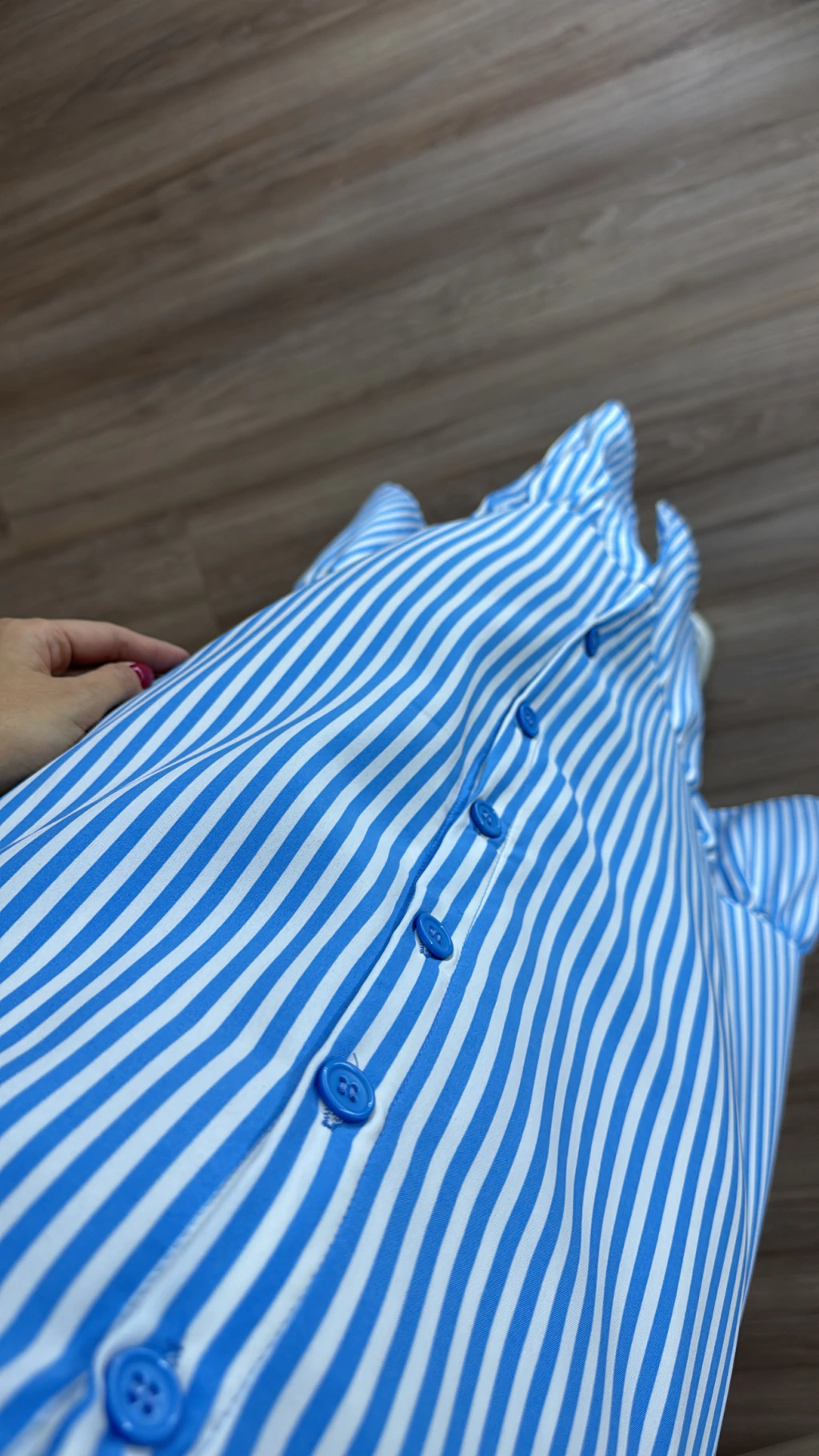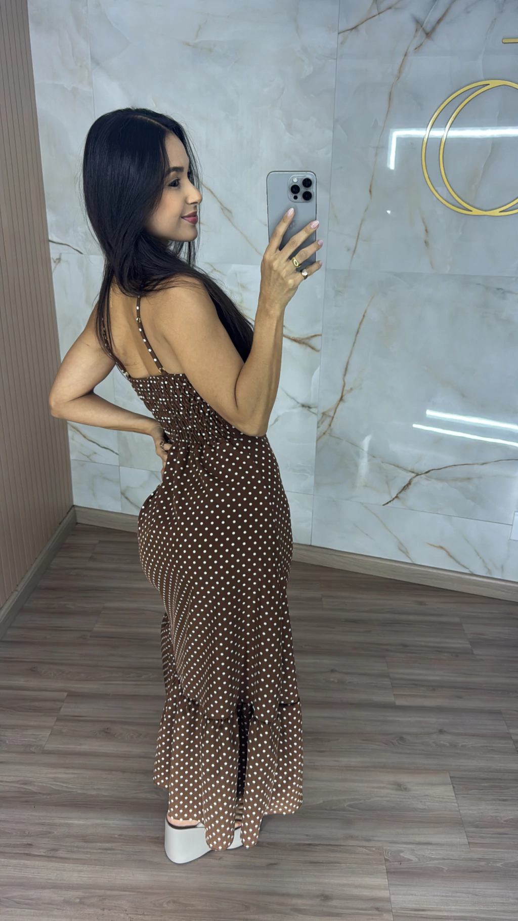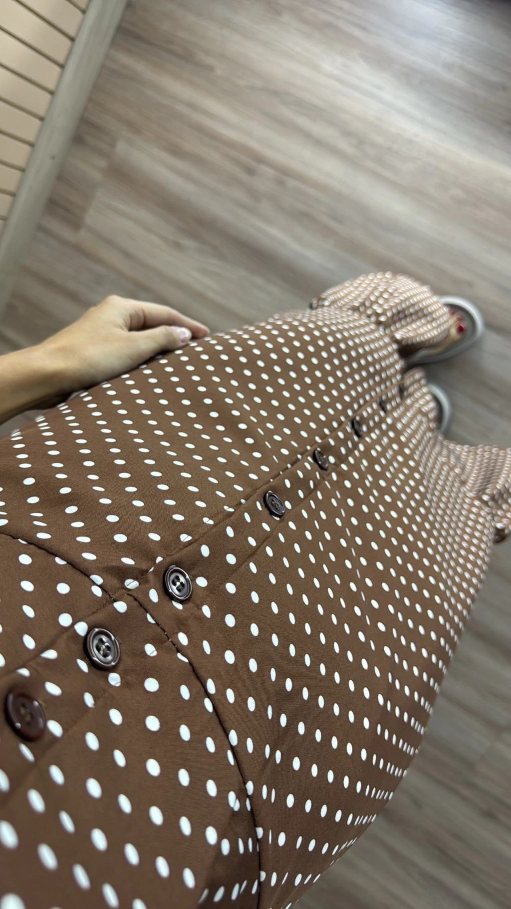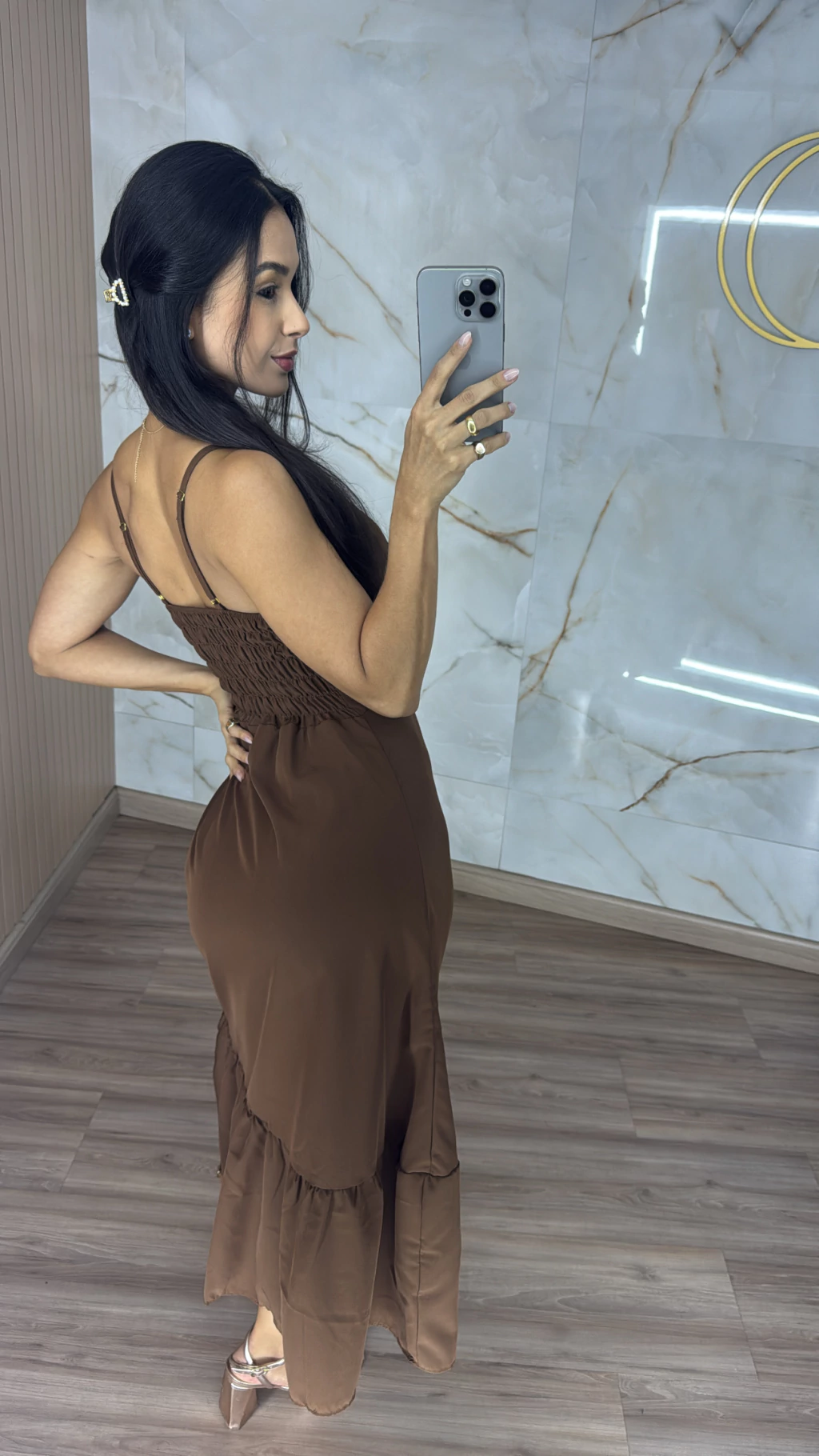 Descrição: o vestido é no tecido crepinho, modelo midi, com fechamento em botões, e alças reguláveis, contém bojo.