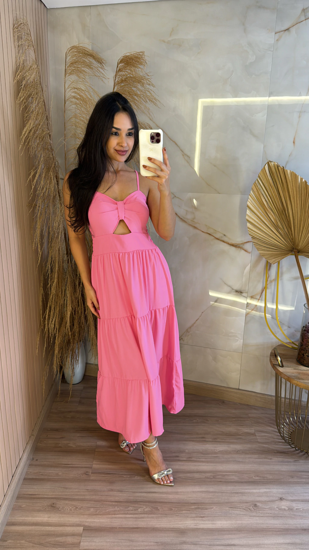 O Vestido em crepe, contém alças reguláveis, possui bojo e lastex nas costas.