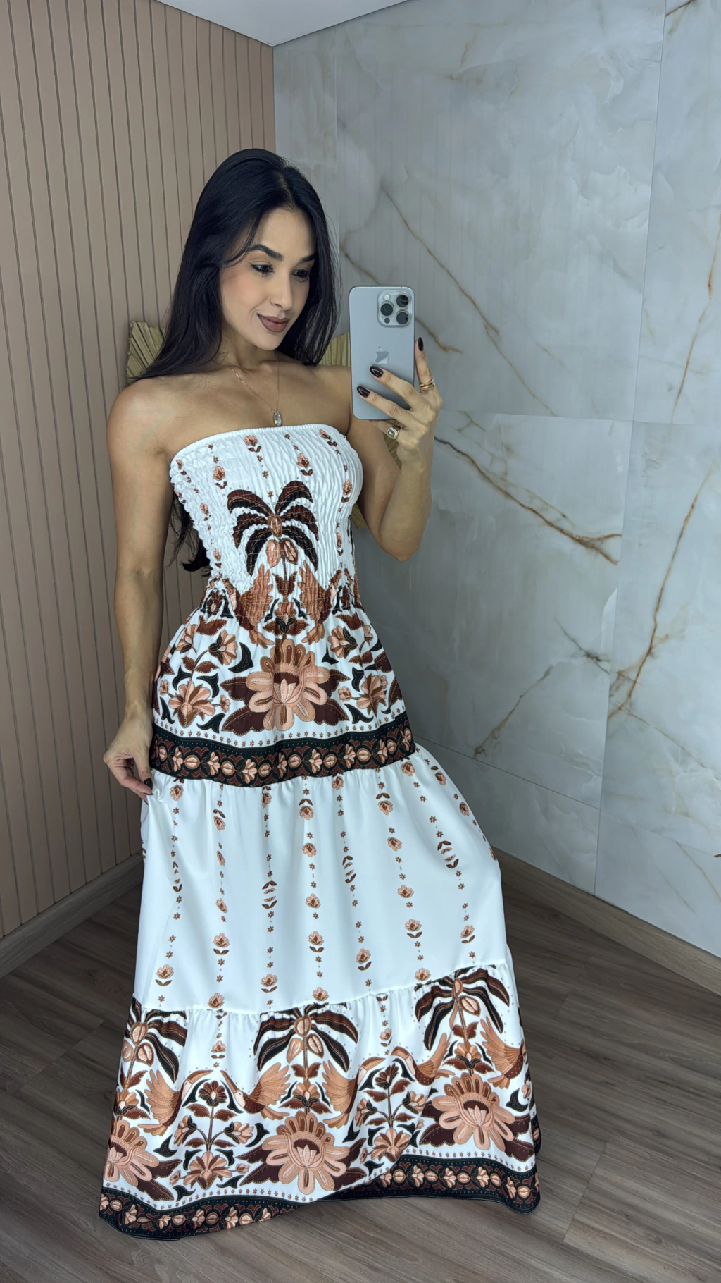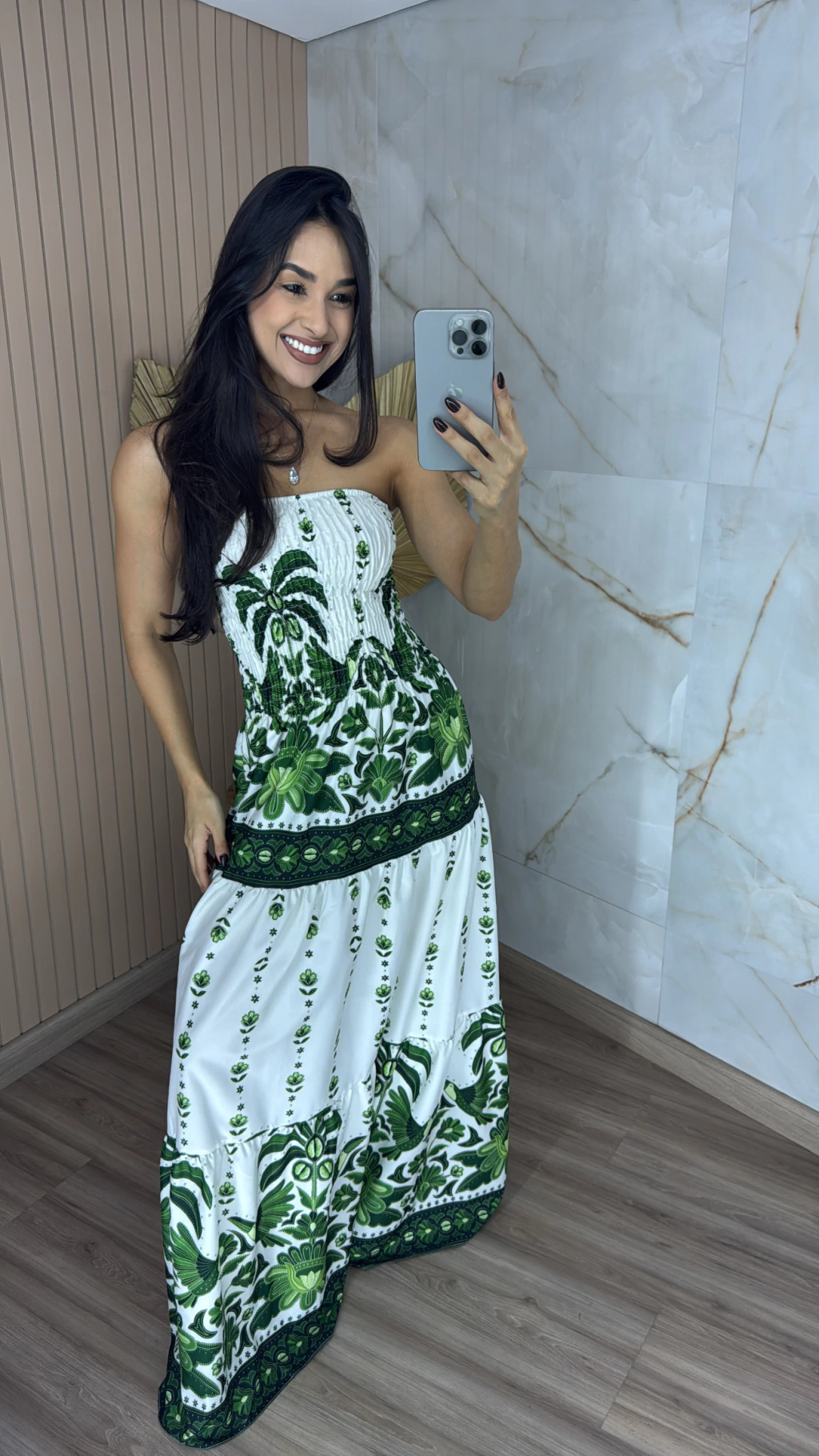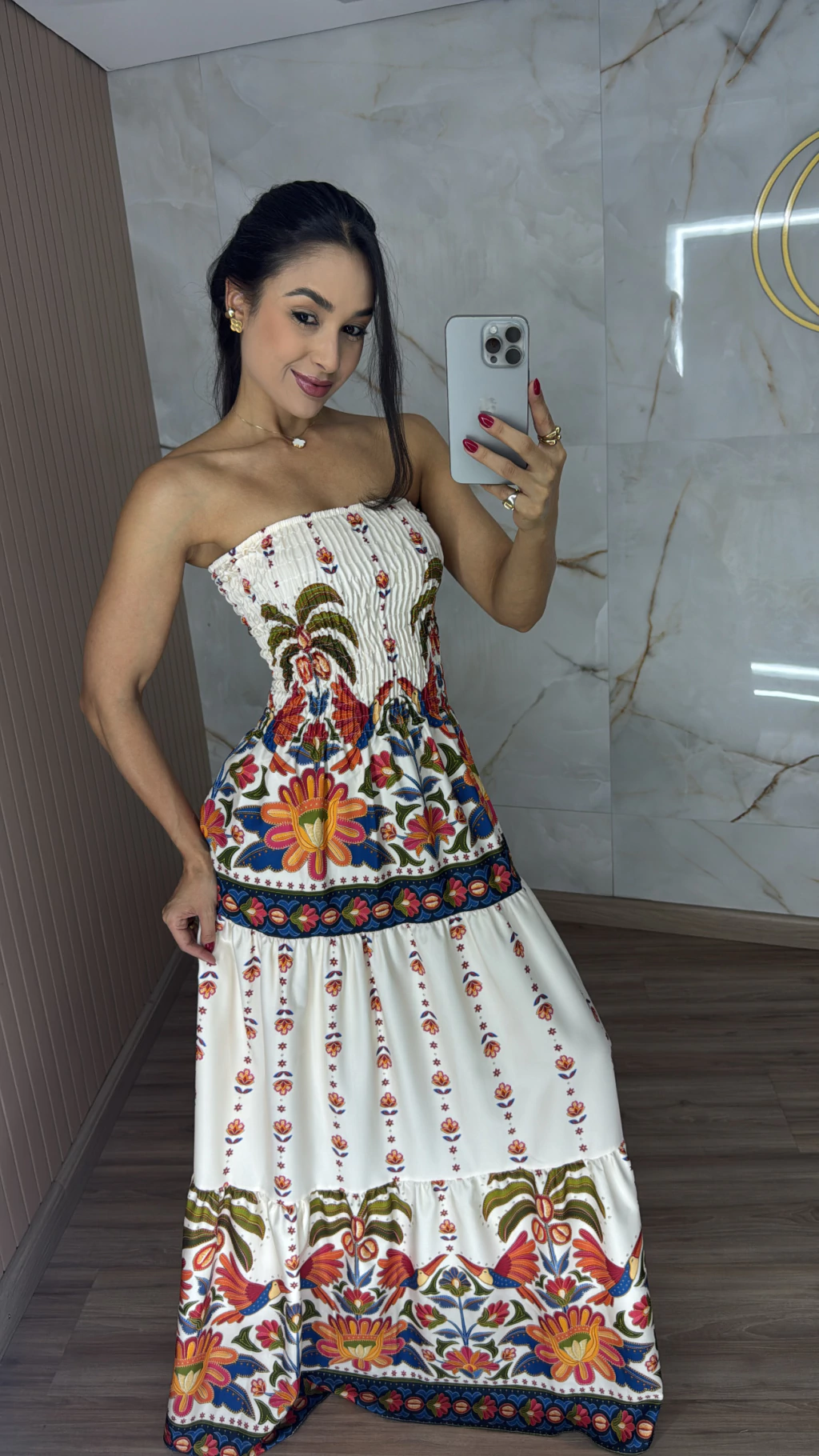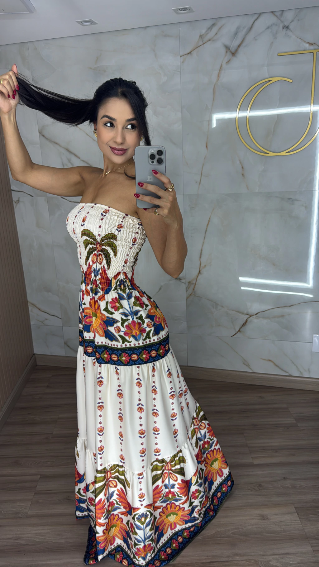 Descrição: Esse vestido é a escolha perfeita para mulheres que amam conforto aliado a elegância. Confeccionado em tecido crepinho leve e fluido, ele proporciona um caimento impecável, valorizando o corpo de forma natural. O destaque fica por conta do lastex no busto, que garante excelente ajuste ao corpo e proporcionando segurança e liberdade de movimentos. O modelo sem alças deixa os ombros a mostra, trazendo um toque de sensualidade e frescor, perfeito para dias quentes ou eventos ao ar livre. O comprimento longo traz sofisticação, enquanto a estampa vibrante com detalhes florais oferece charme e autenticidade ao visual. Versátil, essa peça transita com facilidade entre o look do dia a dia, uma saída estilosa para a praia ou um visual mais elaborado para encontros especiais.
