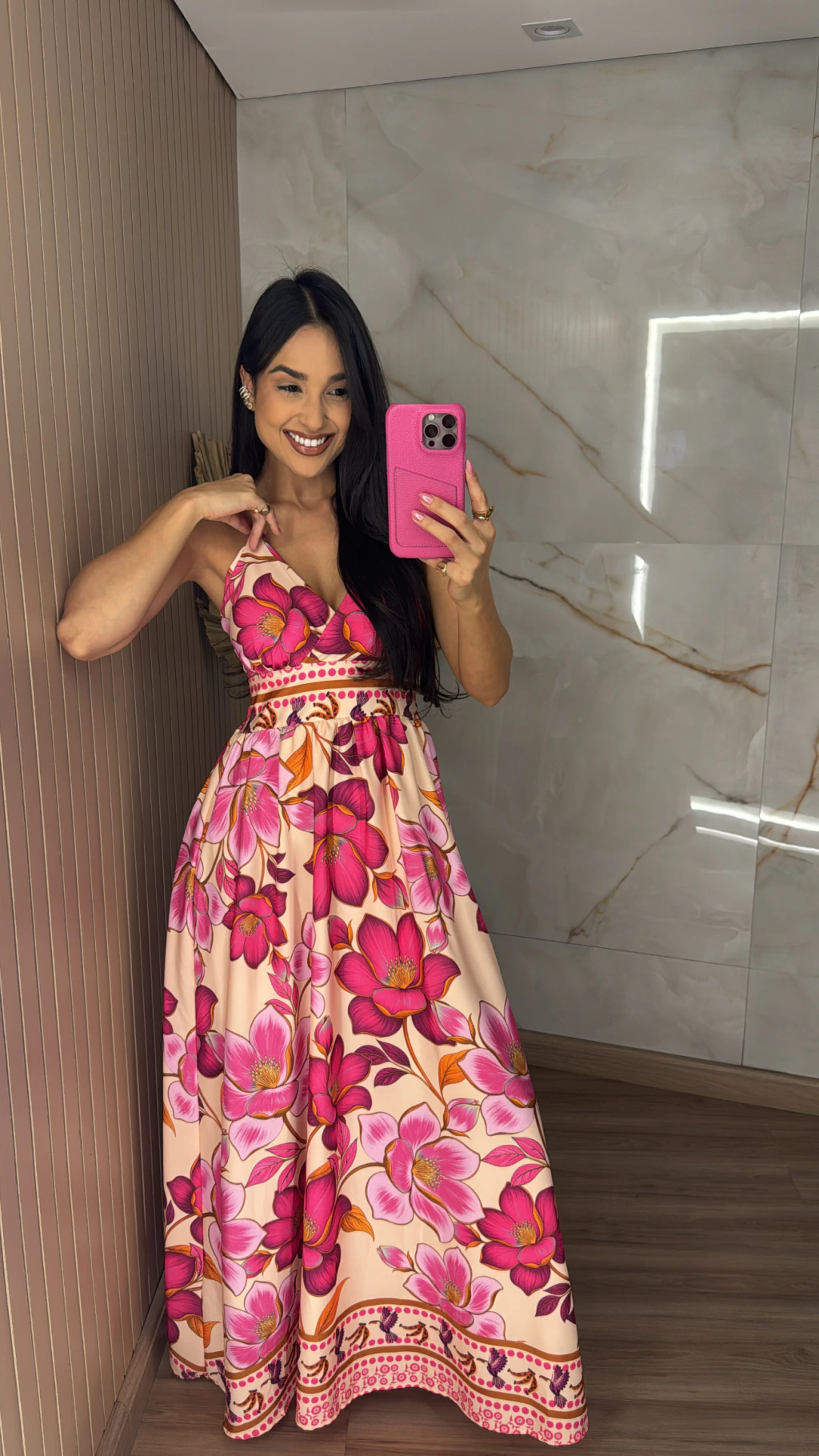 Confeccionado em crepinho, o vestido tem um toque suave e uma leveza que acompanha seus movimentos com graça. O comprimento longo é um clássico atemporal que confere elegância e imponência, enquanto o bojo embutido garante sustentação e um ajuste confortável.