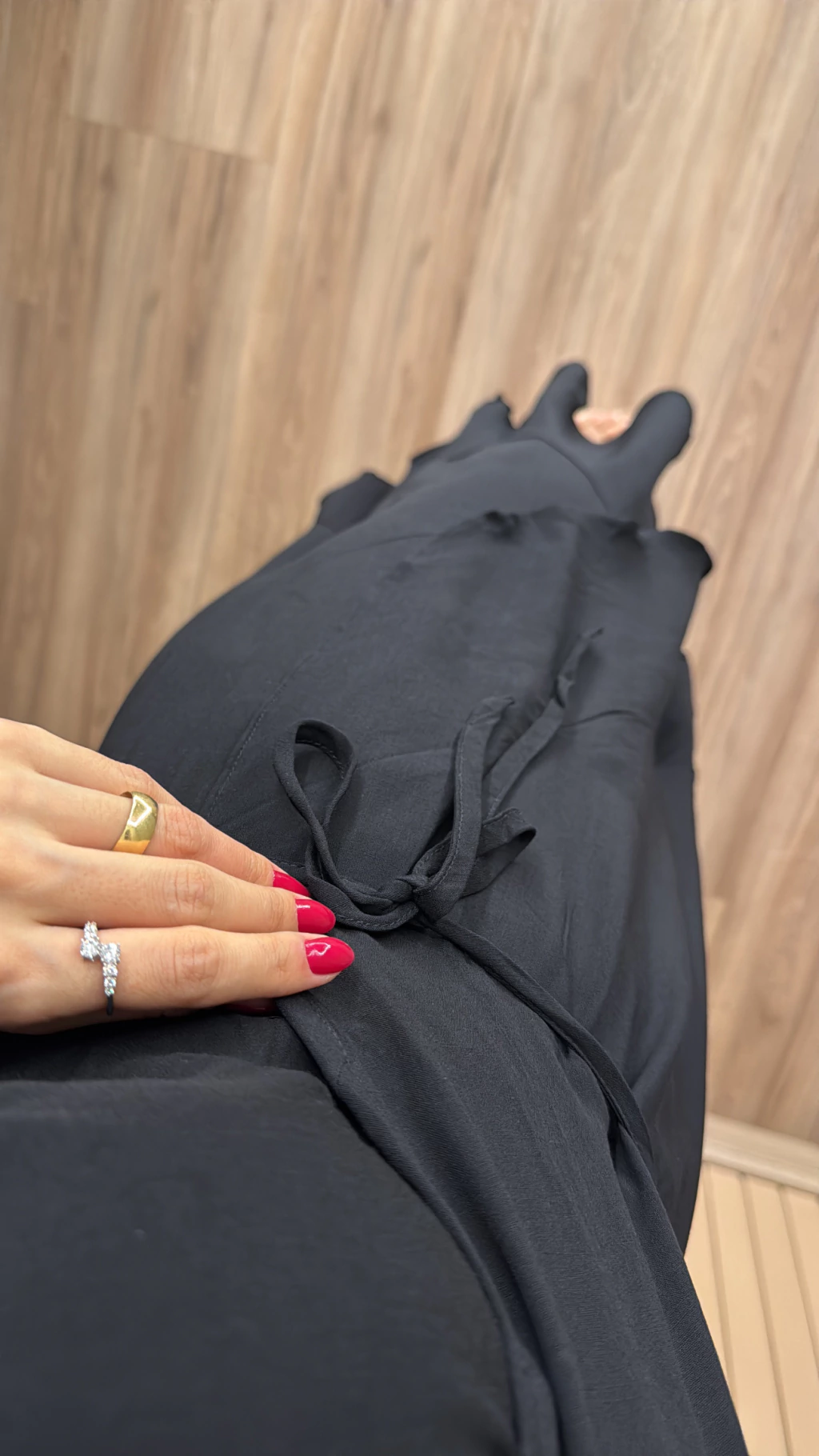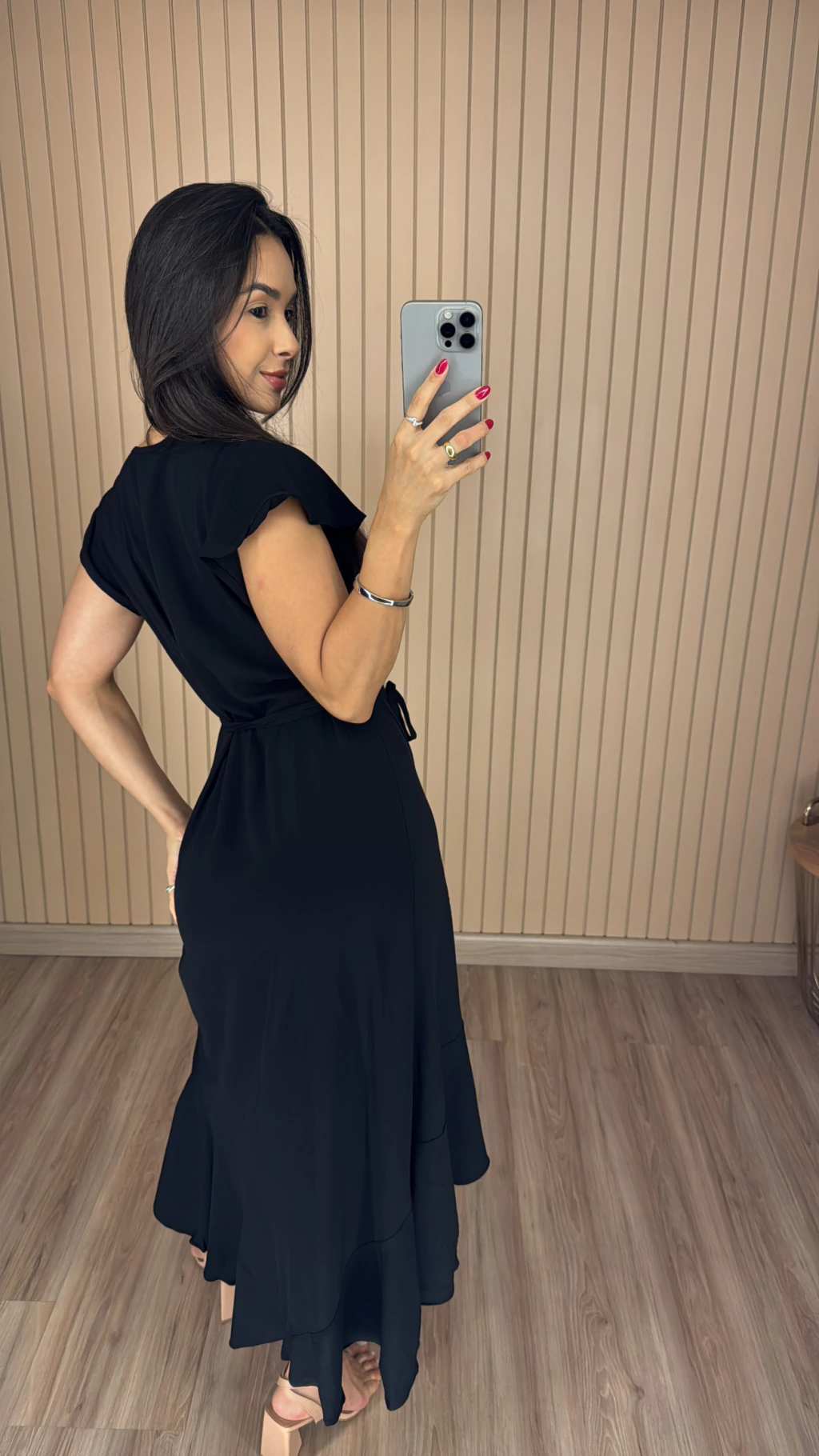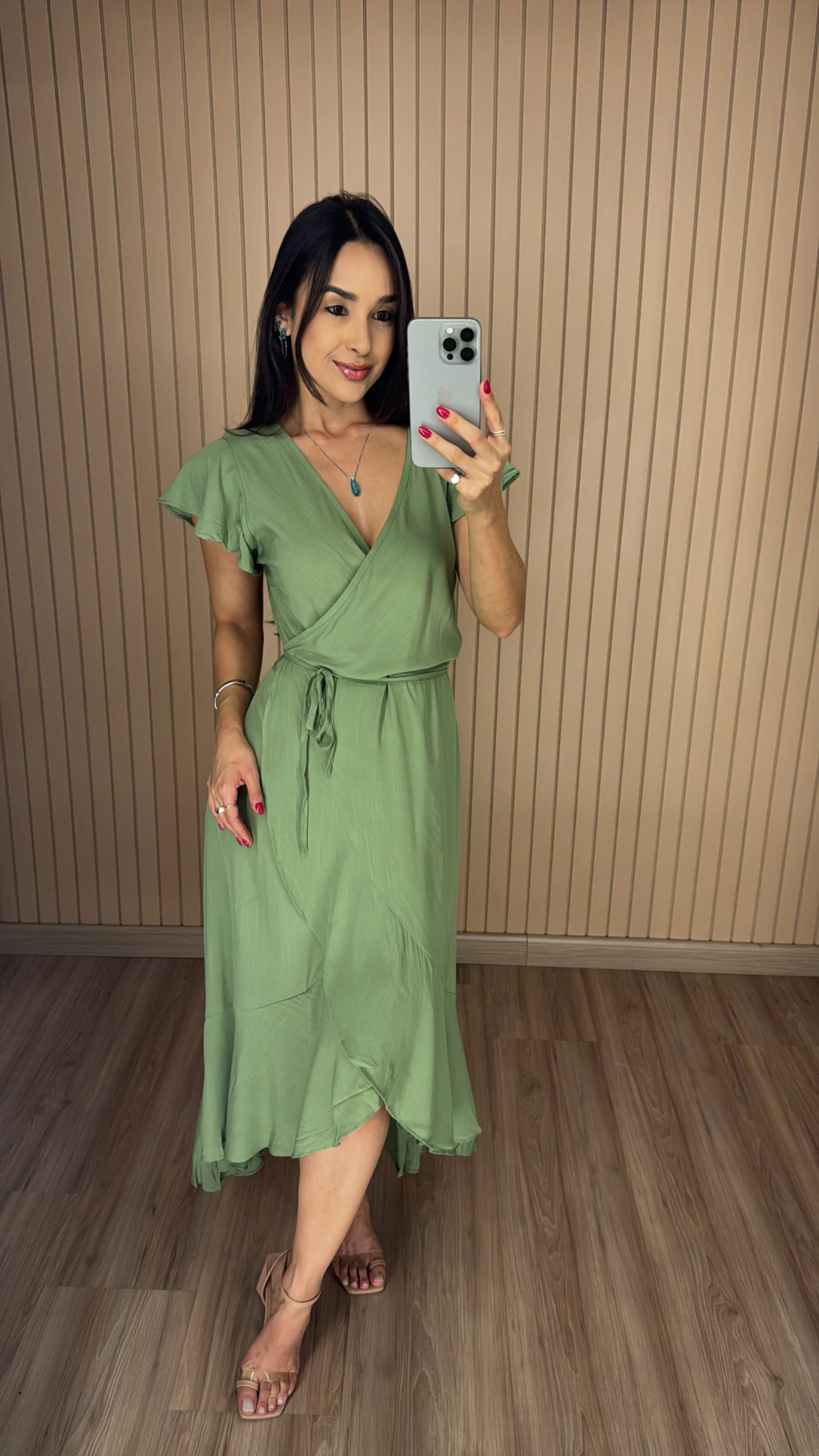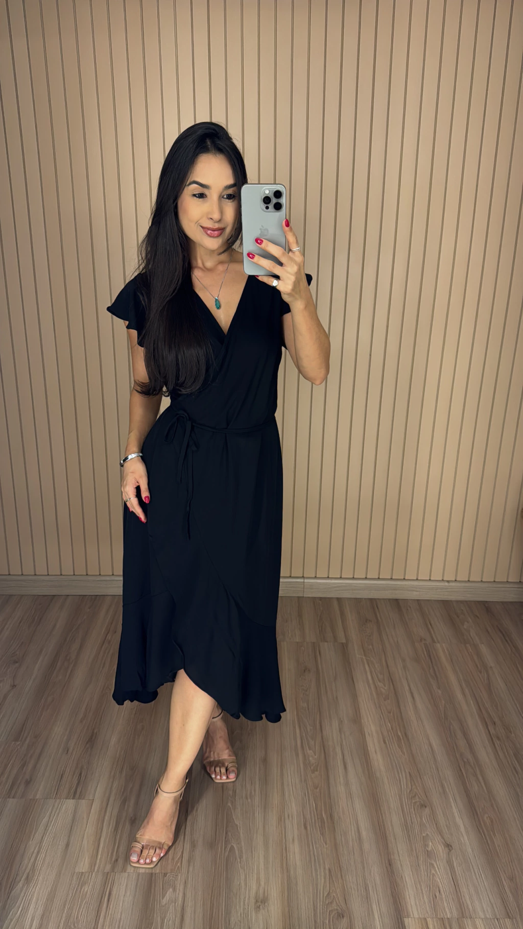 Descrição: O vestido envelope possui forro em seu comprimento e babados na barra. É um modelo leve e se adapta ao corpo, pois é regulável.