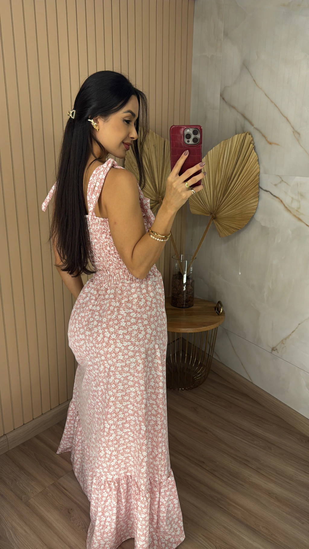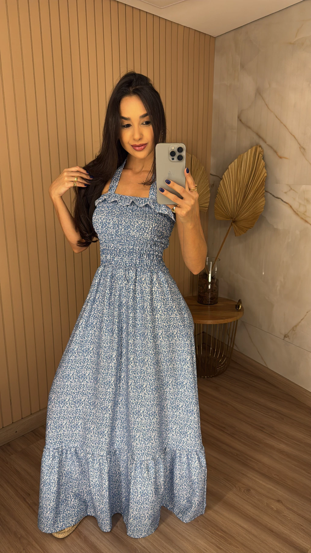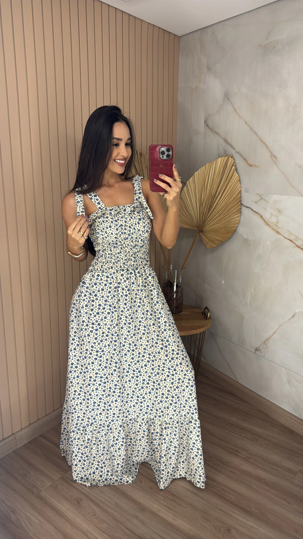 Combine o seu Vestido Crepinho Longo Estampado com rasteiras ou sandálias de salto fino para um look romântico e elegante. Para uma produção mais descontraída, aposte em sapatilhas ou tênis brancos. Esta peça é a escolha certa para quem busca praticidade, conforto e um visual que transita facilmente entre o dia e a noite.