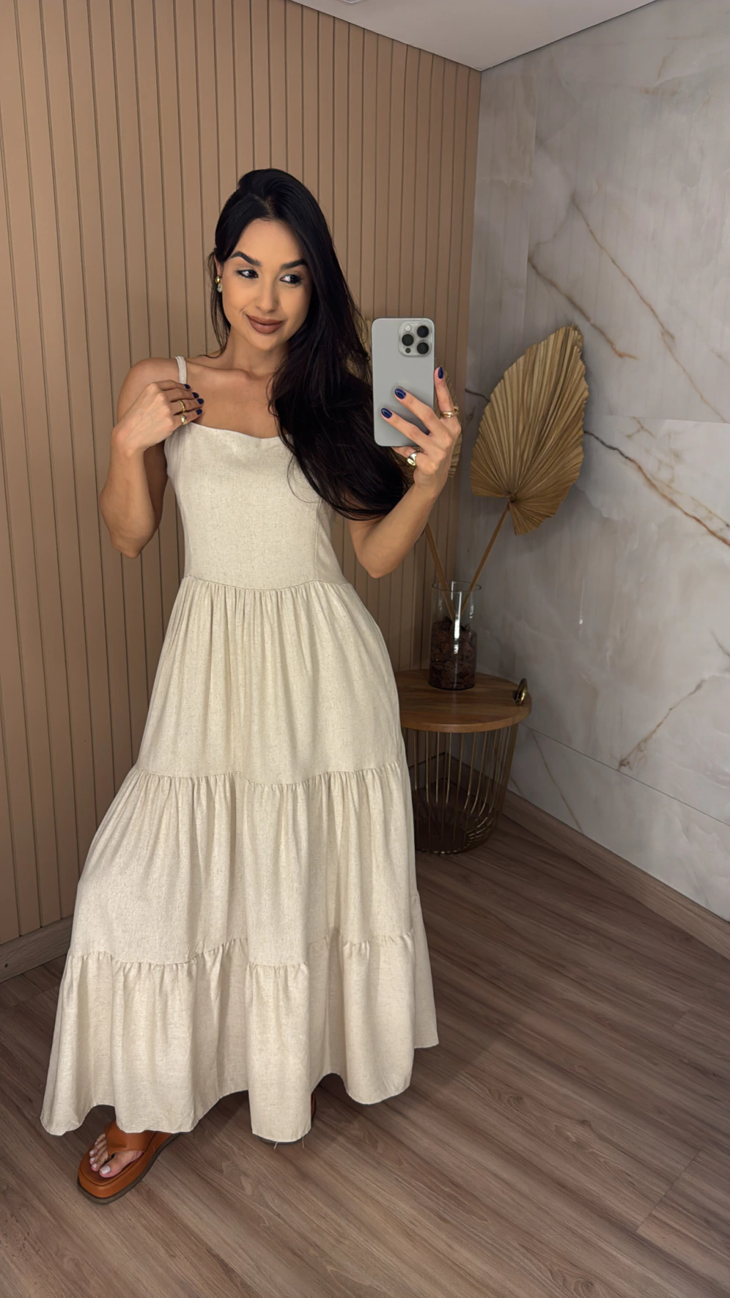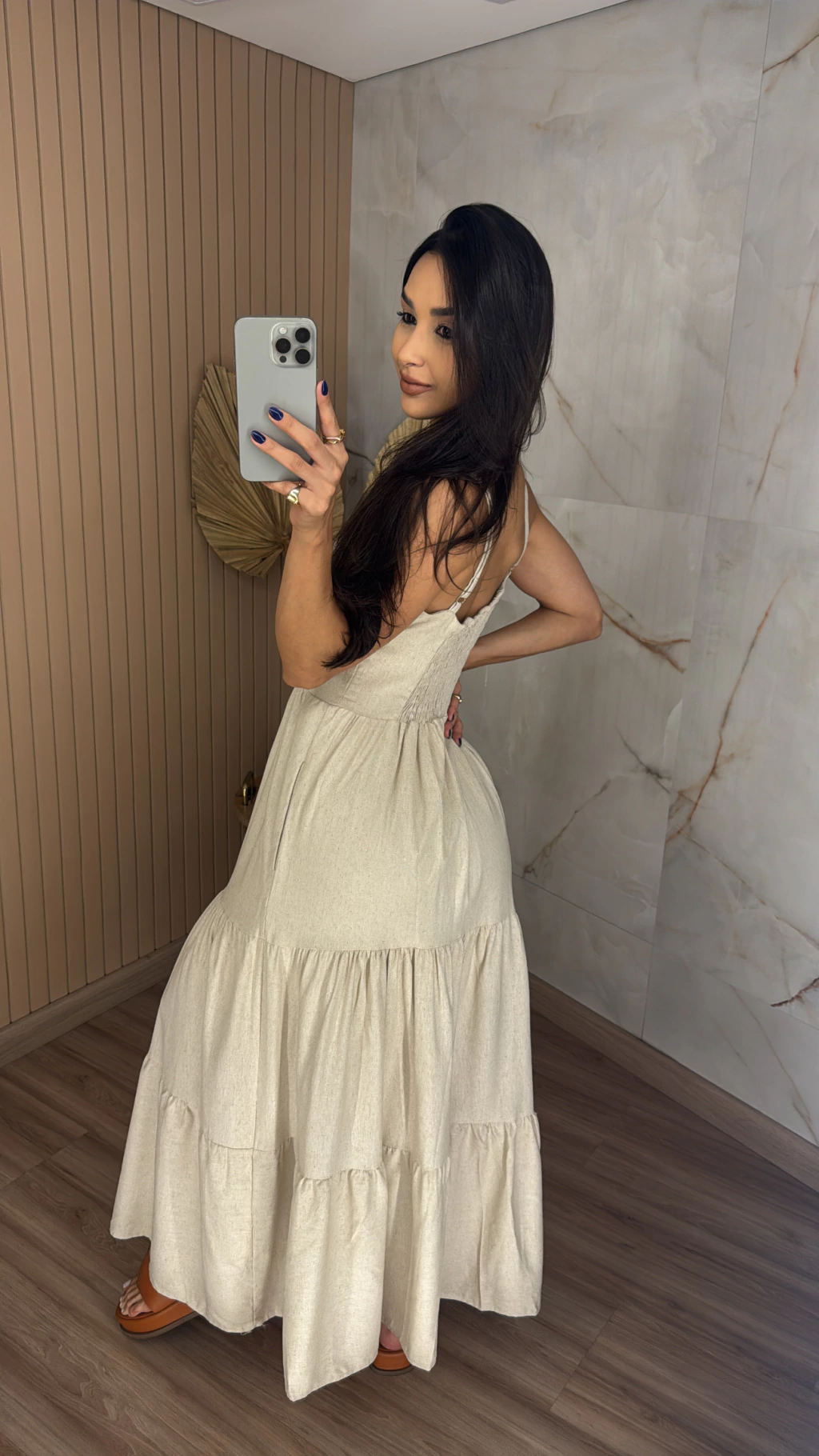 Confeccionado em linho, o vestido tem um toque macio e um caimento natural que se adapta ao seu corpo com suavidade, no comprimento longuete e forrado. As alças finas e reguláveis permitem um ajuste perfeito, enquanto o lastex nas costas garante o conforto e valoriza a sua silhueta de forma sutil.