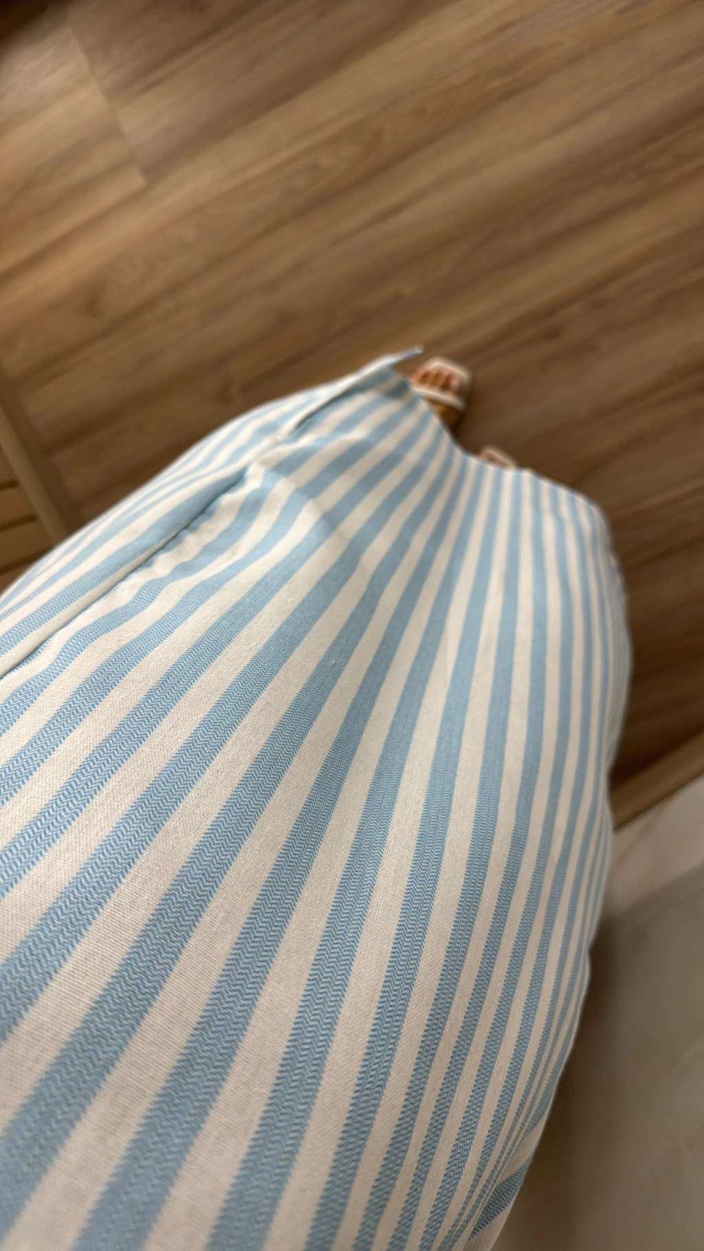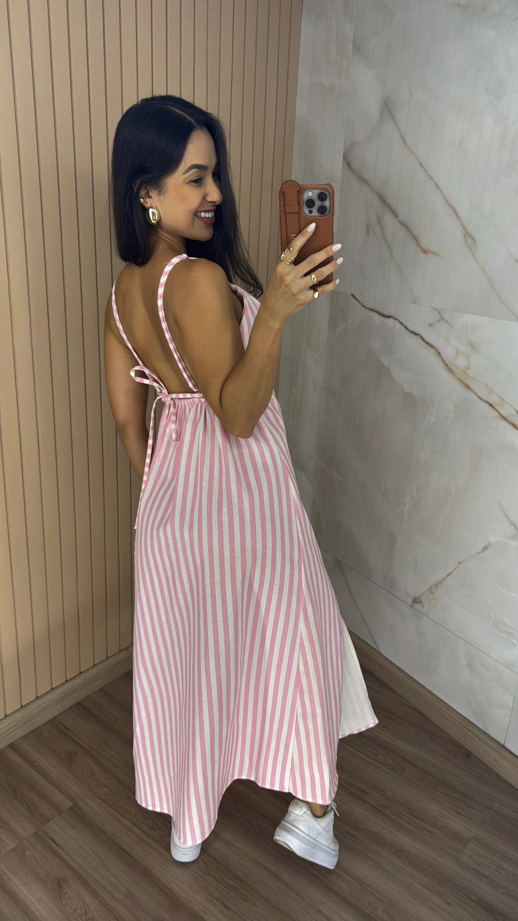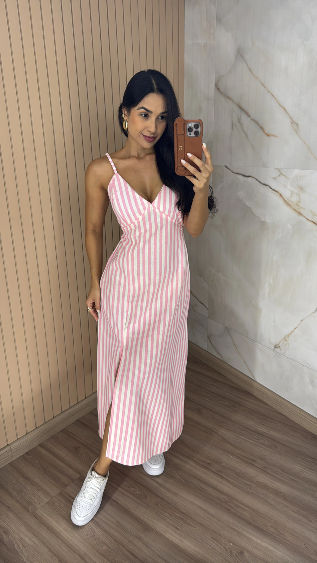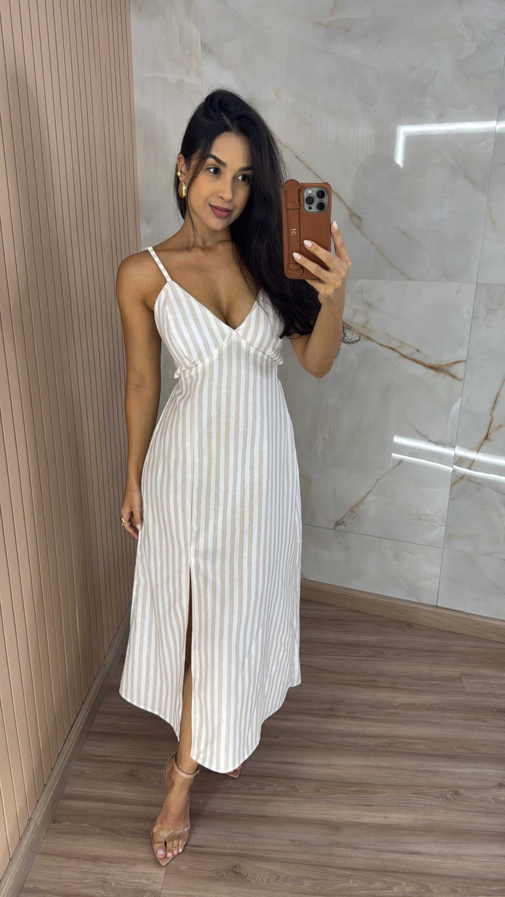 Descrição: Vestido listrado, no tecido linho, contém alças finas e reguláveis, bojo, recorte em V, fenda lateral, amarração e lastex nas costas